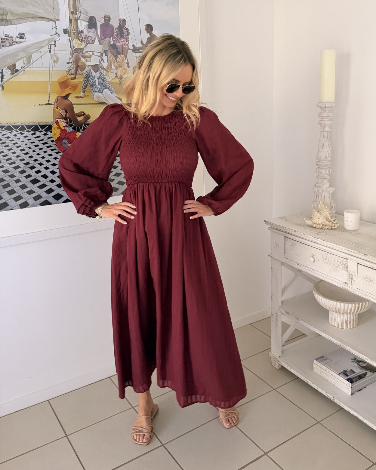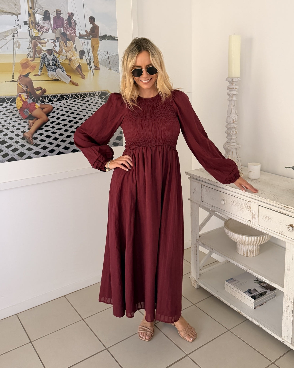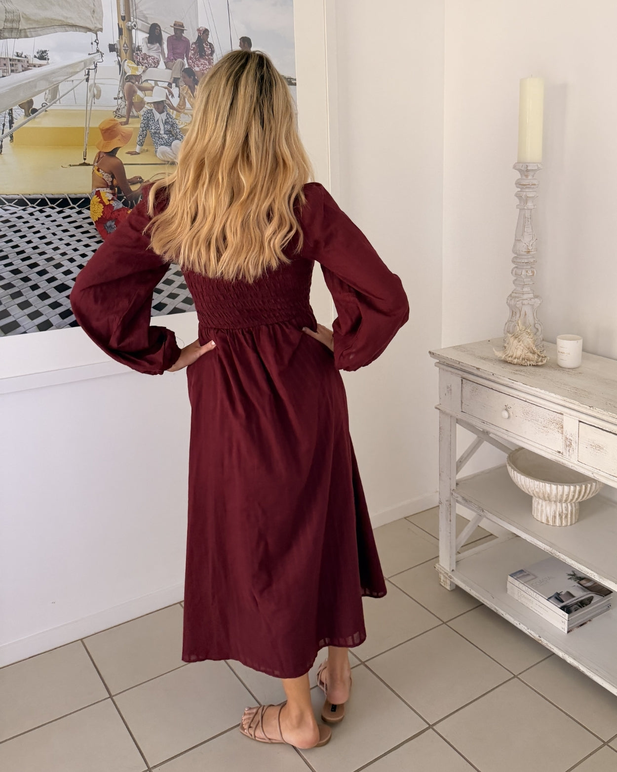 The Iolana is distinguished by its beautifully shirred bodice that creates a tailored look while offering maximum comfort. The deep wine hue provides a sophisticated depth that transitions perfectly from golden hour to moonlight.