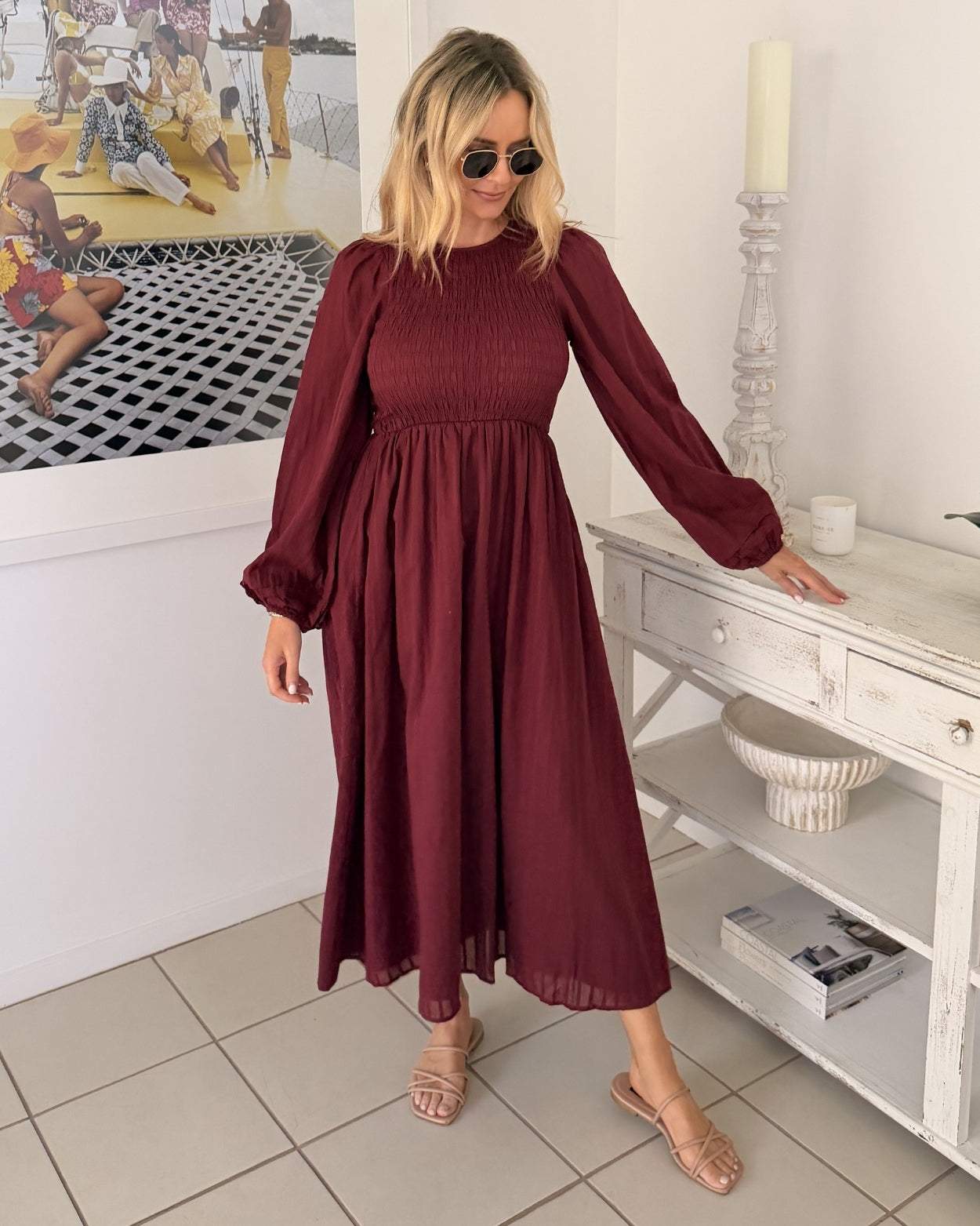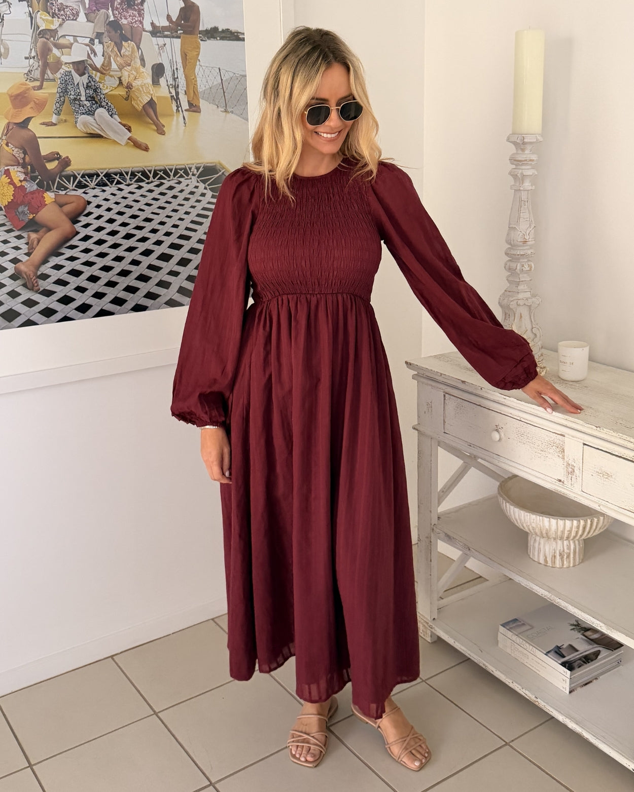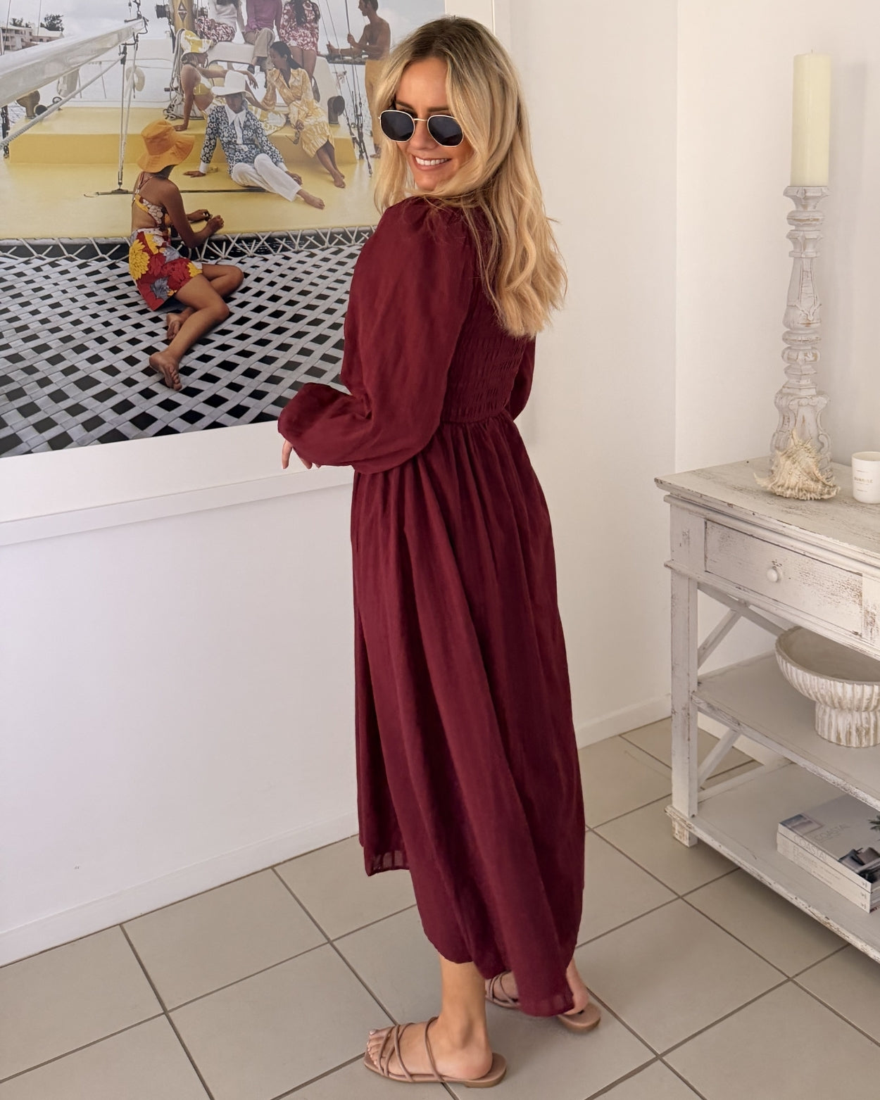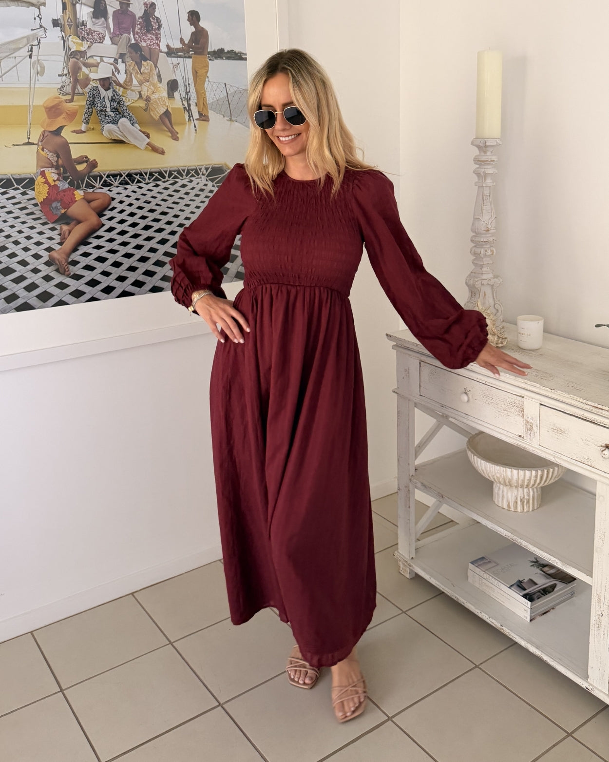 The Iolana is distinguished by its beautifully shirred bodice that creates a tailored look while offering maximum comfort. The deep wine hue provides a sophisticated depth that transitions perfectly from golden hour to moonlight.