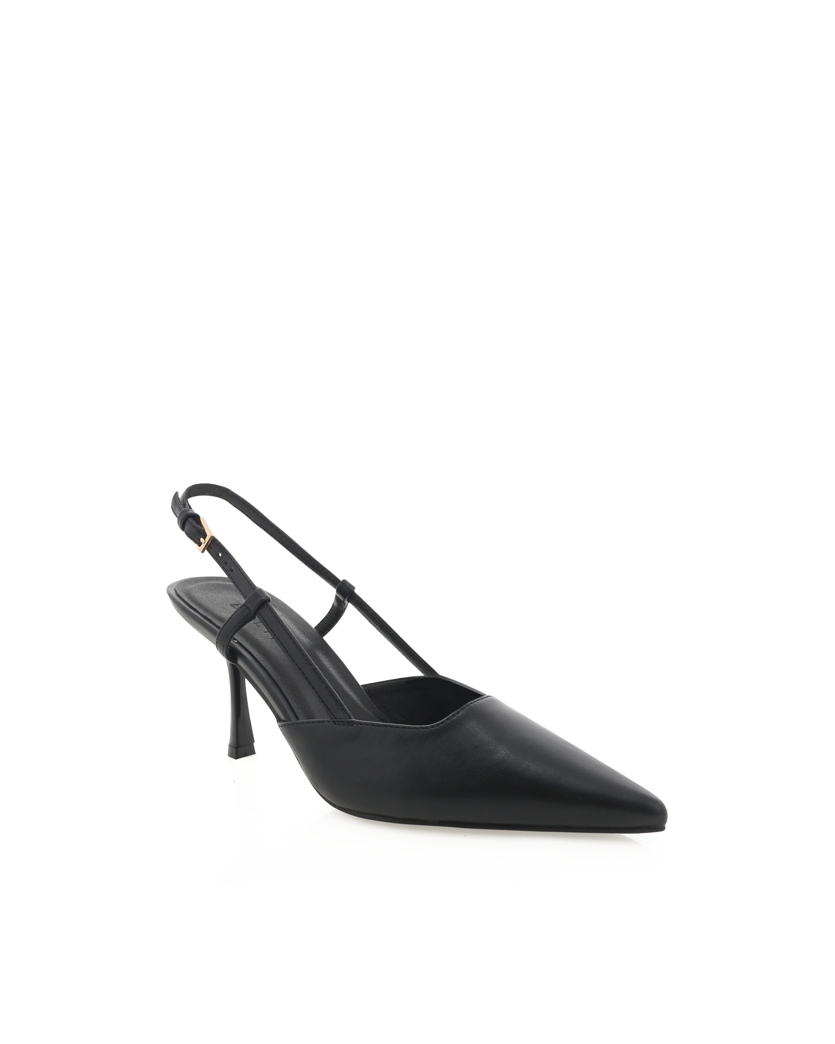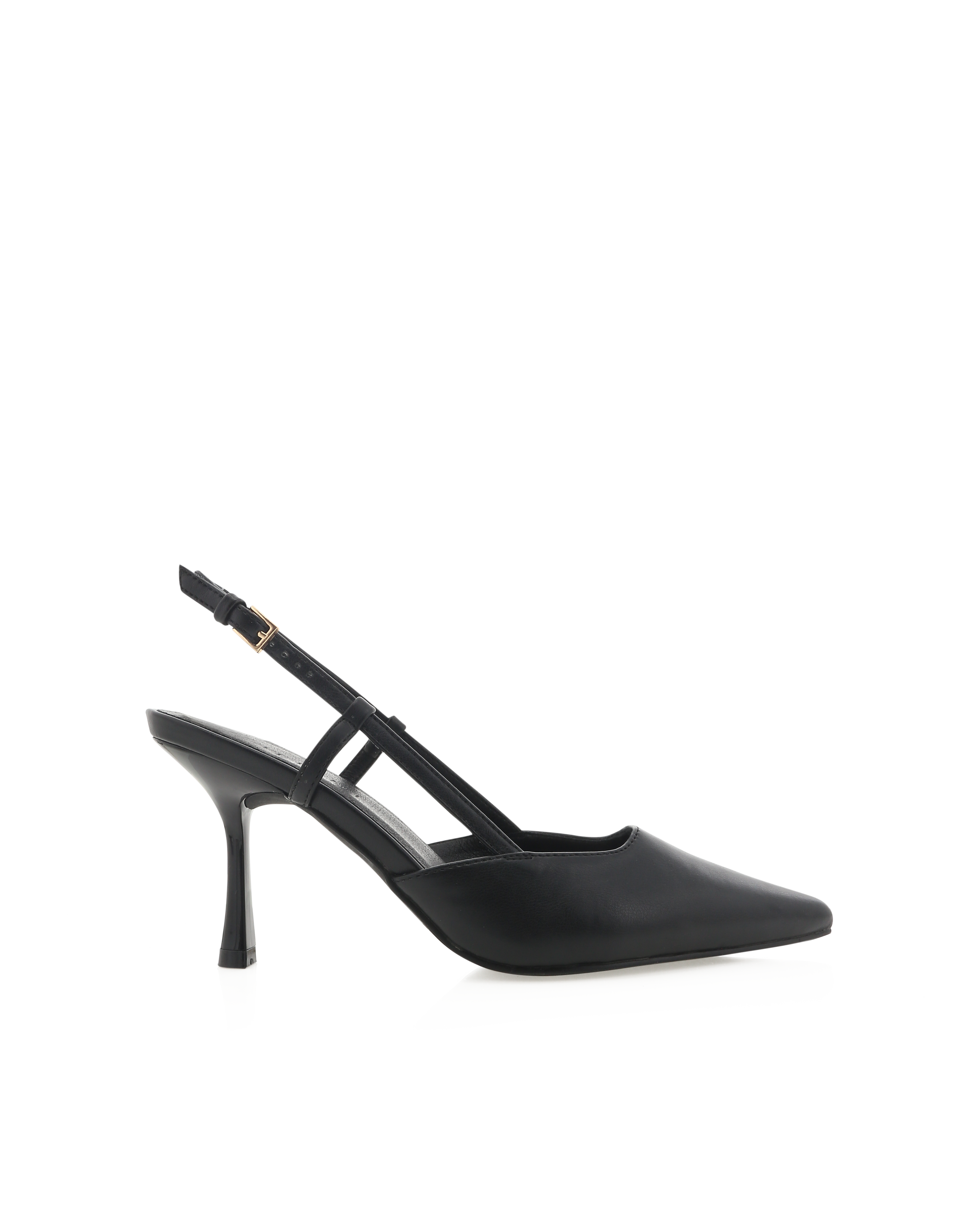 - Key Features: Mid, kicked in stiletto heel. Closed pointed toe. Court style upper. Sling back ankle strap with adjustable buckle fastening. Exposed heel counter.