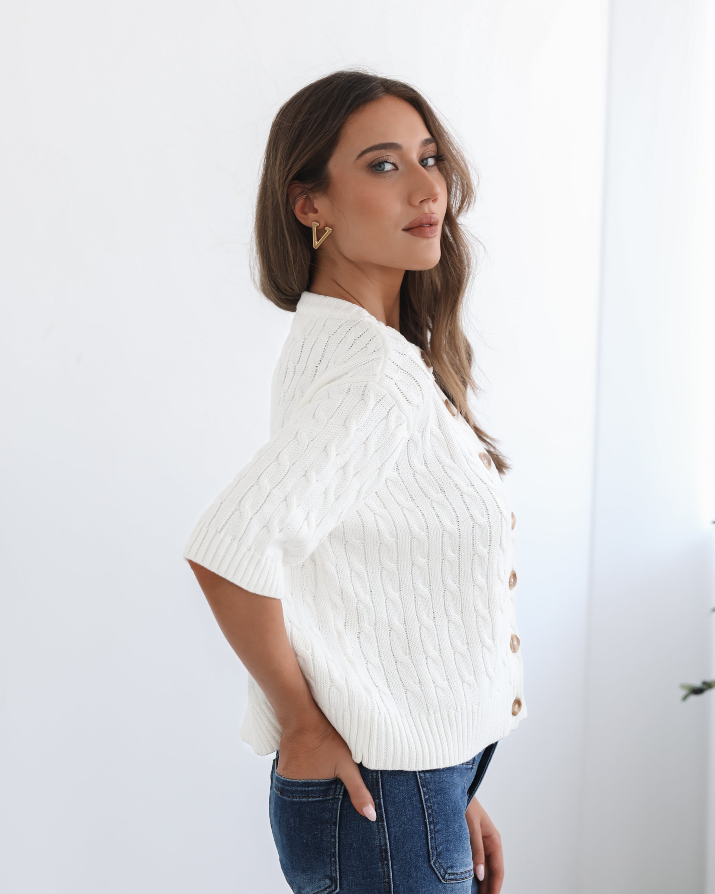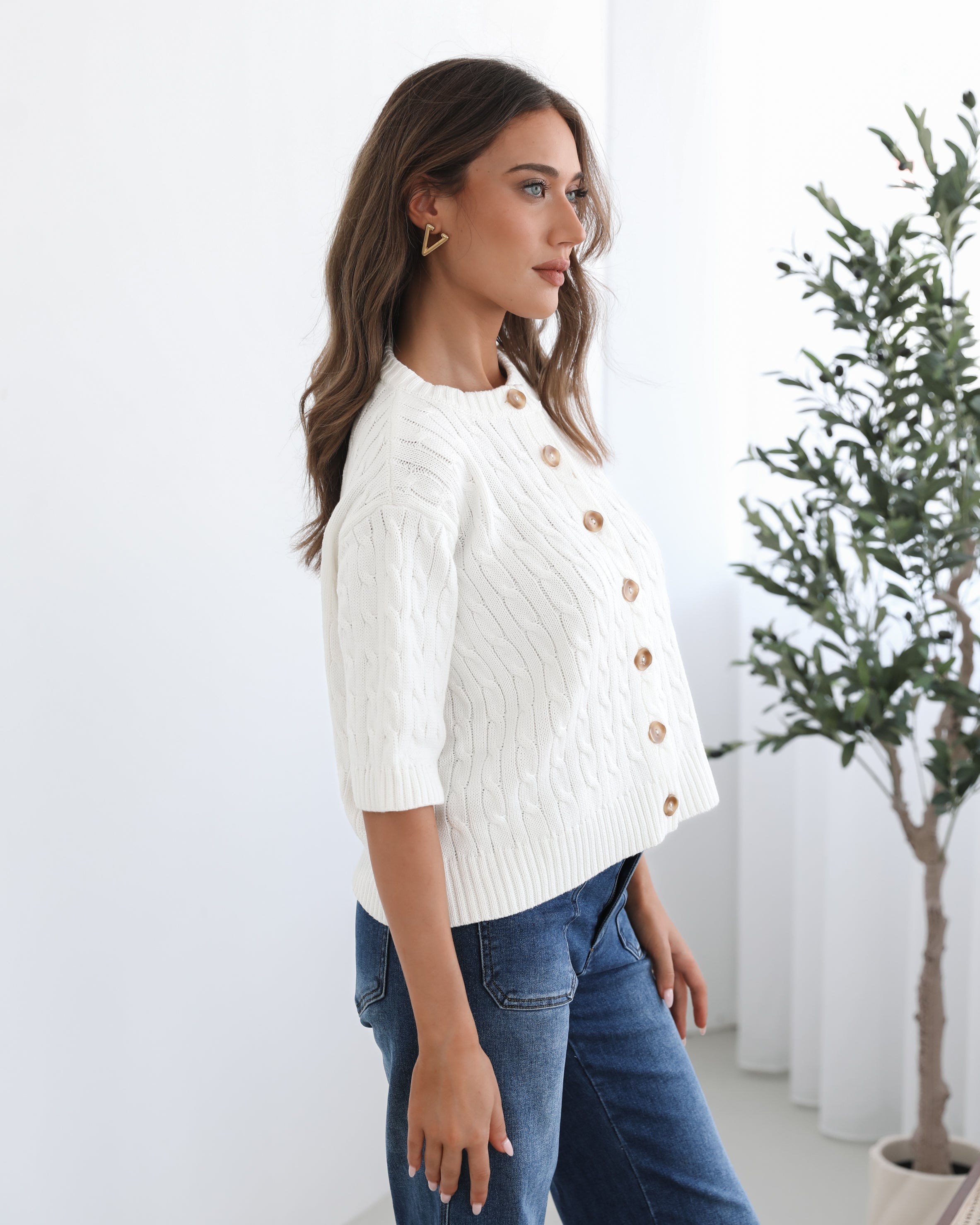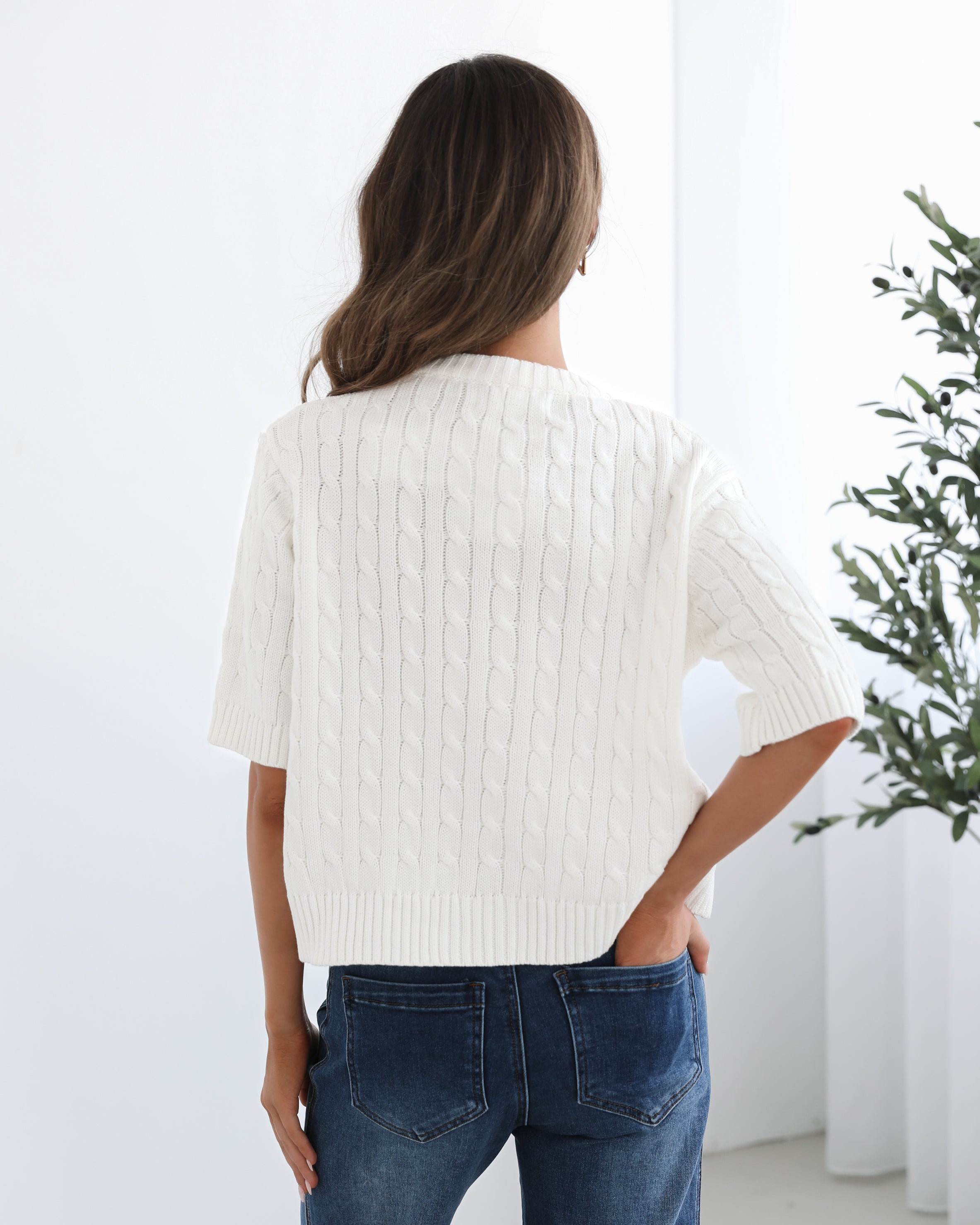 Our Wynter Knit Top comes in a white colour. Bringing a refreshing, minimalist charm to your outfit, this transseasonal piece features a round neckline, elbow length sleeves, centre-front buttons and relaxed fit. Keep it sleek with a tailored blazer and trousers for a more sophisticated, office-friendly outfit!