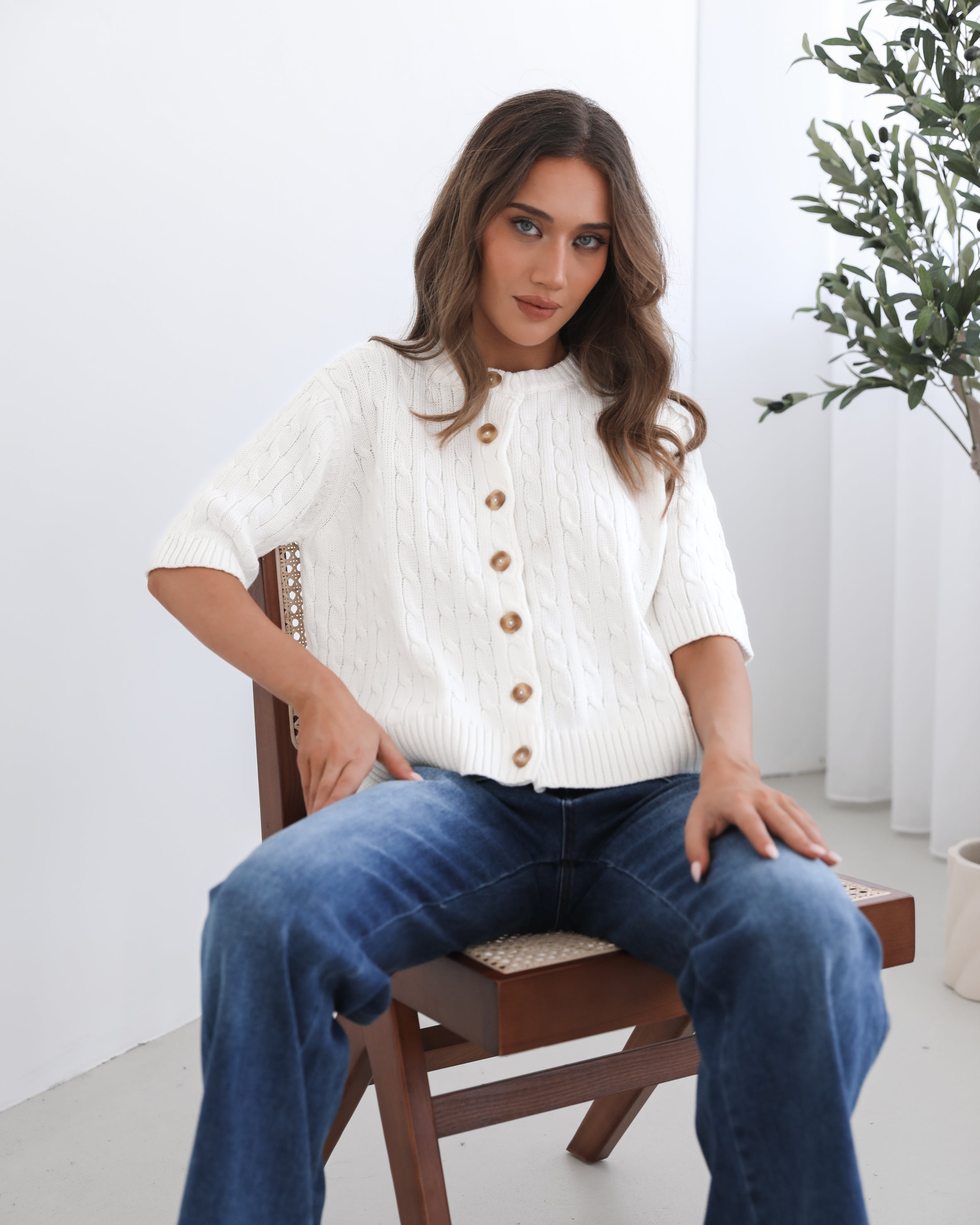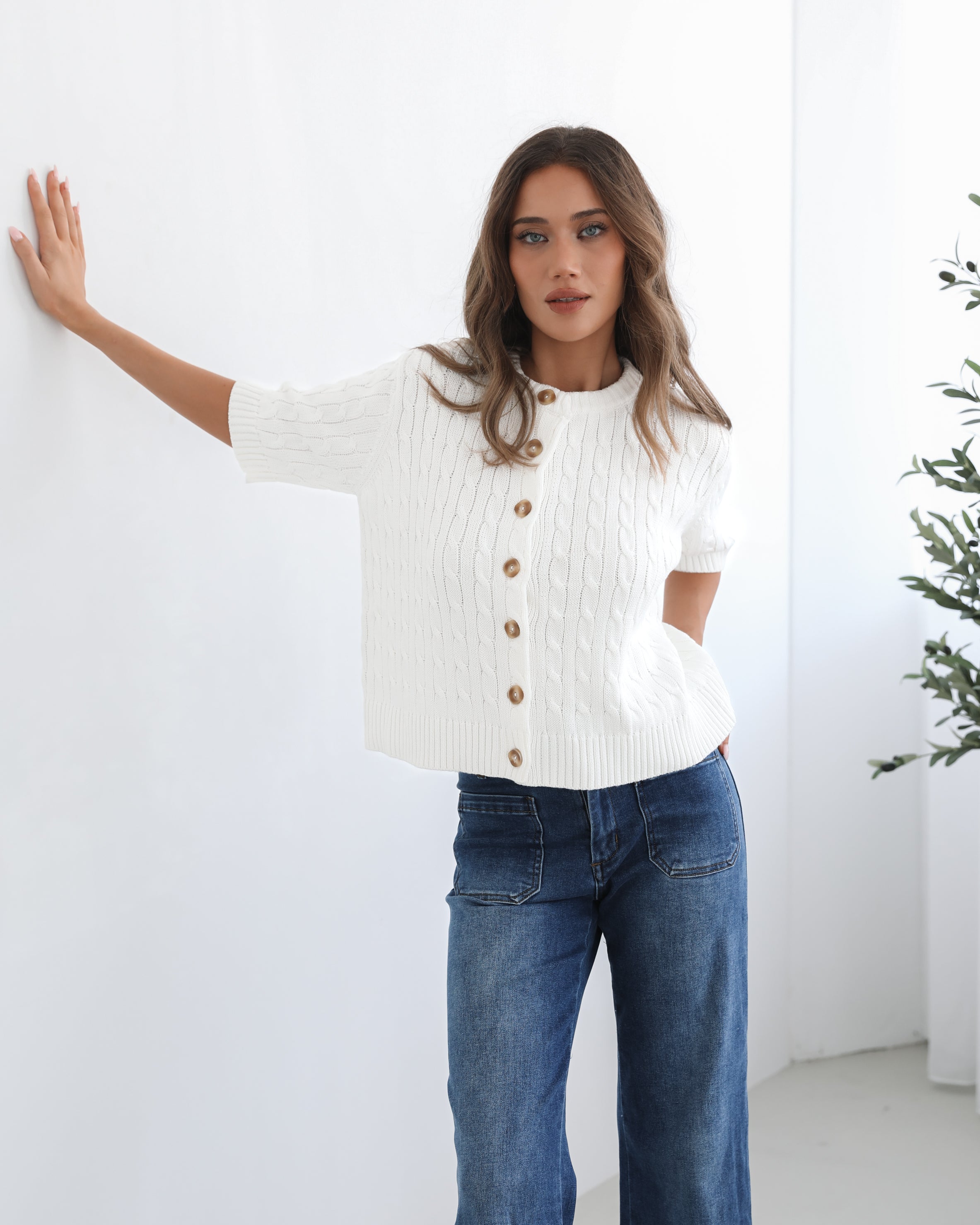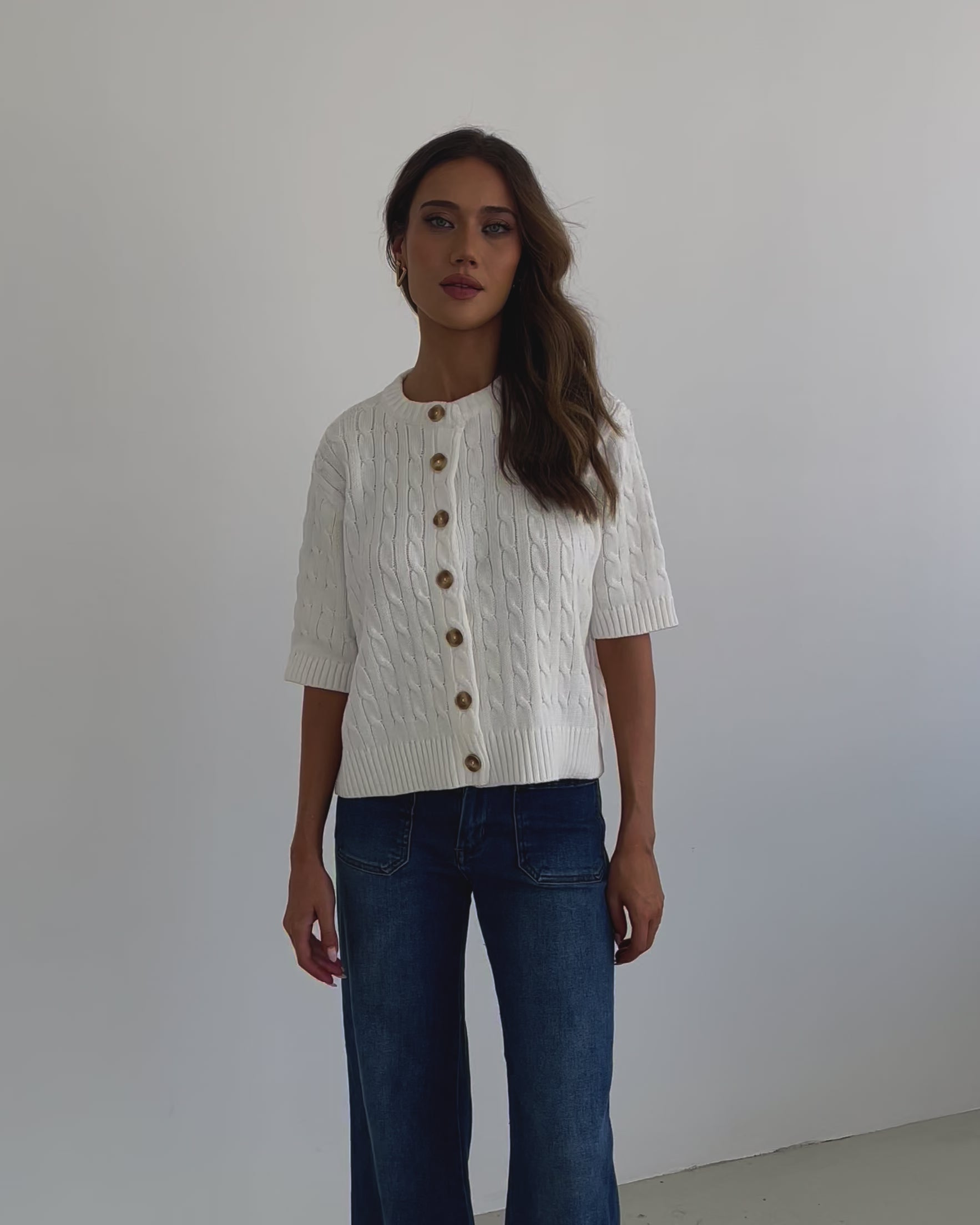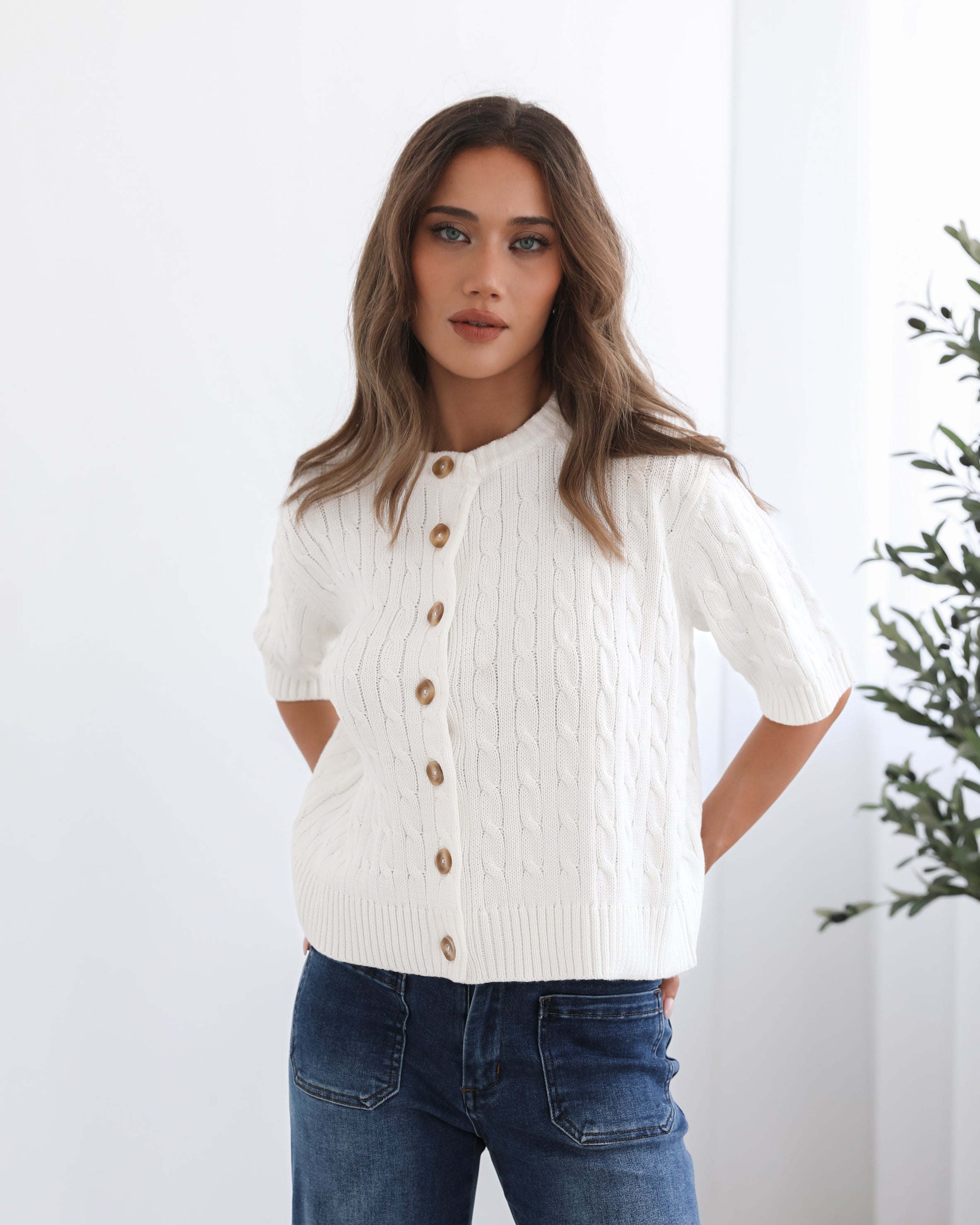 Our Wynter Knit Top comes in a white colour. Bringing a refreshing, minimalist charm to your outfit, this transseasonal piece features a round neckline, elbow length sleeves, centre-front buttons and relaxed fit. Keep it sleek with a tailored blazer and trousers for a more sophisticated, office-friendly outfit!
