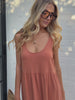 Our Lydia Dress comes in an orange rust tone. This relaxed midi features a scoop neckline, tie detailing on the shoulder straps, and a tiered skirt with gathered detailing. Paired with a sunhat and tan sandals, this piece is perfect for a balmy day look!