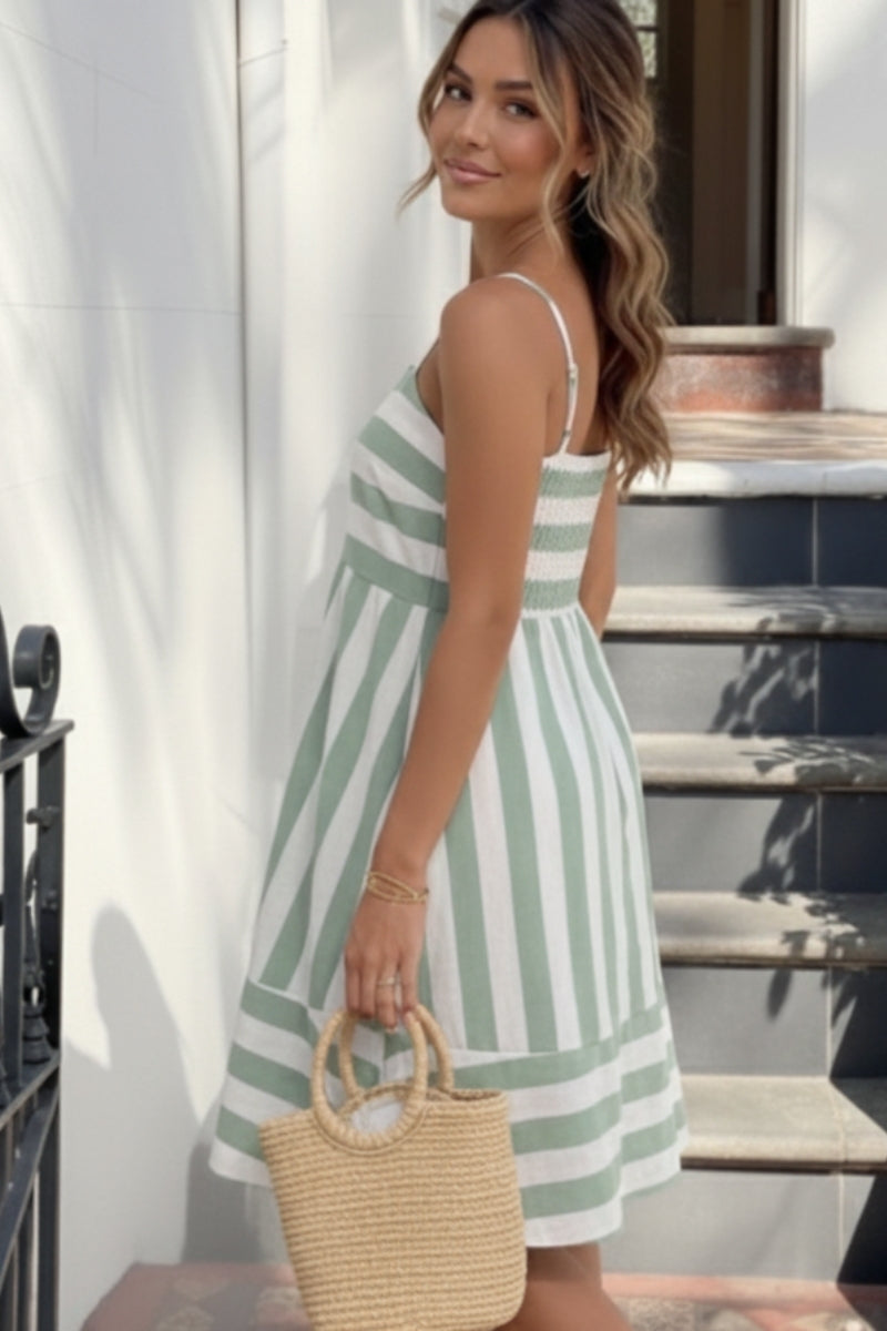 Our Sylvaine Mini Dress - Green Stripe comes in green and white tones. Fresh and playful, this green-and-white striped dress captures the spirit of carefree days. The lightweight fabric and easy A-line silhouette make it a summer essential, blending comfort with understated style. Pair it with white sneakers and a straw hat for a casual outing, or with espadrille wedges and dainty gold jewelry for a polished, sunset-ready look.