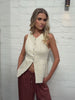 Our Avida Top comes in a beige colour. Your answer to understated sophistication, this piece is designed with a wide v-neckline, centre-front buttons and pockets. Pair it with tailored trousers, dainty gold jewelry, and a “got-this” attitude!