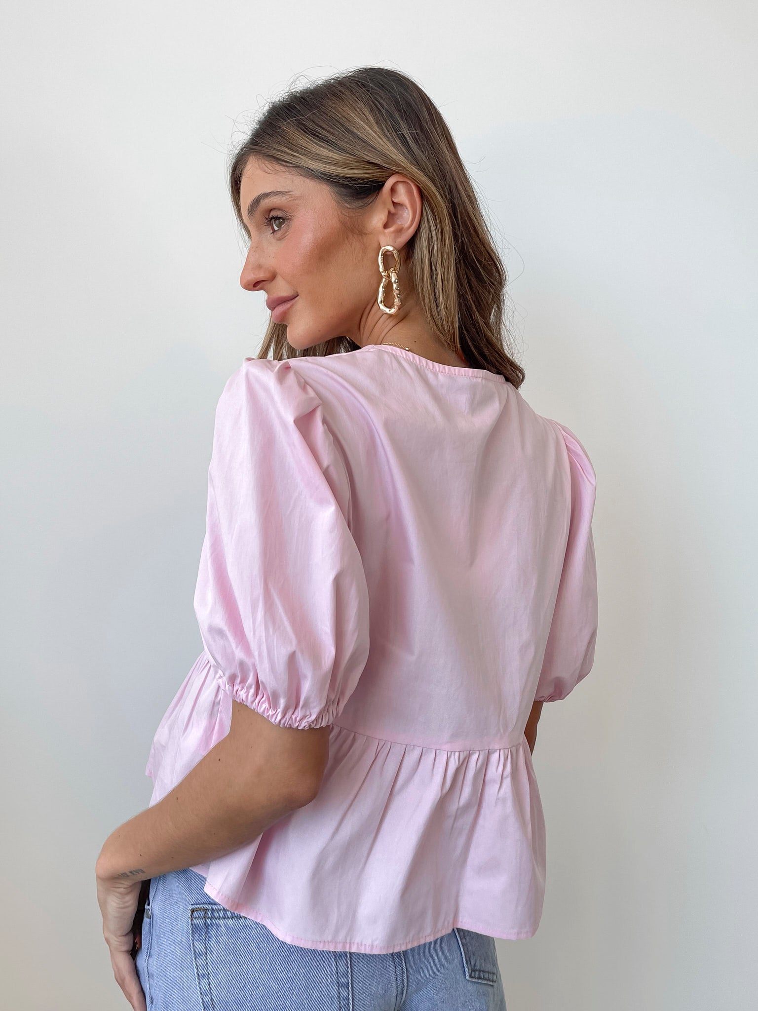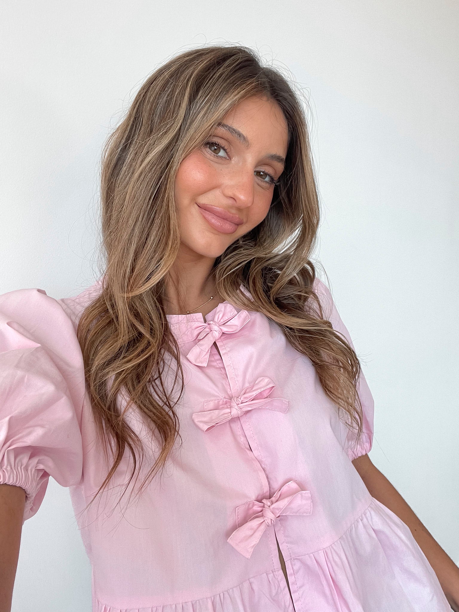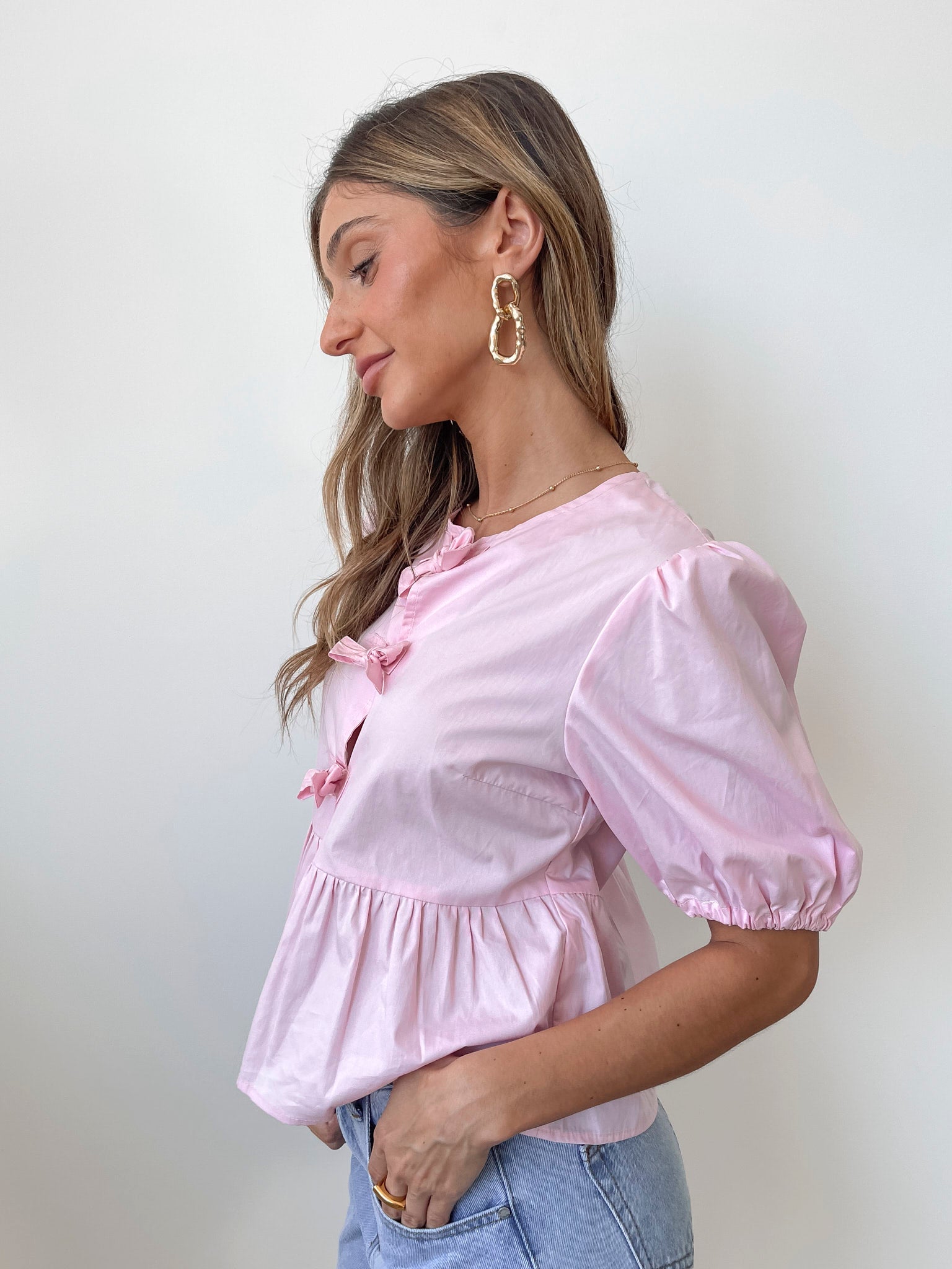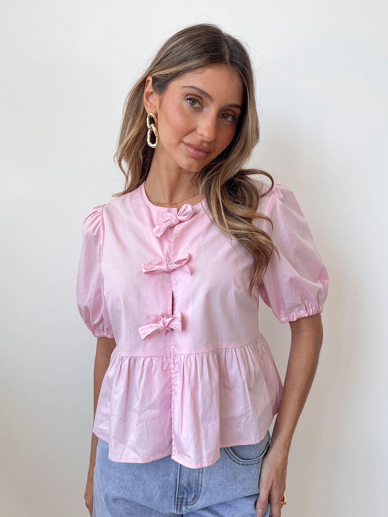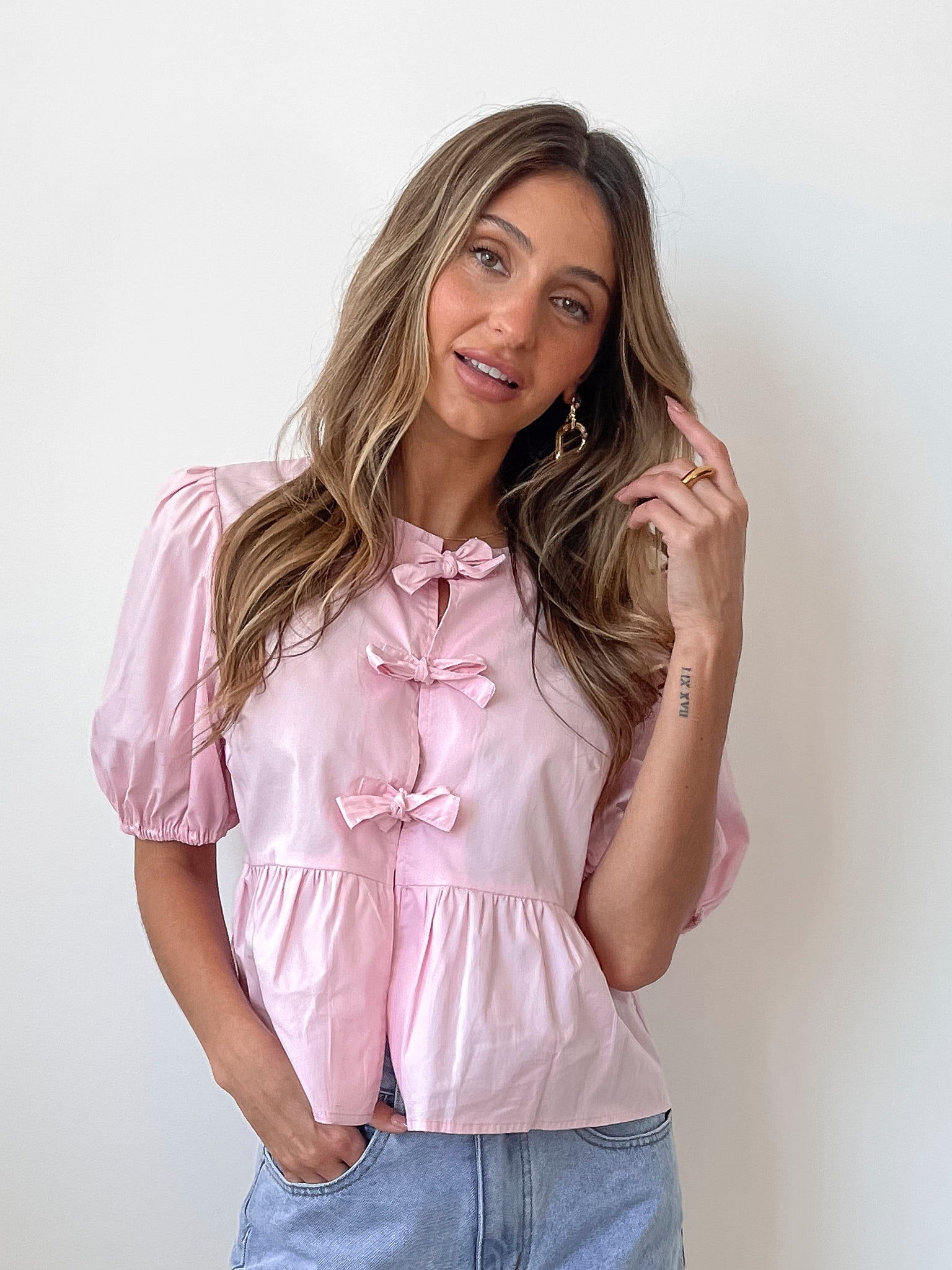 Our Rayanna Top comes in a pink colour. Wrapping you in a playful charm, this piece features a round neckline, top front bow ties, short puff sleeves and peplum design. Layer delicate gold necklaces and add a few dainty bracelets for some subtle sparkle!