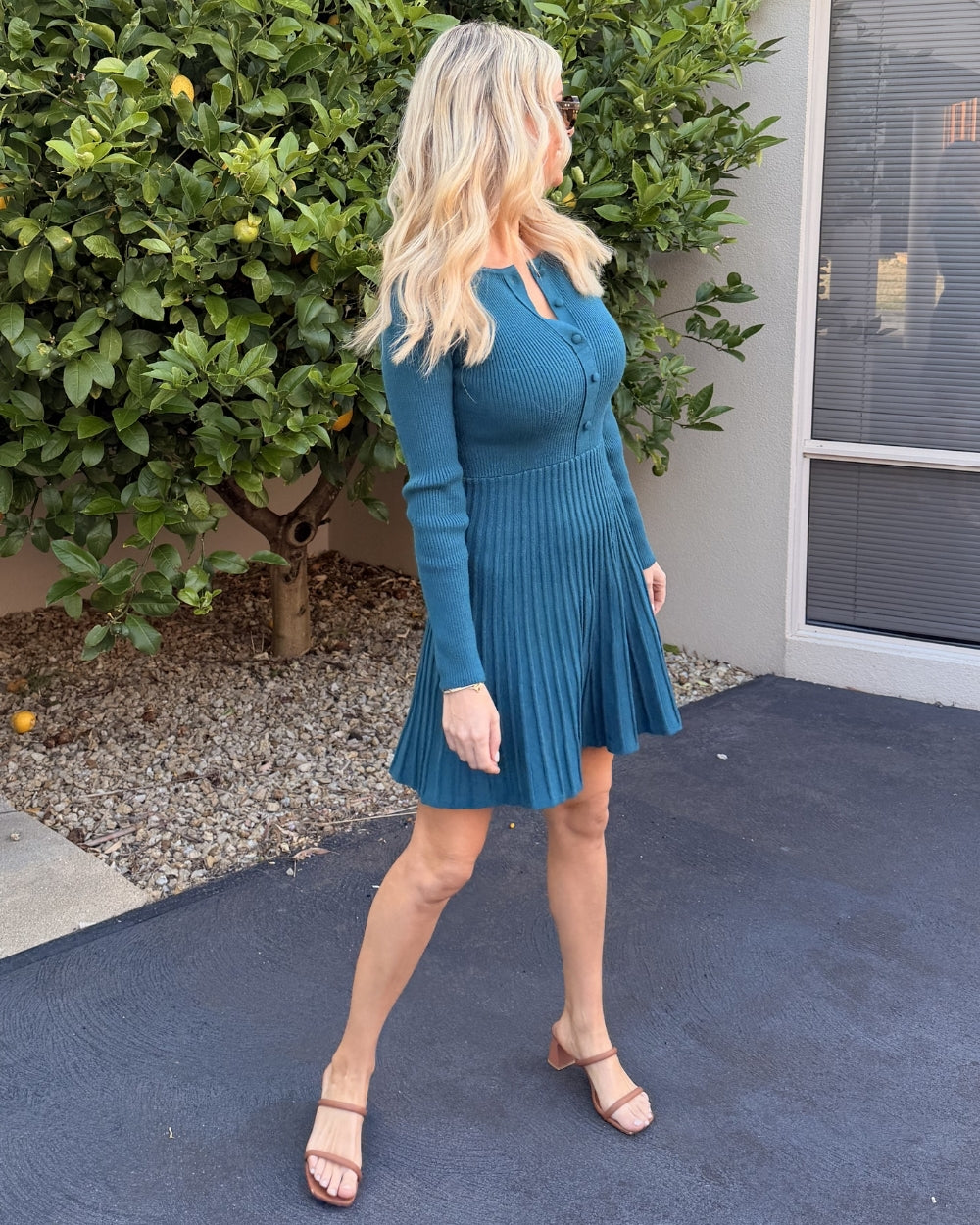 Rich Teal Colourway: A deep, jewel-toned shade that suits every skin tone. Ribbed Knit Bodice: Provides a snug, flexible fit for all-day comfort. Pleated Mini Skirt: Adds playful movement and a feminine touch. Functional Button Neckline: Features a delicate button-up front for adjustable styling. Long Sleeves: Perfect for trans-seasonal layering.