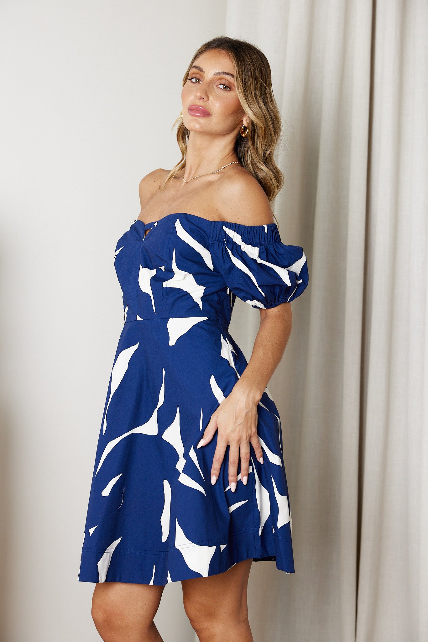Our Nalissa Dress comes in a leafy navy print. Grab your squad and look your best with this knee length staple that features an off shoulder sweetheart neckline, corset style bodice, short sleeves and a full flowy skirt. Style with lace up heels and a pendant necklace!