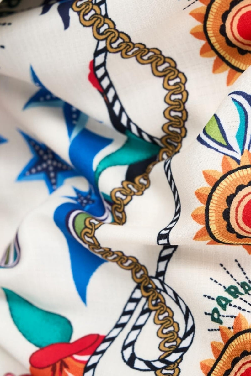 The crisp white base is beautifully adorned with a vibrant, unique folk-art pattern that is rich in texture and colour, a true statement piece. With a comfortable scoop neckline and a striking ochre and golden-toned border print along the hem, the Orielle is the epitome of effortlessly chic style. Perfect for brunch dates, summer weddings, or your next getaway, simply pair it with espadrilles and a woven tote to complete the look.