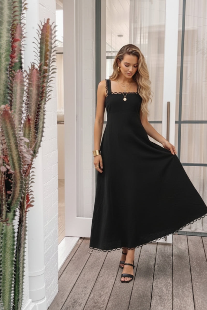 The Evelisse Dress in Black is a timeless and elegant midi dress, perfect for sophisticated occasions. It features a classic square neckline and delicate scalloped shoulder straps for a charming touch. The flattering A-line silhouette offers a comfortable yet refined fit, extending to a graceful long length with a subtle scalloped hem.