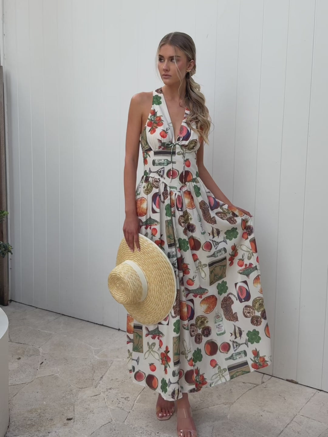 Our Alpharetta Dress comes in a beige base with multi-toned prints. Bringing the artsy attitude, this number features a halter neckline, flowy skirt and maxi length hem. Style it with minimalist heels, a sleek bun, and your favourite bold earrings!