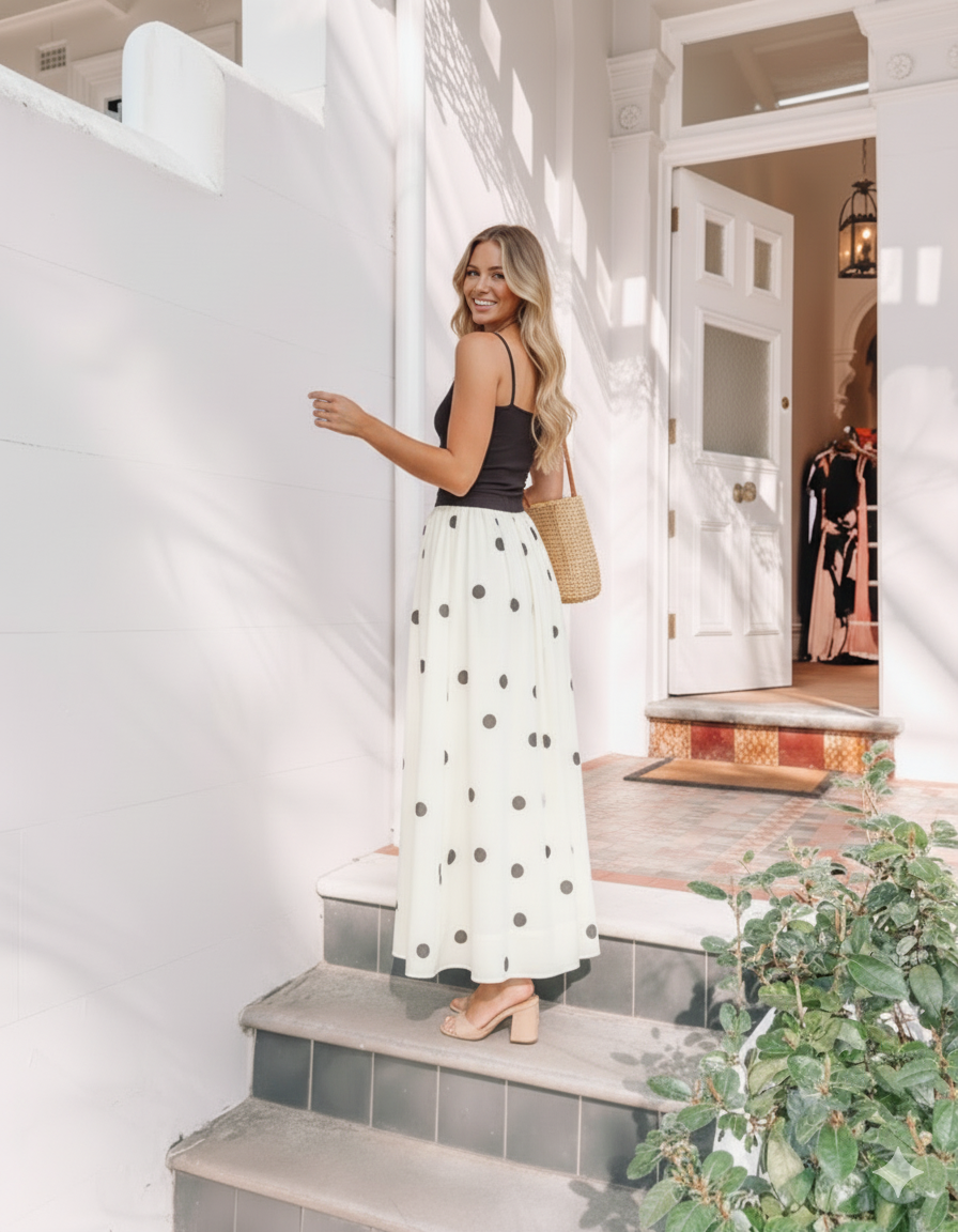- Key Features: Fitted black tank-style bodice with a classic scoop neckline. Delicate spaghetti straps. Dramatic contrast with a flowing white/cream maxi skirt. Skirt features a bold black polka dot (spot) print. Relaxed, generous A-line silhouette in the skirt. Maxi length for an elegant drape.