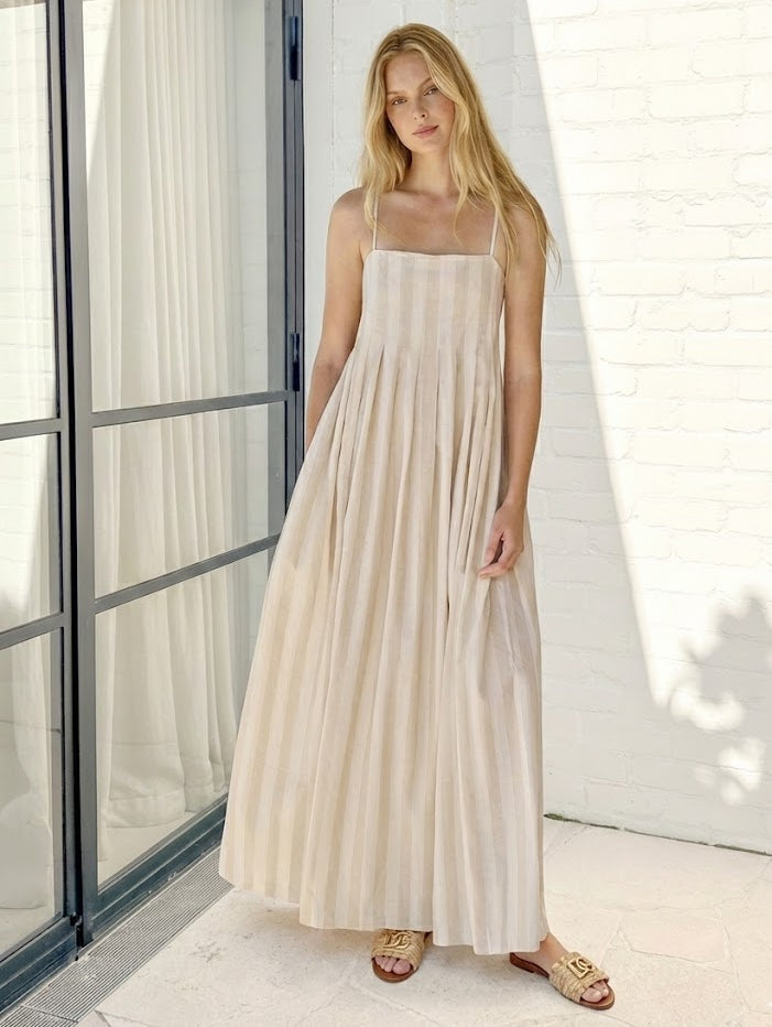 - Key Features: Adorned with a beautiful, understated beige stripe pattern against a complementary light background, this dress offers a chic and versatile aesthetic. The delicate vertical stripes create a lengthening and flattering effect. A stylish square neckline provides a modern and clean finish, elegantly highlighting your collarbones and shoulders. Fine, adjustable spaghetti straps add to the dress's airy appeal, ensuring a comfortable and customizable fit for warmer weather. The dress boasts a stunning full-length maxi skirt that cascades gracefully with every movement, creating an ethereal and romantic presence. Designed with both style and ease in mind, this dress features a comfortable, relaxed fit that allows for beautiful drape and all-day wearability. Crafted from a soft, airy fabric, it ensures you stay cool and chic, making it ideal for sunny days and balmy evenings.