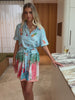 Our Dakoda Dress comes in a beautiful blue base with multicoloured prints. Bursting with fun patterns and boundless charm, this staple features a shirt collar, centre-front buttons, short sleeves, waist tie, a-line skirt and mini length hem. Pair it with a unique bag for when you’re feeling a little adventurous!