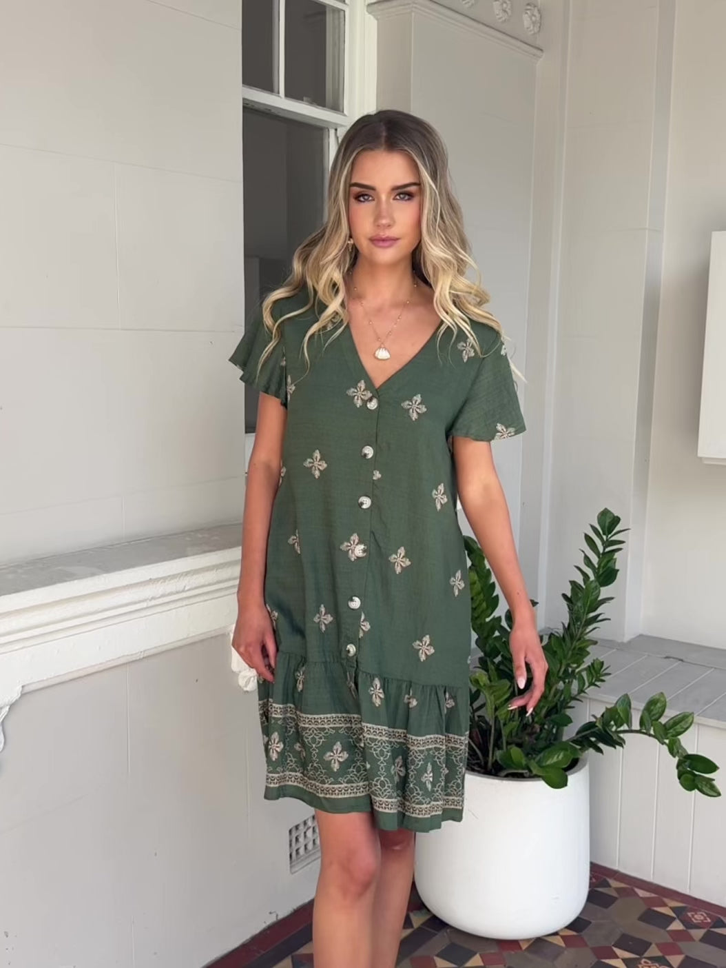 Our Kalea Dress comes in shades of green. That quiet favourite you’ll reach for when you want ease and style, this piece is designed with a v-neckline, short sleeves, side pocket and knee length hem. Match it with a wide-brim hat and espadrilles for weekend markets!