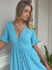 - Key Features: Short sleeves with frill detailing. V neckline and functional buttons on front. Midi length. Gathered bust and waist detailing. Relaxed skirt.