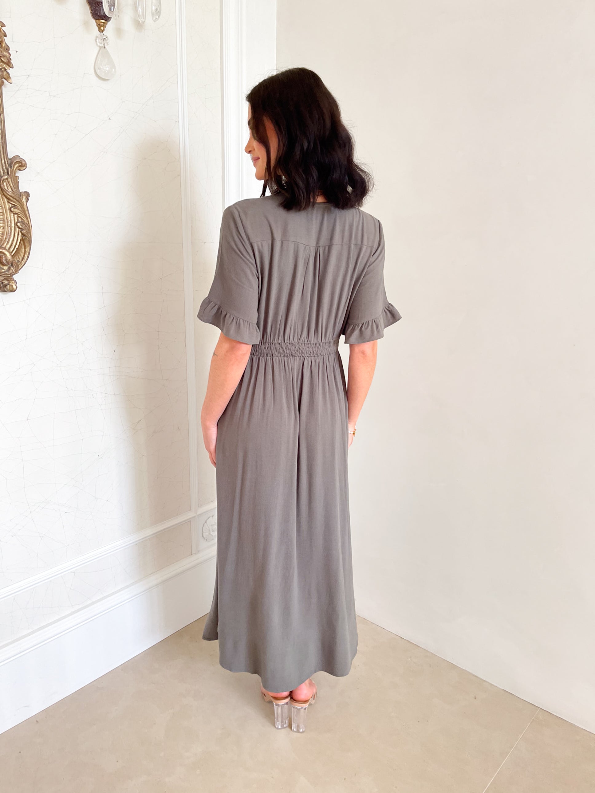 Our Korbella Dress comes in a khaki colour. Grounded yet glamorous, this piece is the perfect casual statement with its v-neckline, short sleeves with flounce, centre-front buttons, a-line flowy skirt and midi length hem. Style it with flat sandals or espadrilles for a comfy yet stylish option.