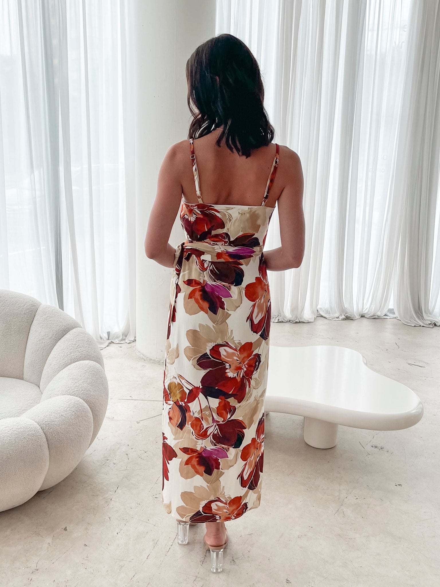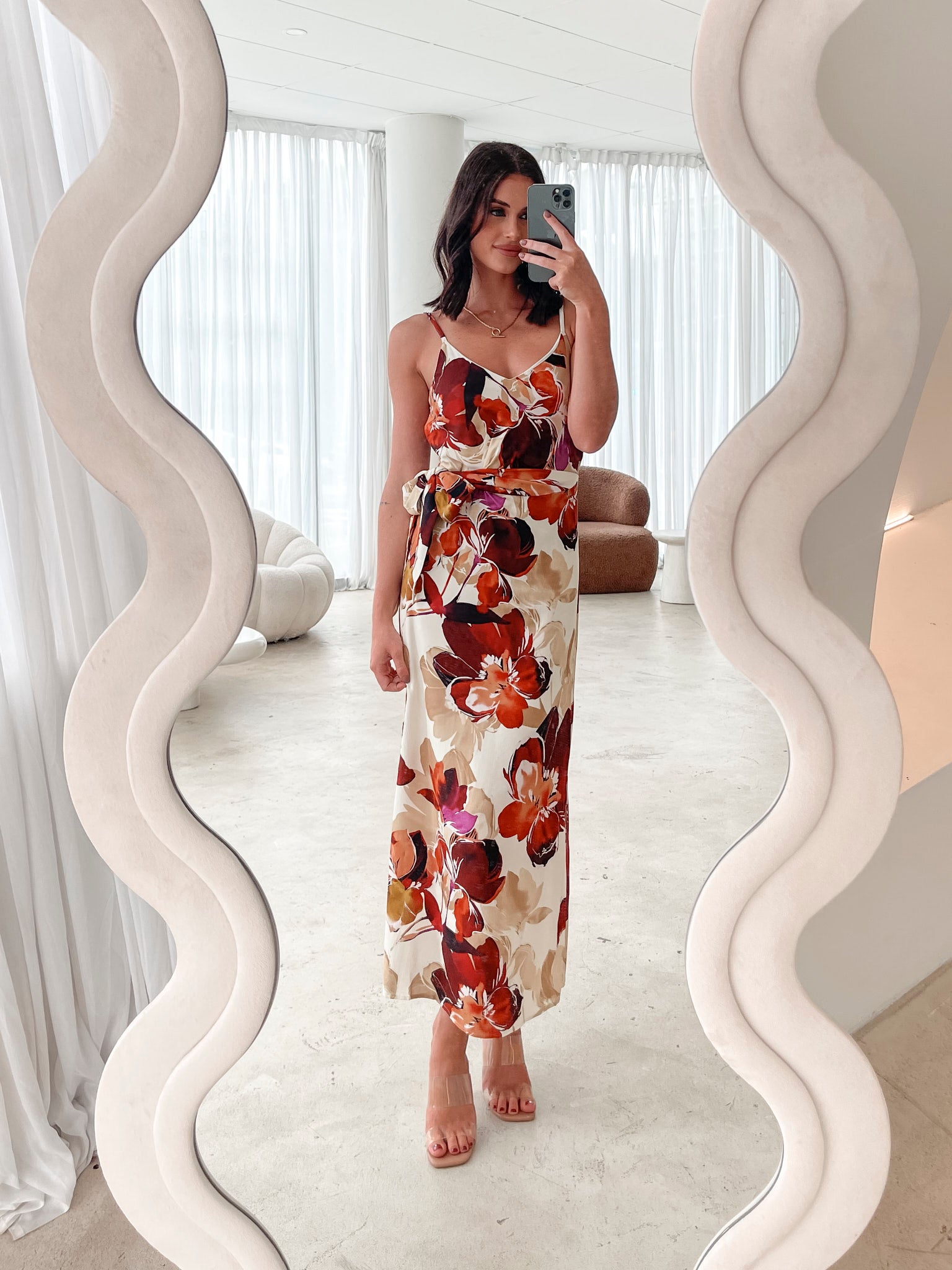 Our Laguna Dress is a gorgeous fawn floral in a light weight non-stretch fabric. This stunning midi features a soft V neckline & side splits that allow for easy strolling. The adjustable straps are customisable to comfort. The slip style dress features a side tie detail (on wearer's left) that you're sure to love.