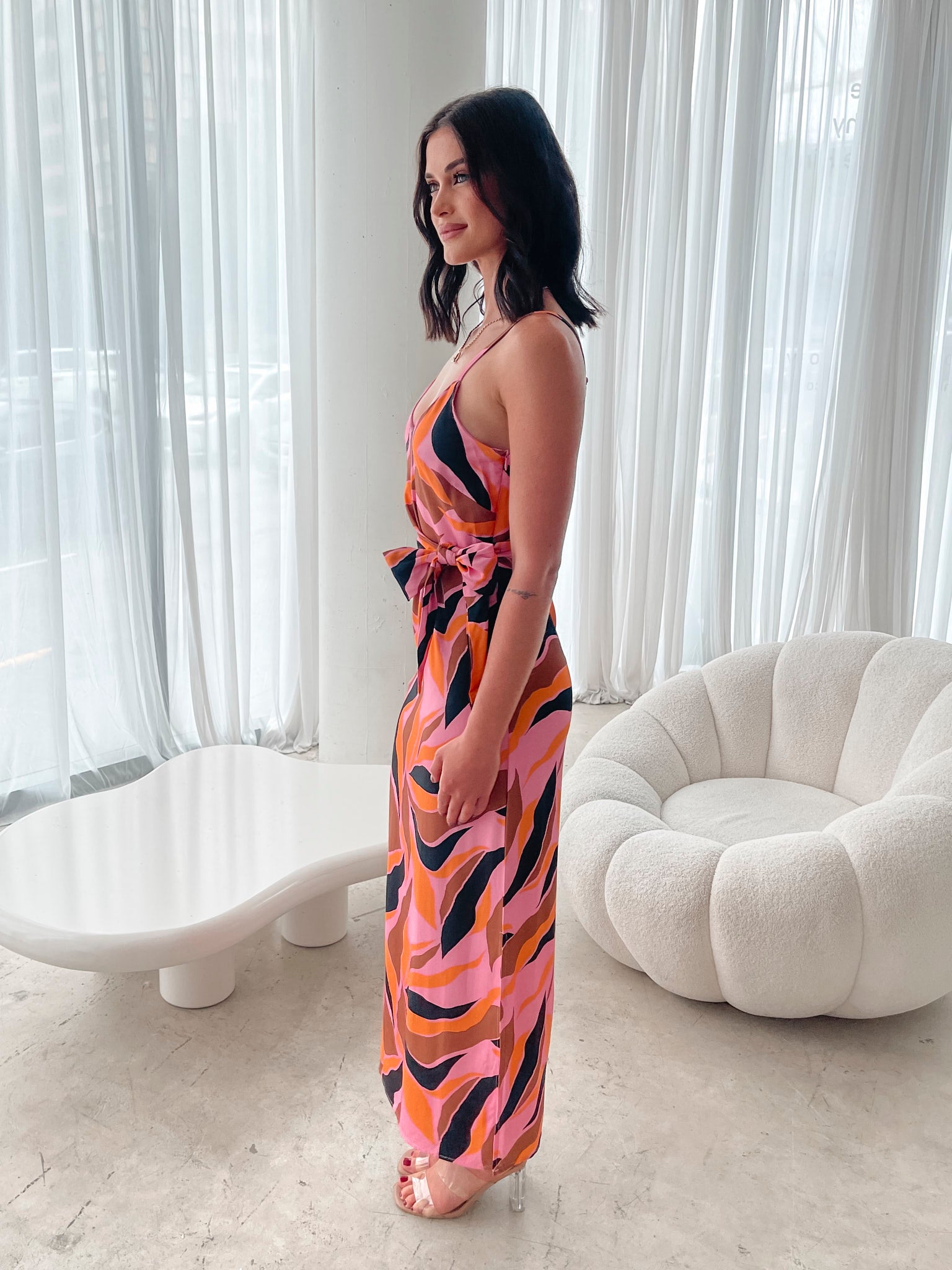 Our Laguna Dress is a gorgeous pink abstract print in a light weight non-stretch fabric. This stunning midi features a soft V neckline & side splits that allow for easy strolling. The adjustable straps are customisable to comfort. The slip style dress features a side tie detail (on wearer's left) that you're sure to love.