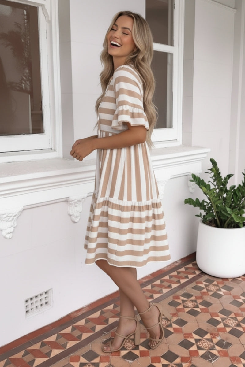 Our Serah Dress -Beige Stripe comes in beige and white tones. For casual days that still call for a touch of polish, this stunner is designed with strings on its neckline, button closure, short sleeve with flounce, tiered skirt and knee length hem. Just slip on flat sandals and step into laid-back elegance!
