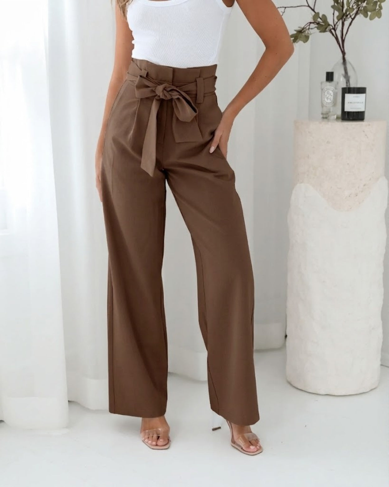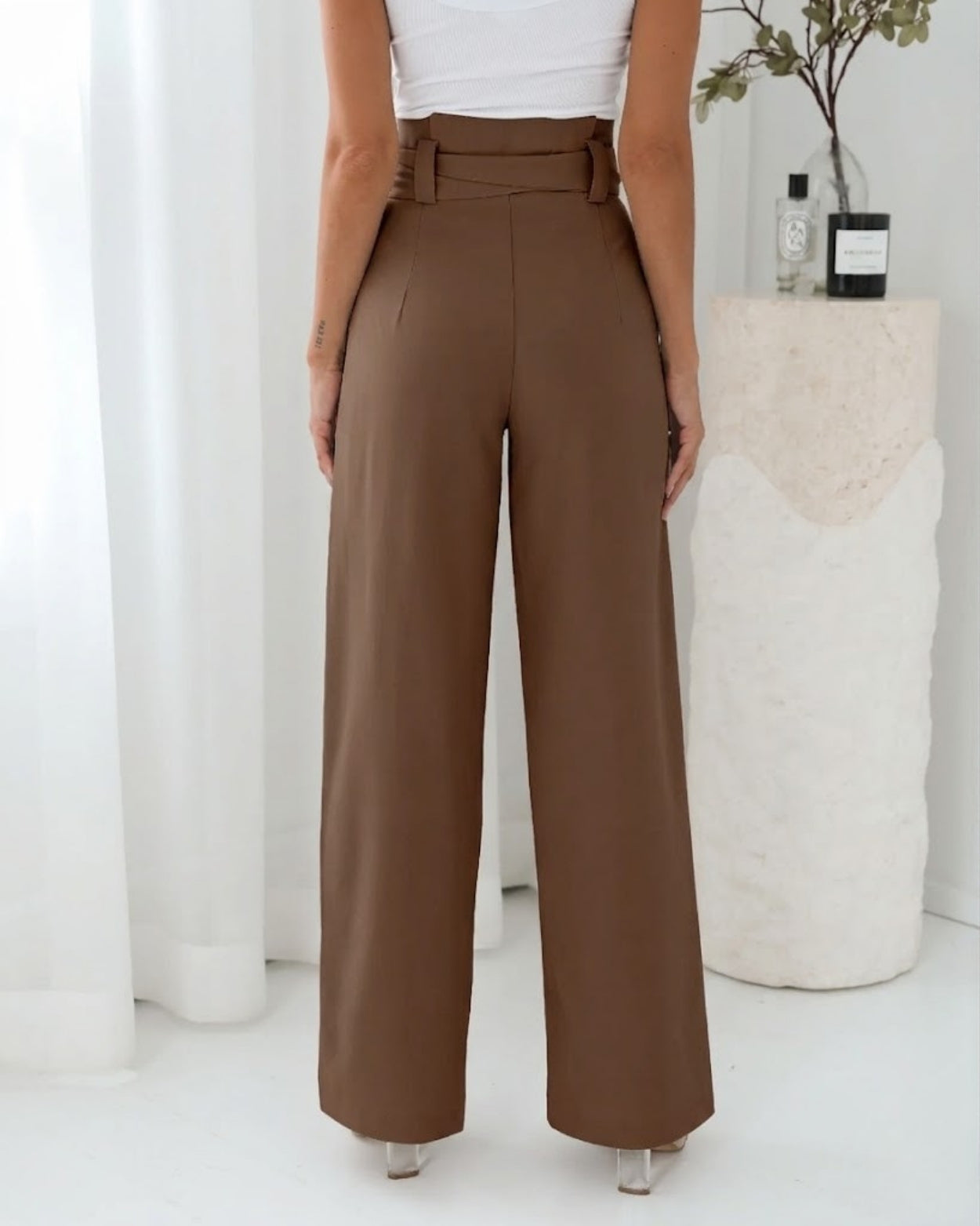 - Key Features: Maxi length. Relaxed fit. Wide leg pant. Paperbag fitted high waist style. Detachable fabric waist belt. Side pockets