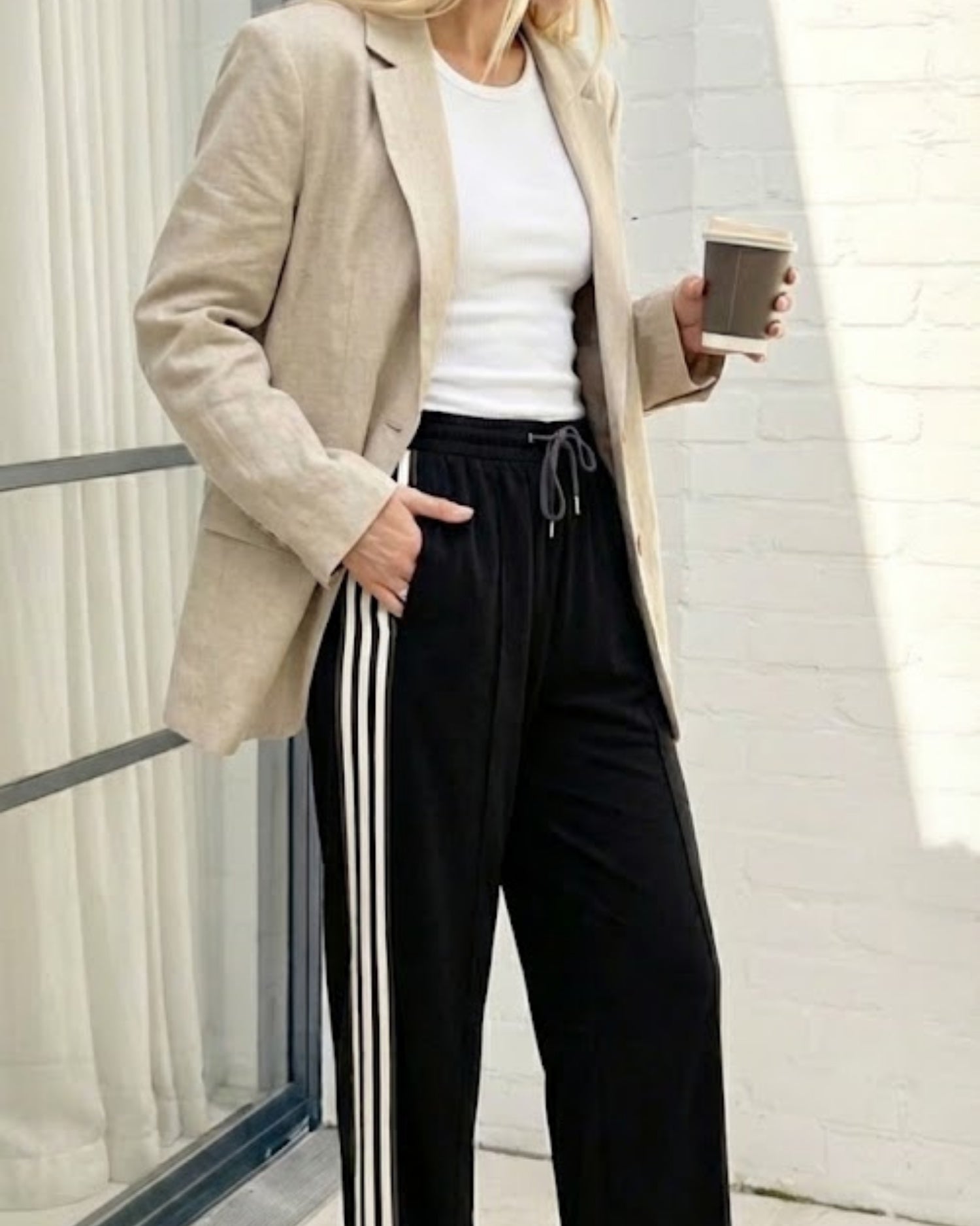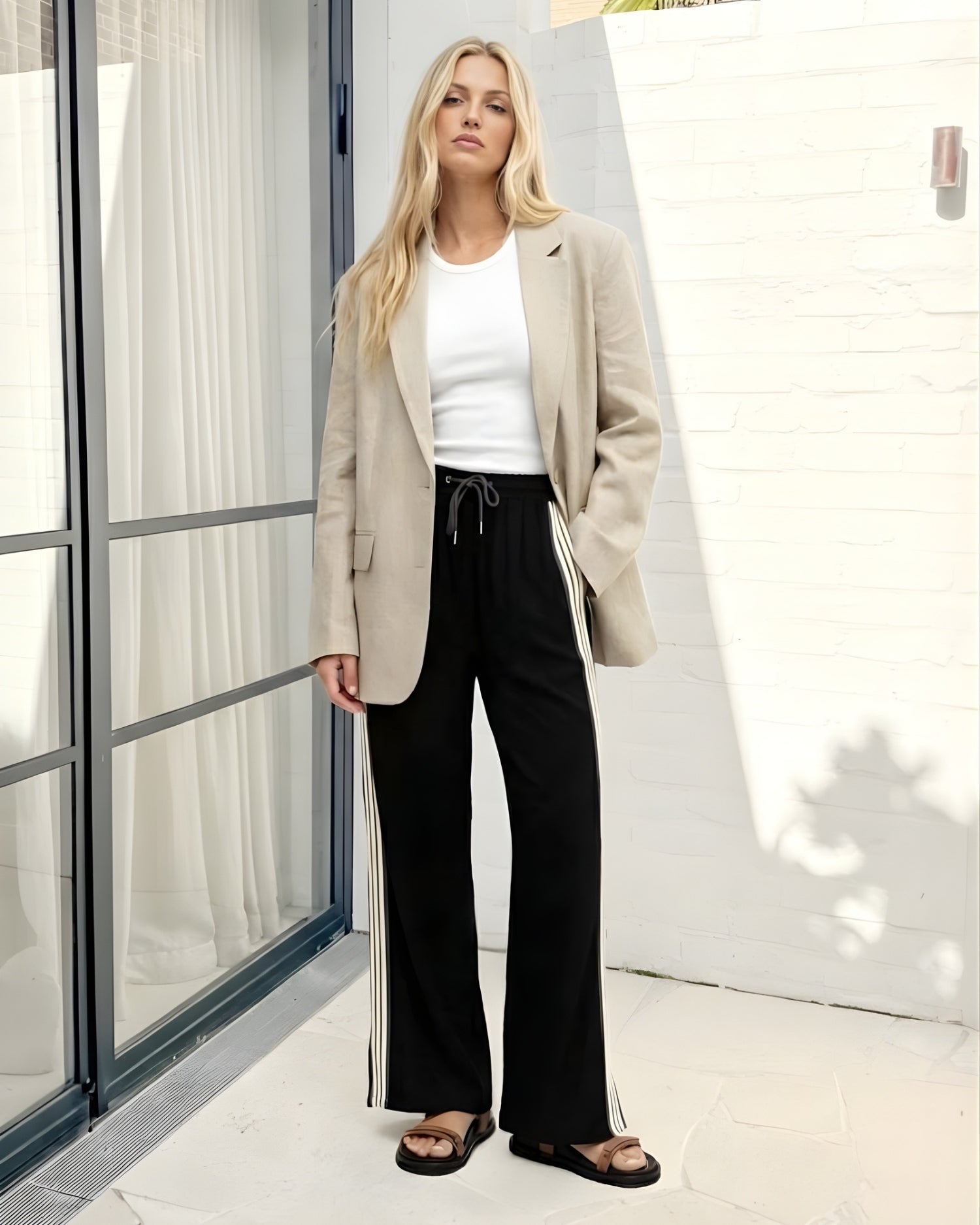 Our Iverie Pants come in a black colour with white stripes. Equal parts street-cool and comfy chic, this number is high waisted and features a string, side slit, wide leg silhouette and ankle length hem. Style it with your favorite kicks and a statement jacket!