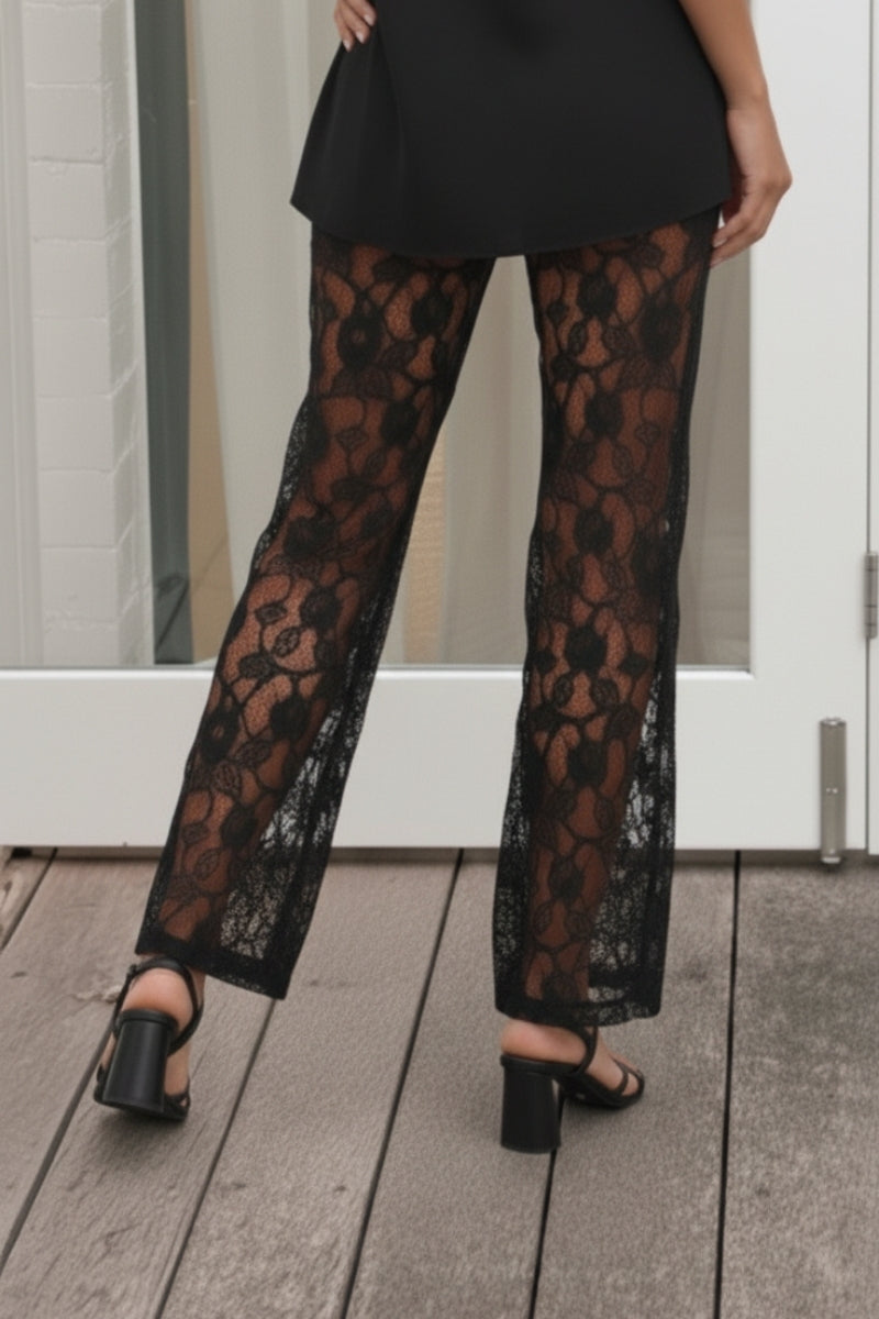 - Key Features: Sheer black floral lace fabrication (designed to be layered). Flattering high-waisted fit. Dramatic semi-wide-leg silhouette for movement. Scalloped edge detailing along the hemline.