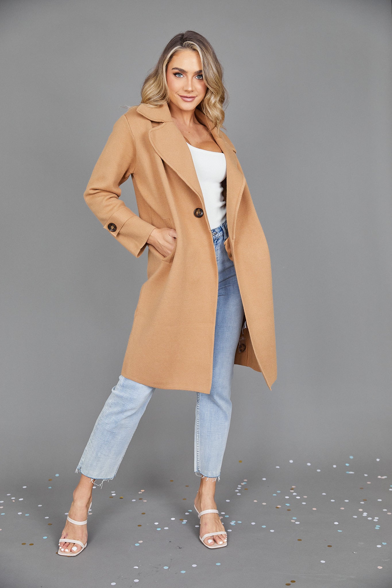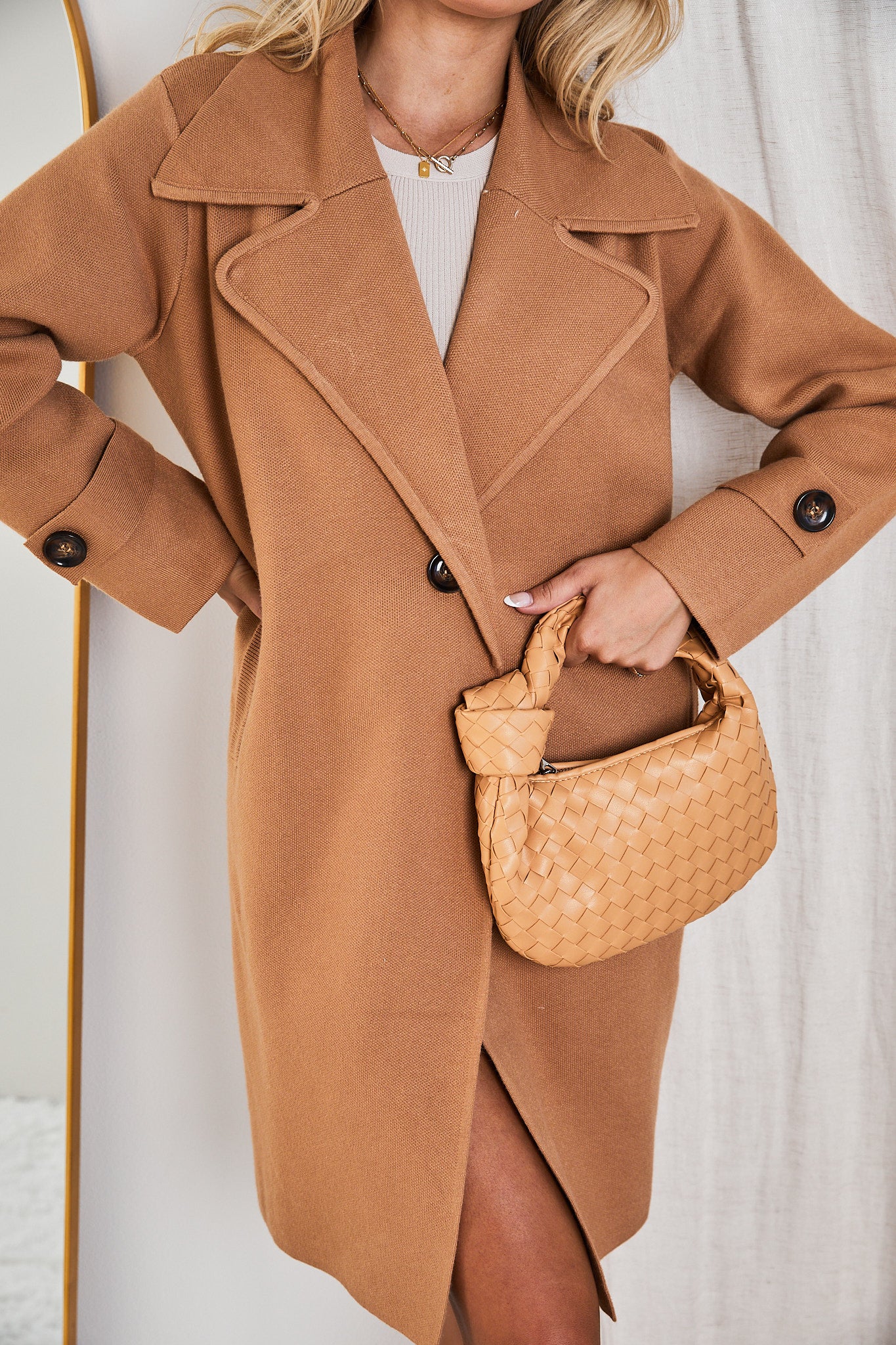 Our Fireplace Coat is a medium-weight, knitted trench-style piece in a neutral camel tone. Designed with an open-front silhouette, it features faux button details on the cuffs and front, along with functional pockets. Pair it with your favourite relaxed pants for an effortlessly classy winter look.