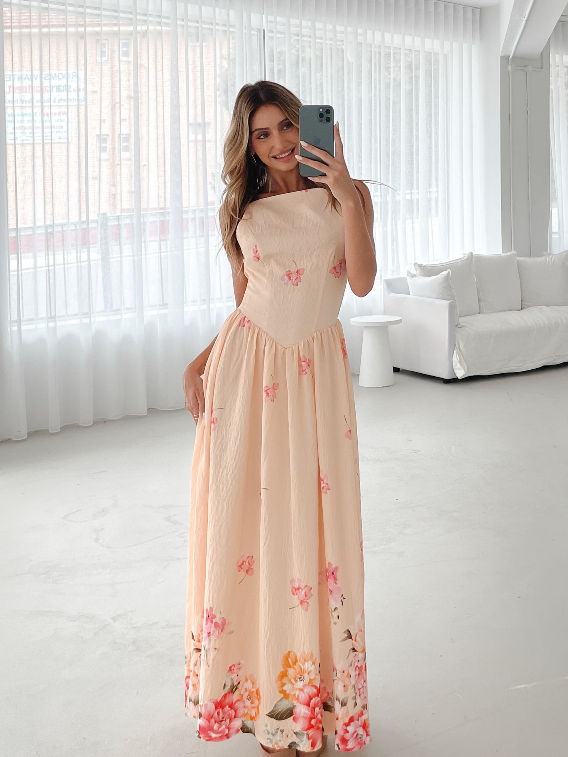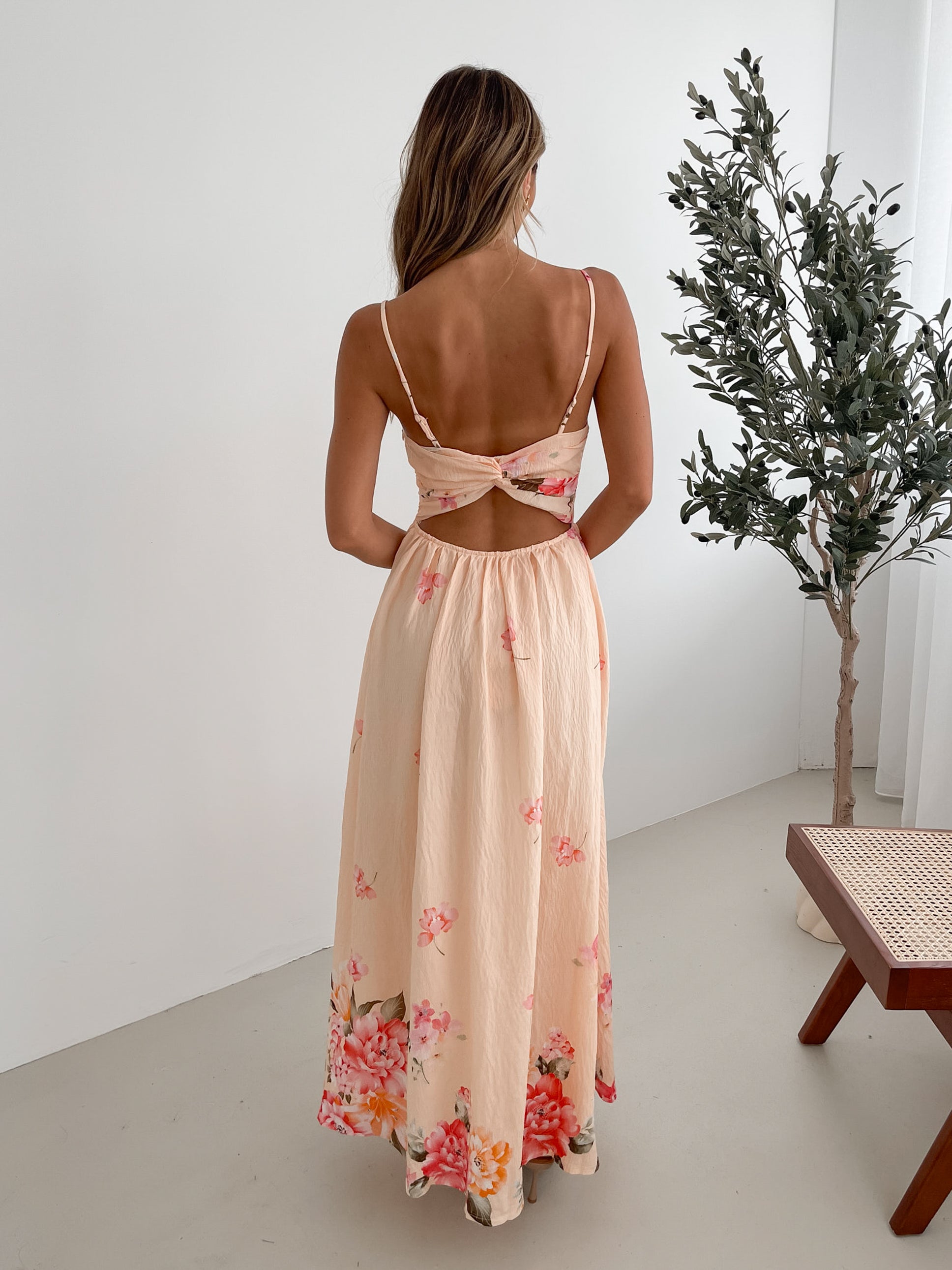 • Key Features: Slim straps. Boat neckline. Flowy skirt. Maxi length hem.