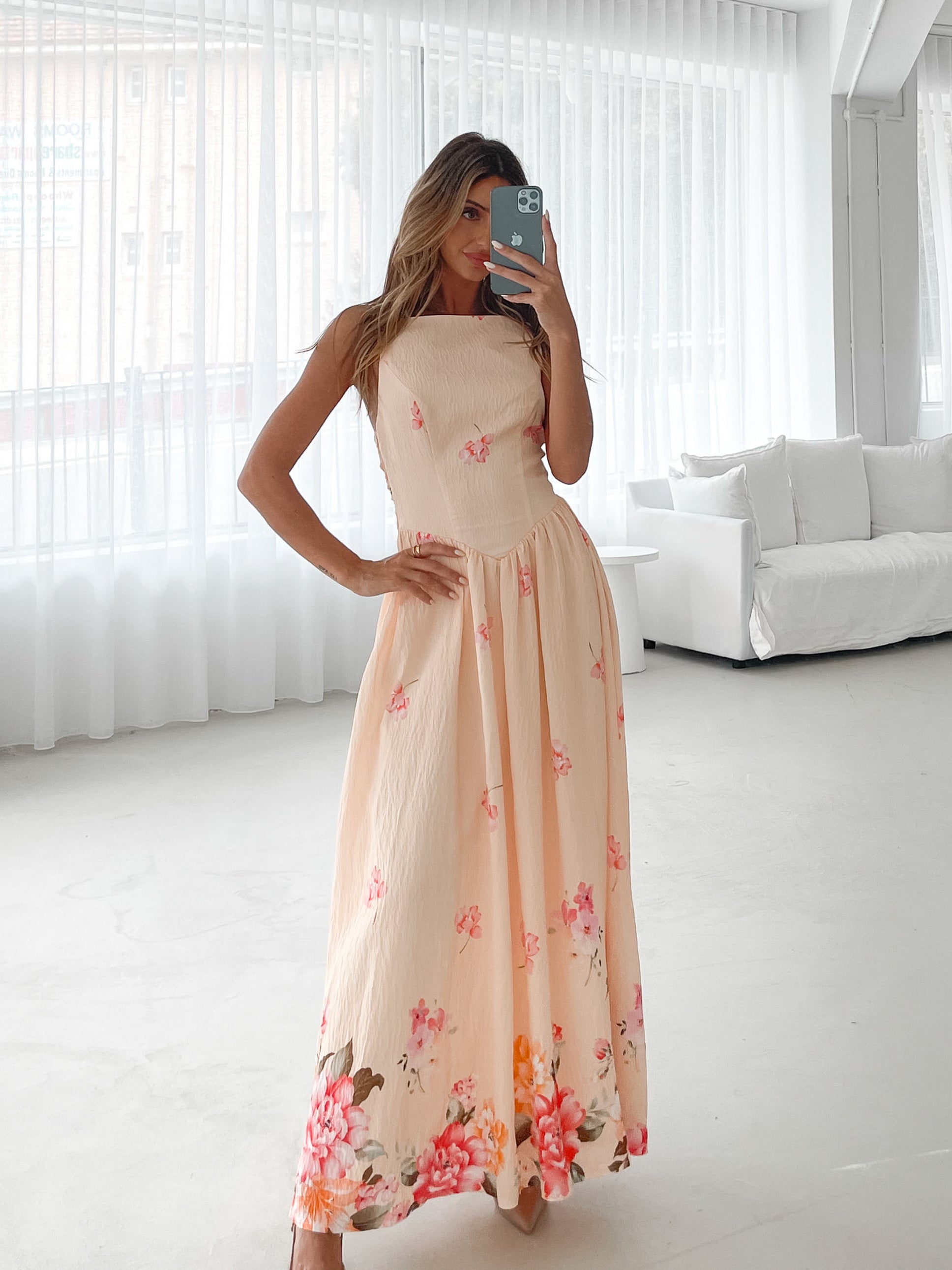Our Latosha Dress comes in a creamy base with pink and green floral prints. Bask in blooming elegance with this piece that features slim straps, boat neckline, flowy skirt and maxi length hem. Evoke the beauty of a spring garden with flower-shaped earrings!