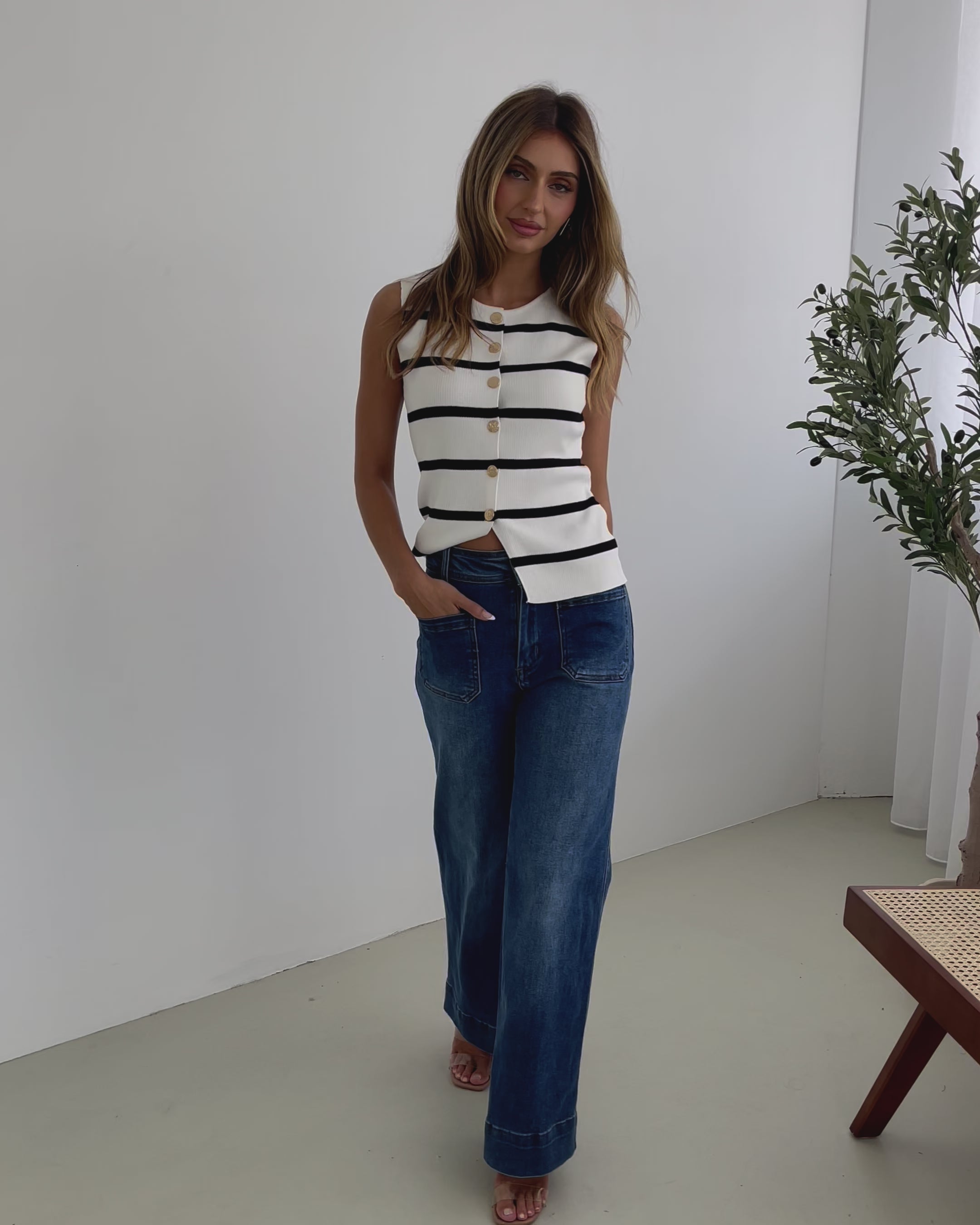 Our Keyana Knit Top comes in black and white colours. A modern twist on a classic comfort, this piece is designed with a round neckline, button up closure and is sleeveless. Pair this vest top with vintage-inspired high-waisted trousers and a sleek belt for a sophisticated, elevated look!