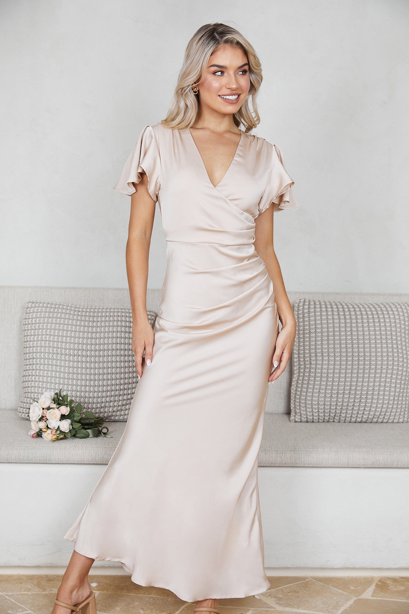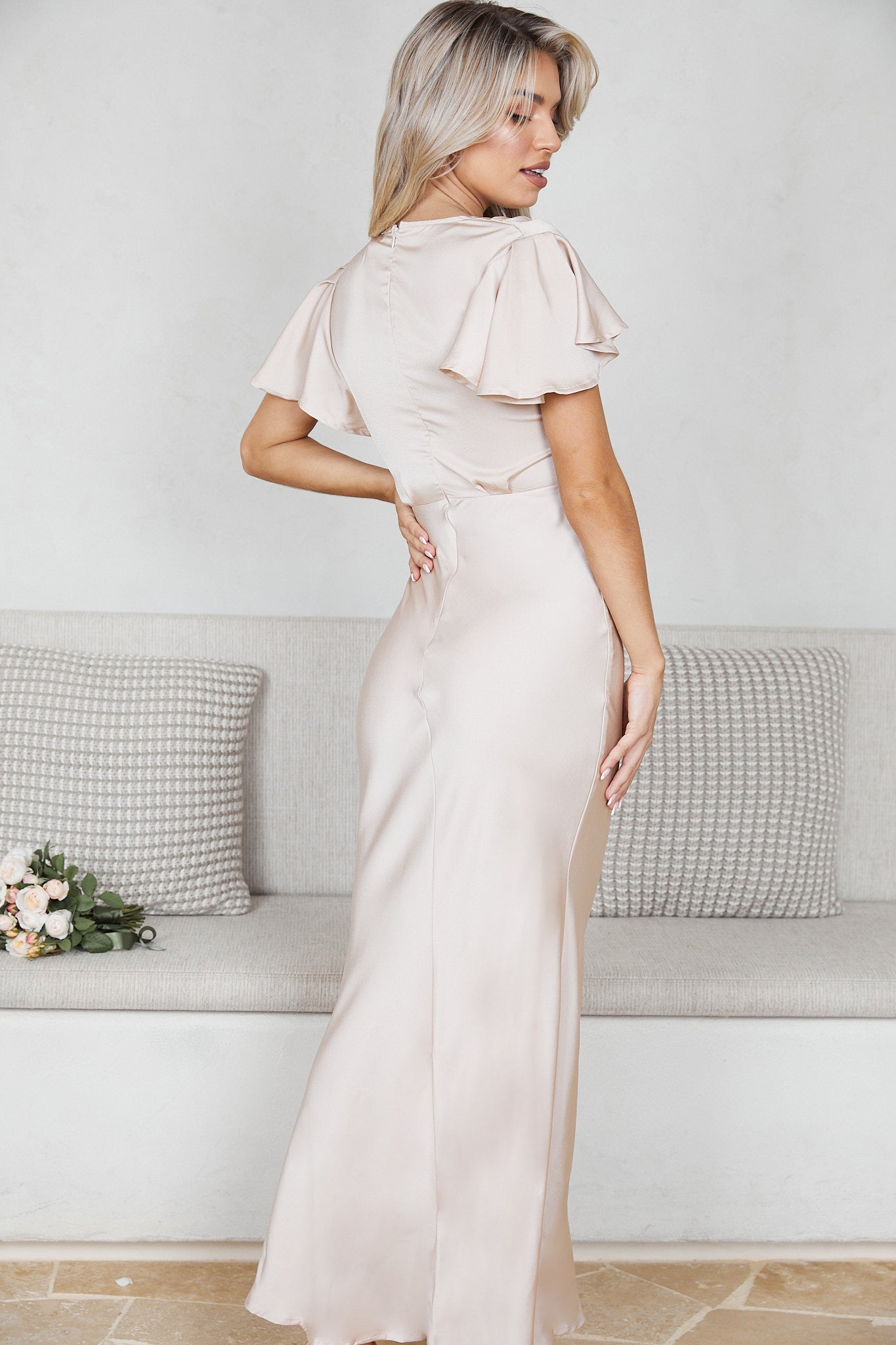 Our Doren Dress comes in a stunning champagne tone. This maxi features a V-neckline, short butterfly sleeves, and gathered detailing on the side of the bust and skirt. This effortless piece pairs so easily with heels for a date night look!
