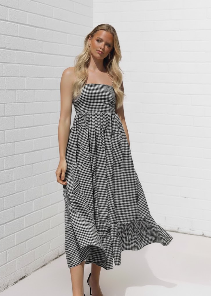 - Key Features: Flattering smocked bodice that provides a comfortable and flexible fitted top. Delicate spaghetti straps. Flowing, tiered midi skirt for beautiful movement. Classic black and white gingham/check pattern. Lightweight and breathable cotton fabrication.