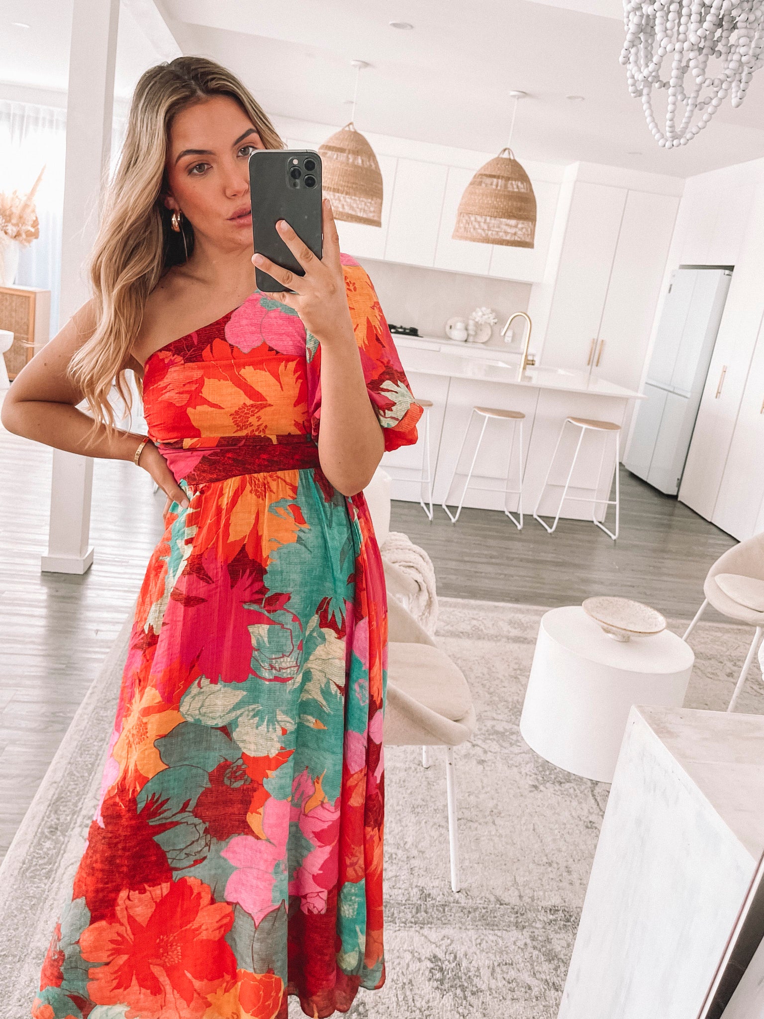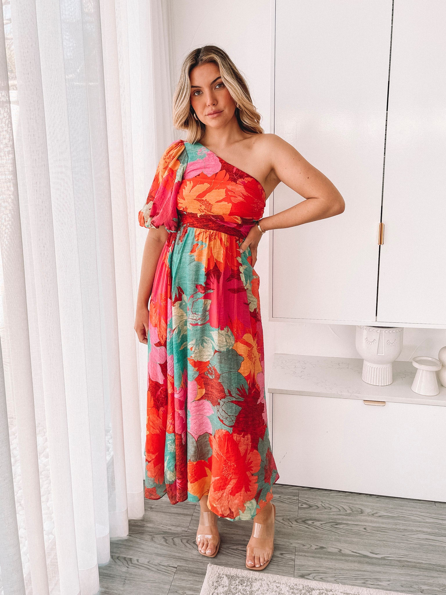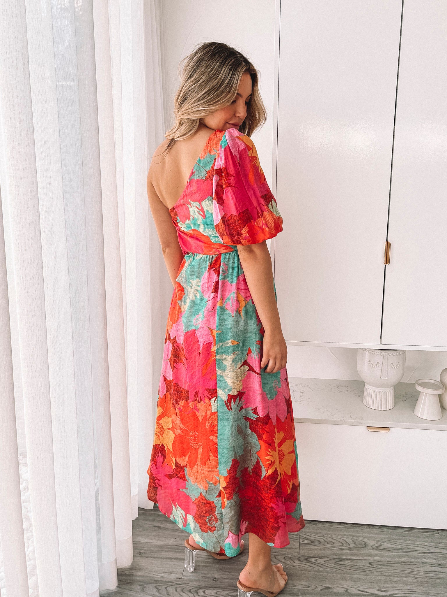 Our Lakelyn Dress comes in a multi coloured floral print. Go into your garden of dreams with this number that features a one shoulder neckline, single puff sleeve, flowy a-line skirt and midi length hem. Pair it with a pearl jewellery for a romantic look!