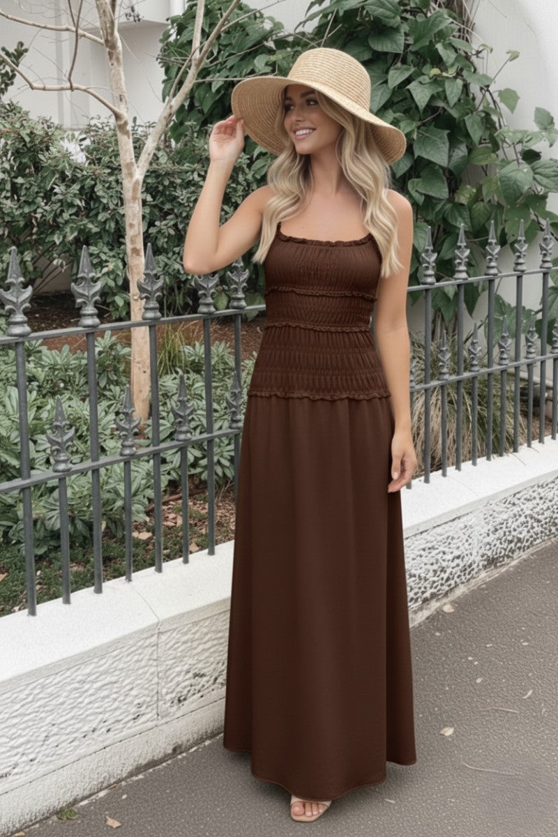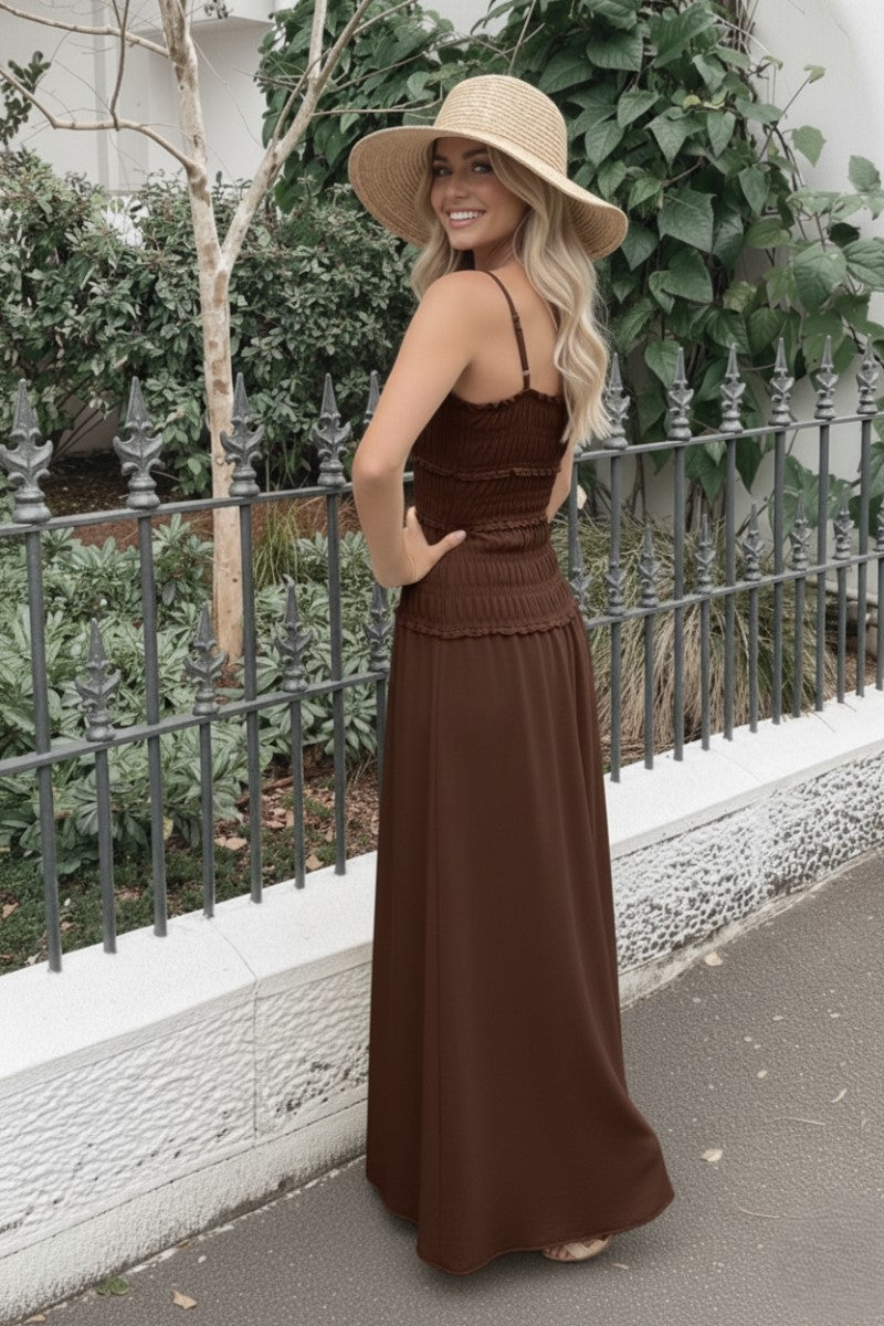 The Mikayla Dress in Brown is a stylish and comfortable maxi dress, perfect for a relaxed yet chic look. It features a flattering smocked bodice that provides a flexible, fitted silhouette and delicate spaghetti straps.