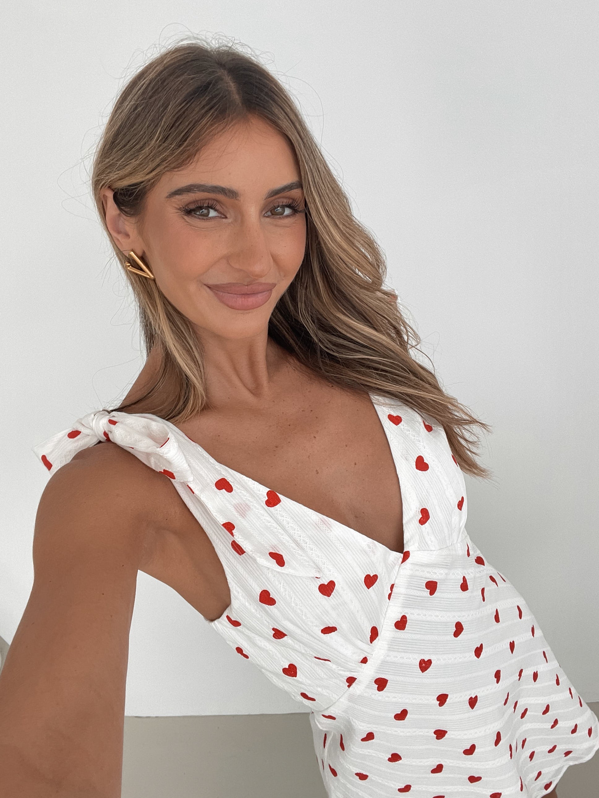 Our Carolyn Dress comes in a white base with red heart prints. For occasions that call for a little extra love, this number is designed with tie straps, low v-neckline and mini length hem. Look sweet, stylish, and oh-so-charming with a headband with bow detailing!