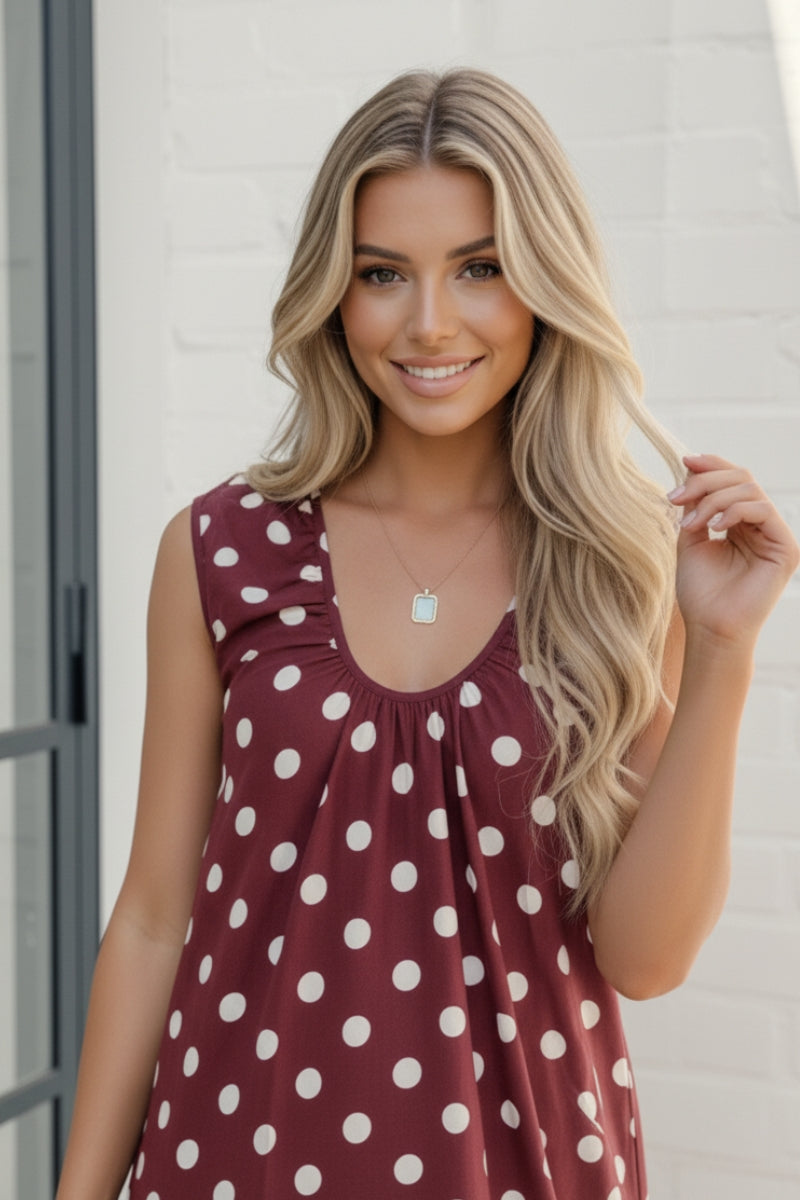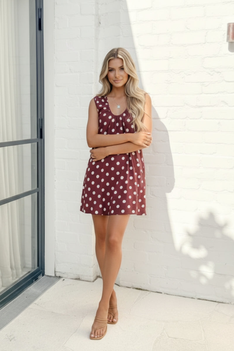 The Danika Dress in Burgundy Spot is a charming and playful mini dress, perfect for a relaxed yet stylish look. It features a flattering scoop neckline with subtle ruching details and a comfortable sleeveless design.