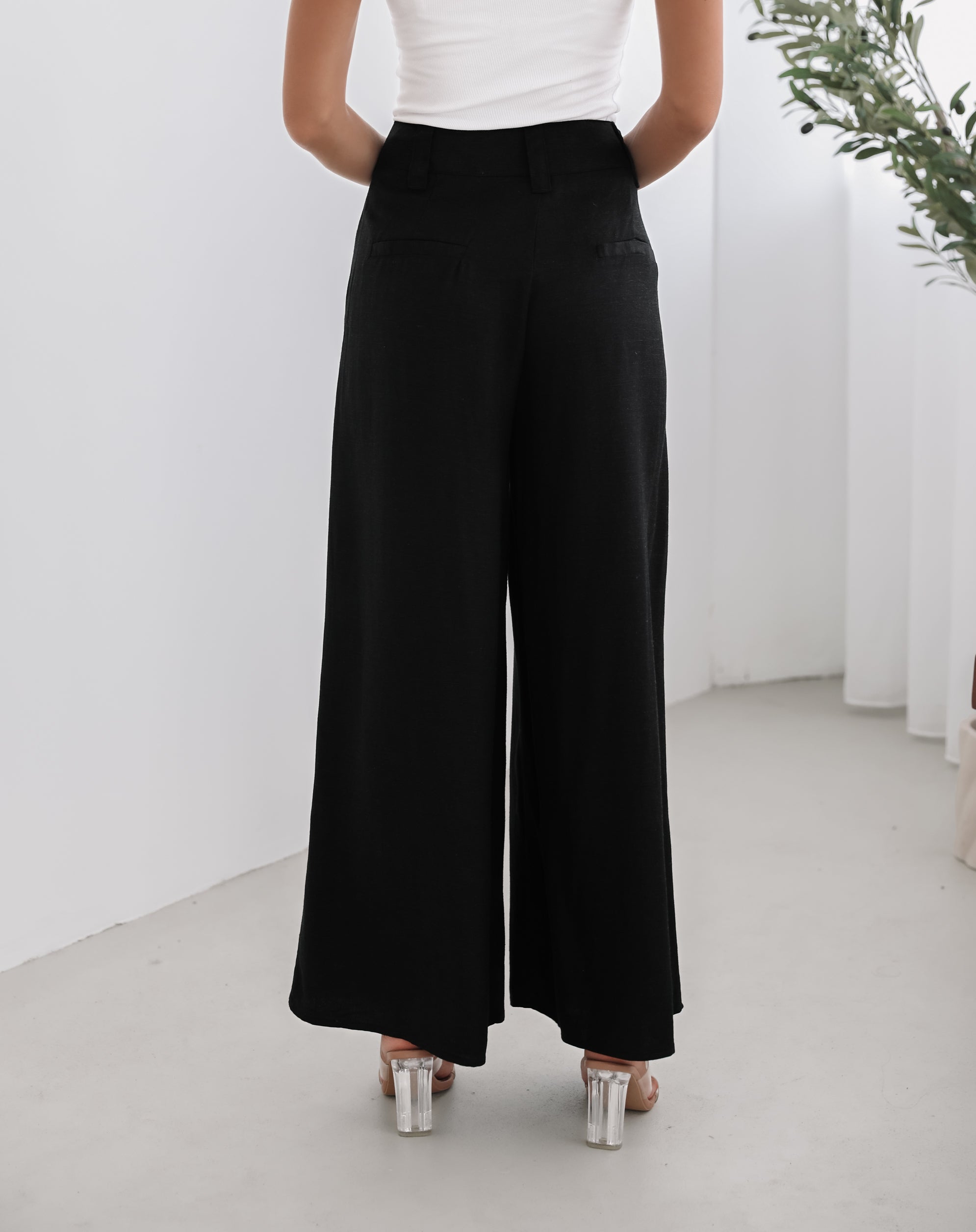 Our Alka Pants come in a black colour. A delicate look to make that subtle statement, this number is high waisted and features a button and zip closure, belt loops, side pockets, long length hem and wide leg fit. Style with a cami and flat sandals!