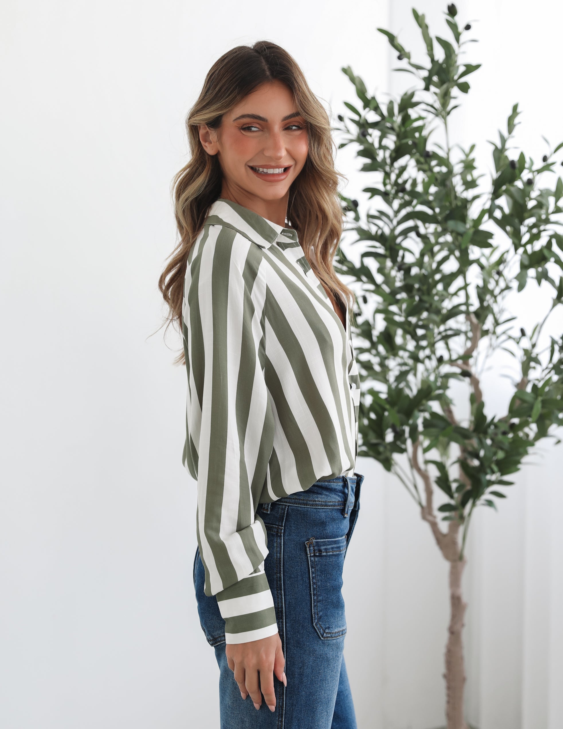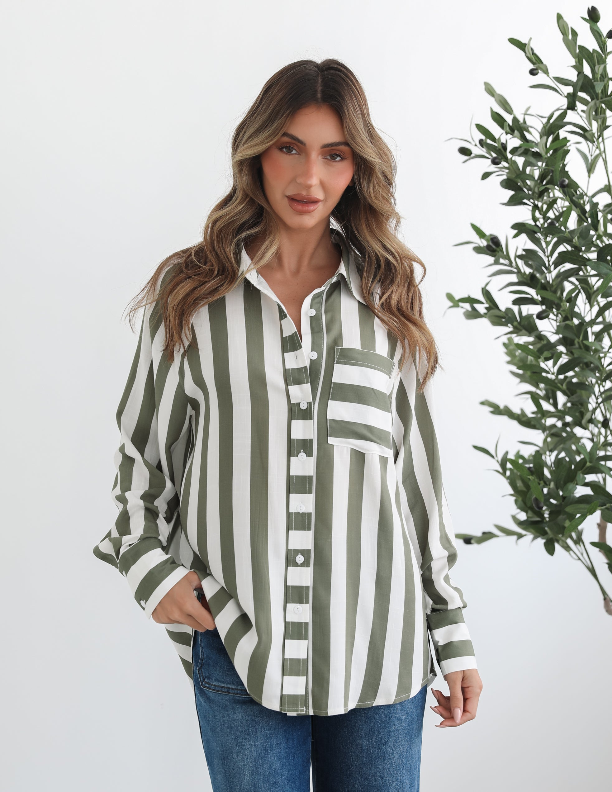 Our Alayah Shirt comes in green and white tones. Just as suited for work as it is for play, this top features a classic collar, centre-front buttons, long sleeves and bust pocket. Style it unbuttoned over a ribbed tank and distressed jeans for an off-duty look, or wear it tucked into high-waisted wide-leg pants with strappy sandals for modern sophistication!