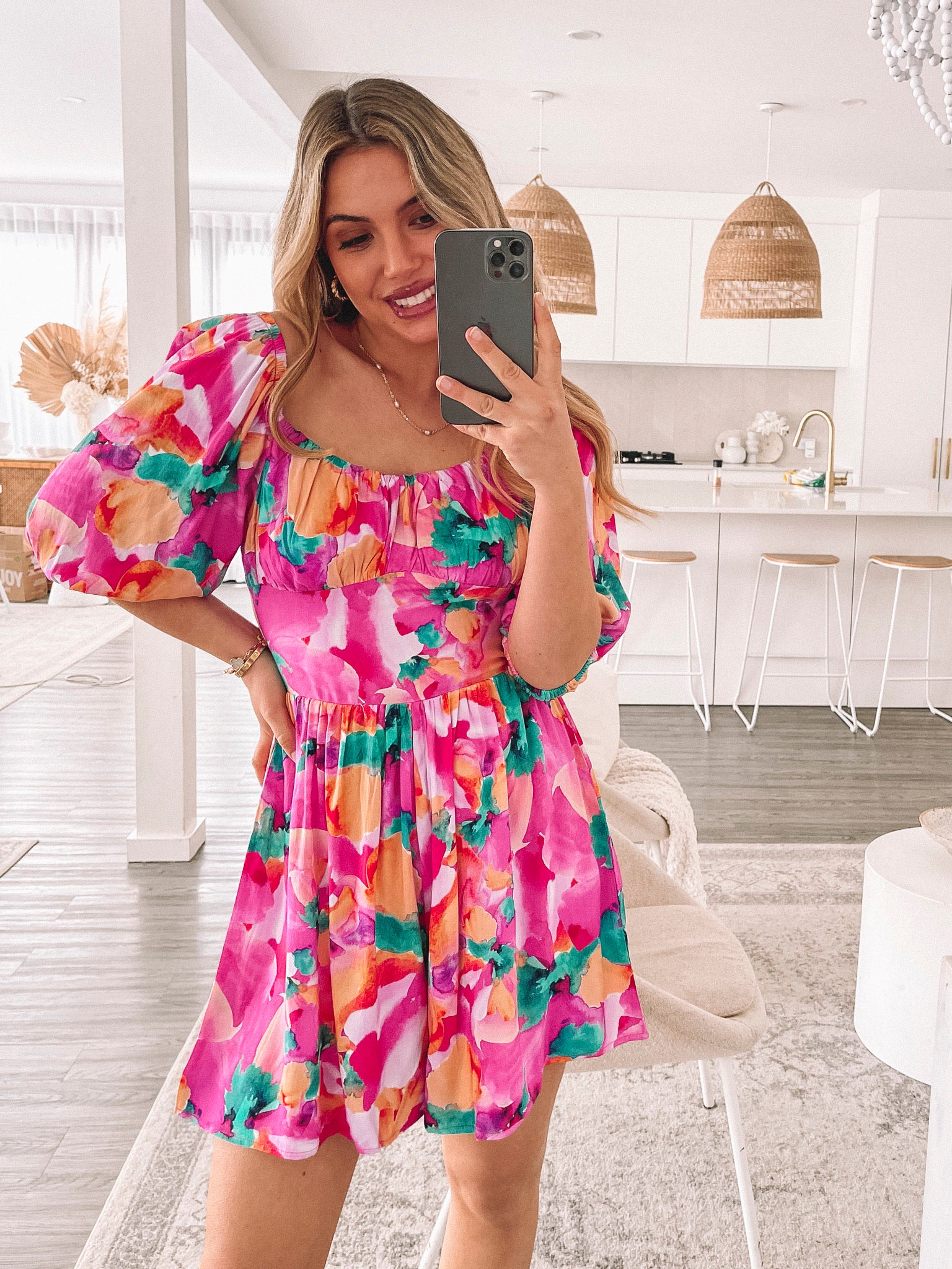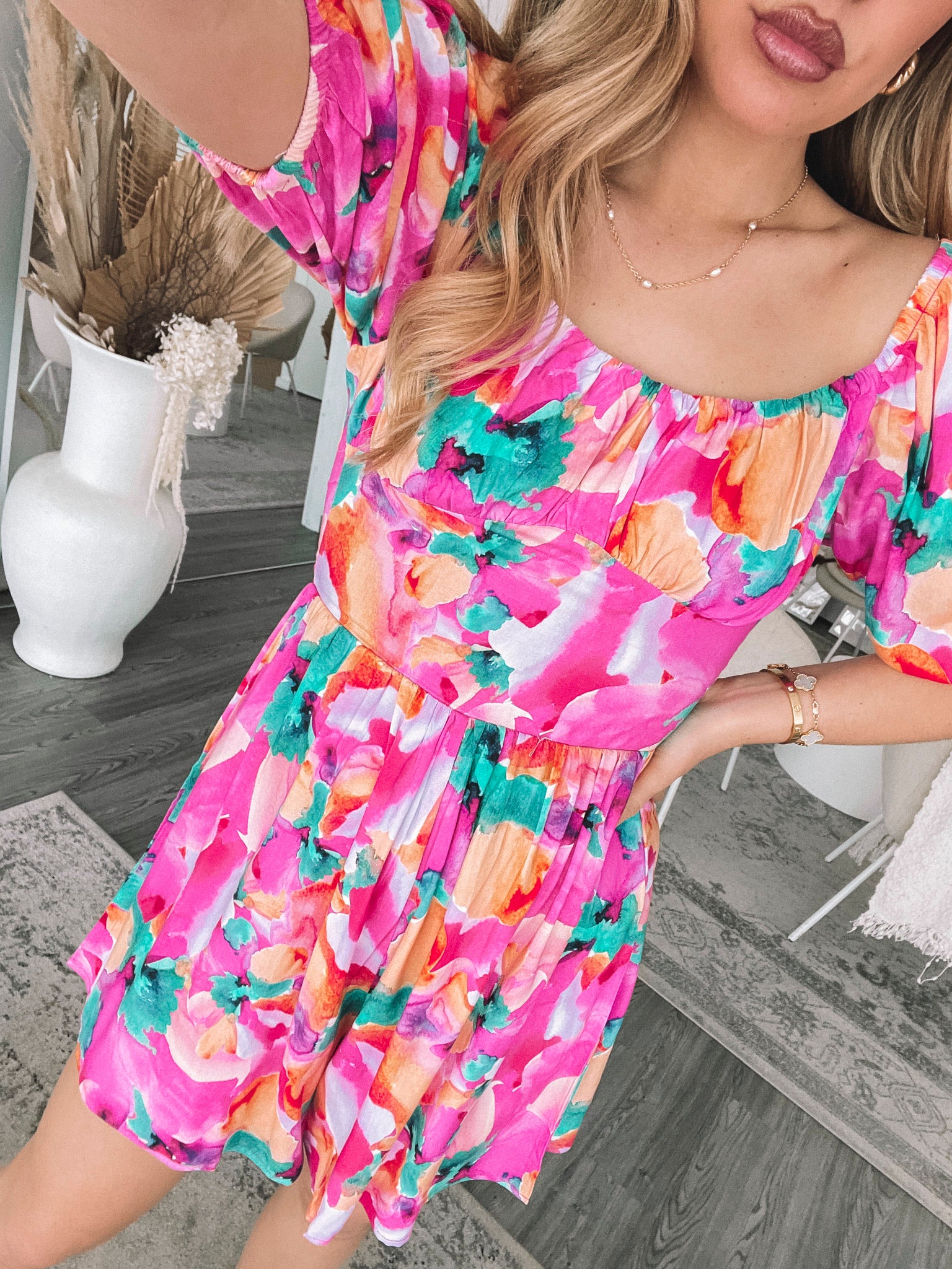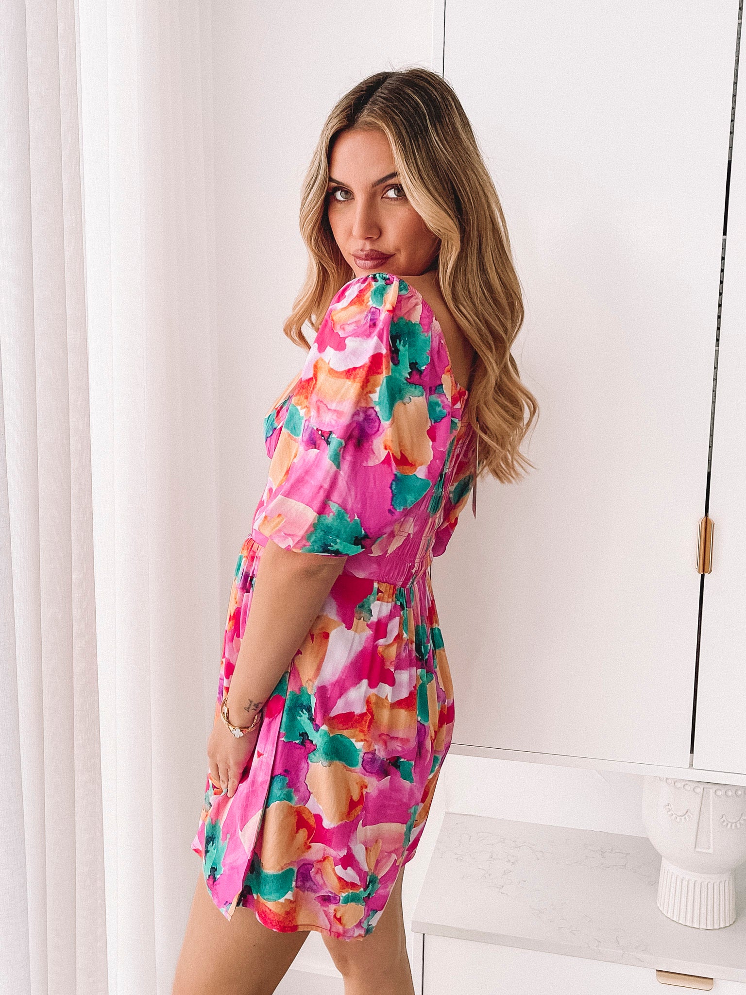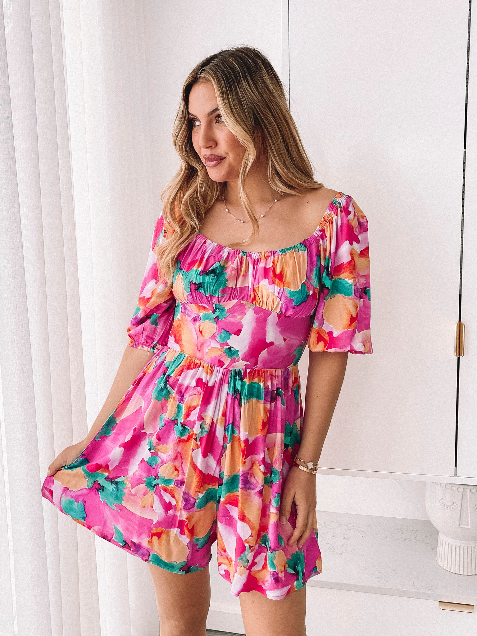 Our Carolana Dress comes in a pink fiesta print. Sporting all the style components needed for your next vacation, this piece is designed with a sweetheart neckline, short puff sleeves and thigh length shorts. Style with a straw bag and square sunglasses!