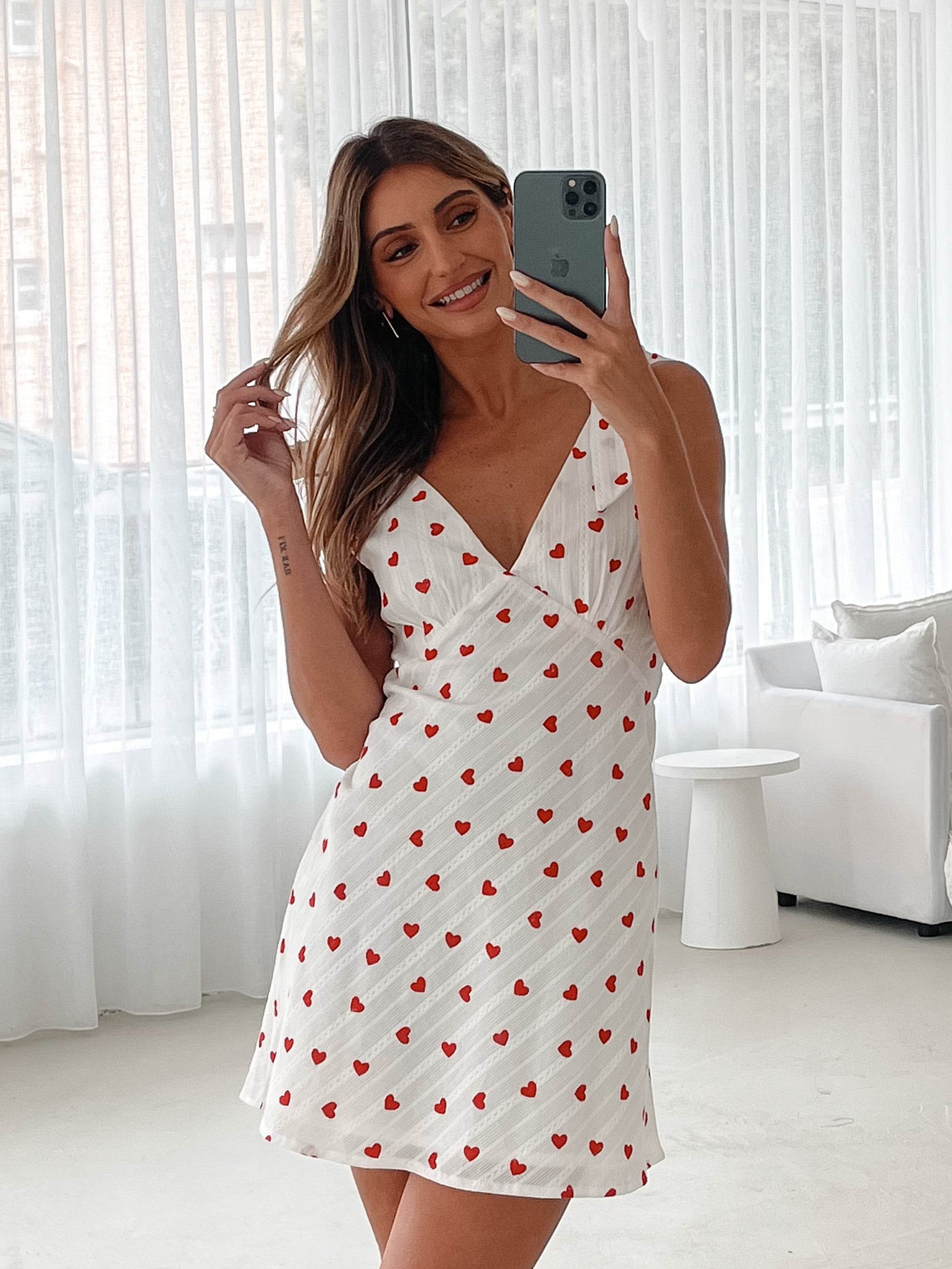 Our Carolyn Dress comes in a white base with red heart prints. For occasions that call for a little extra love, this number is designed with tie straps, low v-neckline and mini length hem. Look sweet, stylish, and oh-so-charming with a headband with bow detailing!