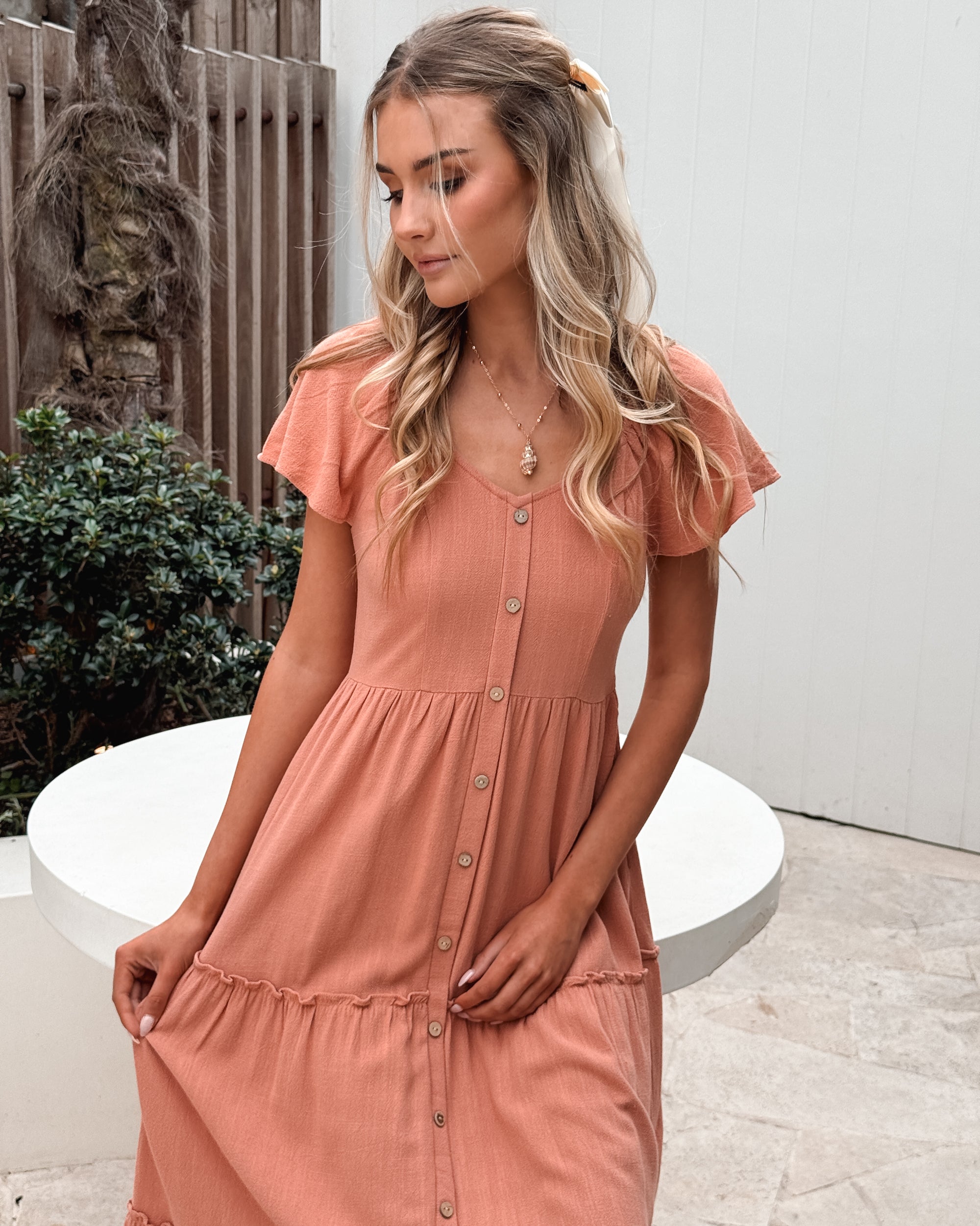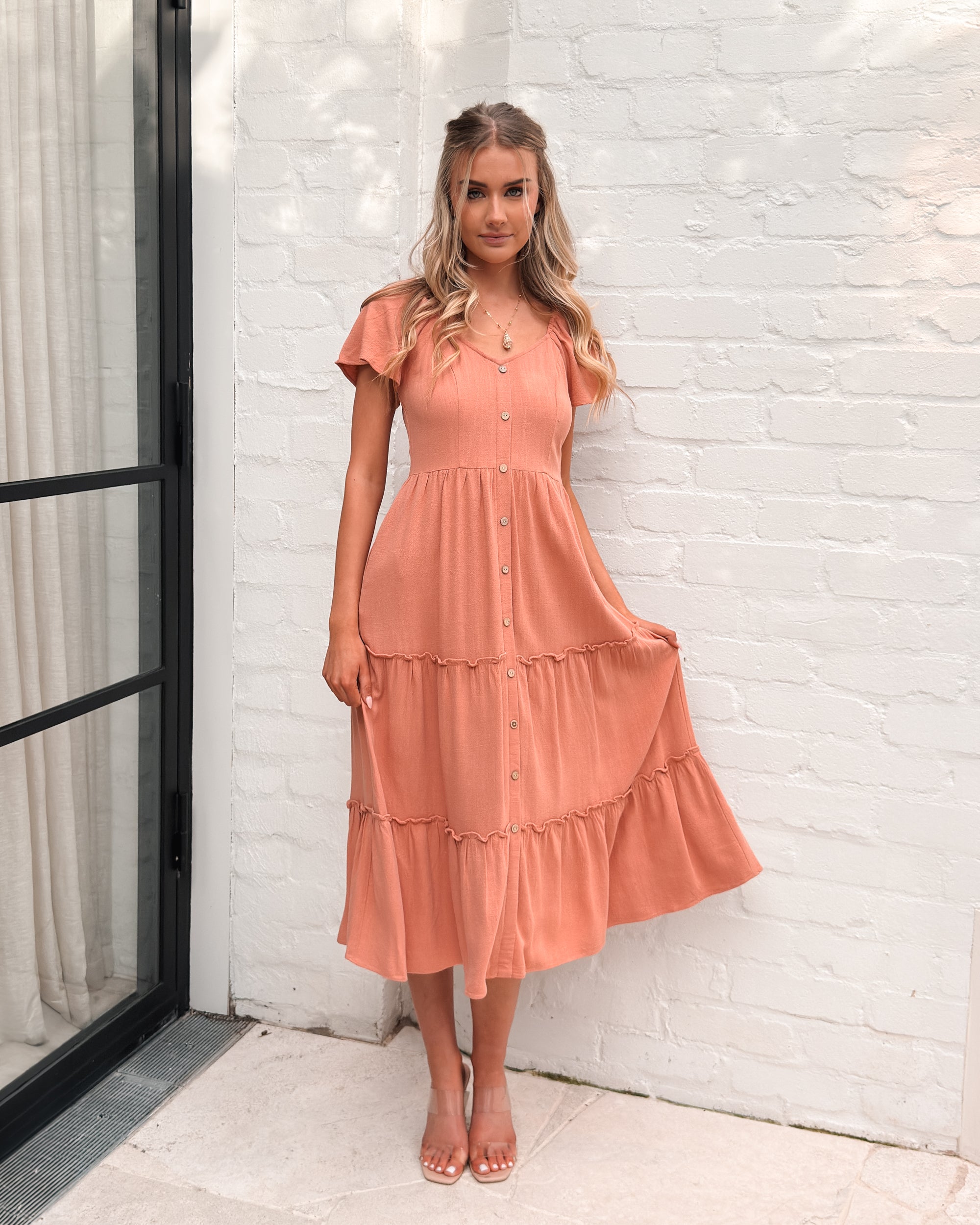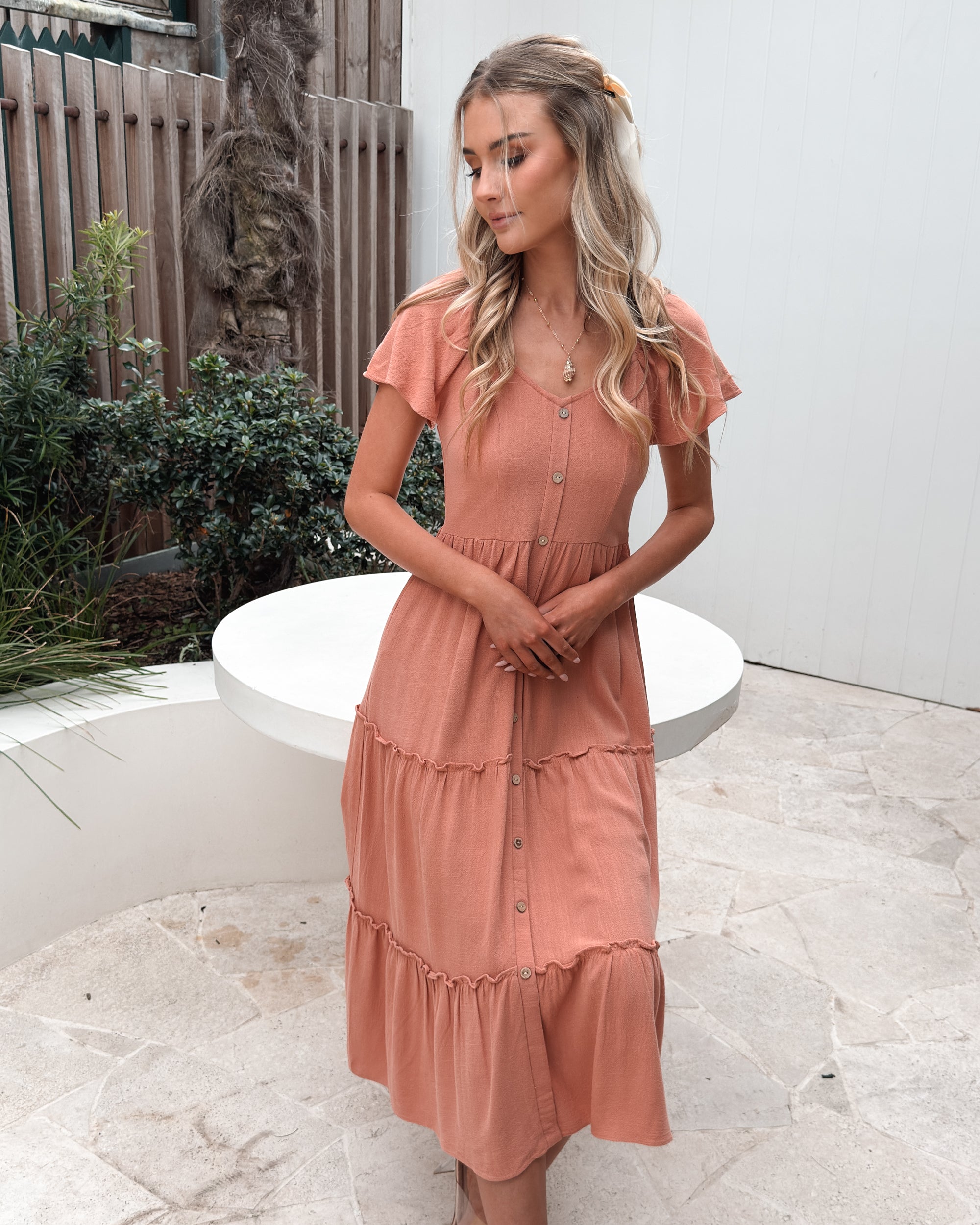 Our Celie Dress comes in a lovely faded rust tone. This relaxed midi features a soft V neckline, buttons down the front, elasticated shoulders, and frill detailing on the skirt. This breezy summer staple pairs beautifully with tan sandals and a sunhat.