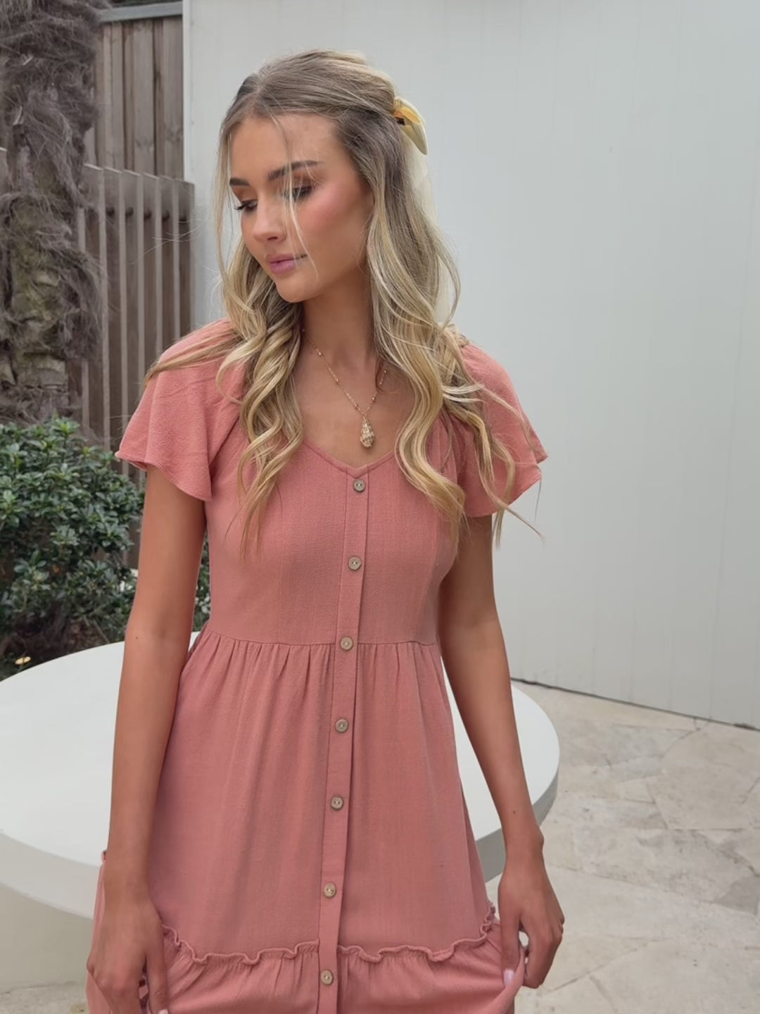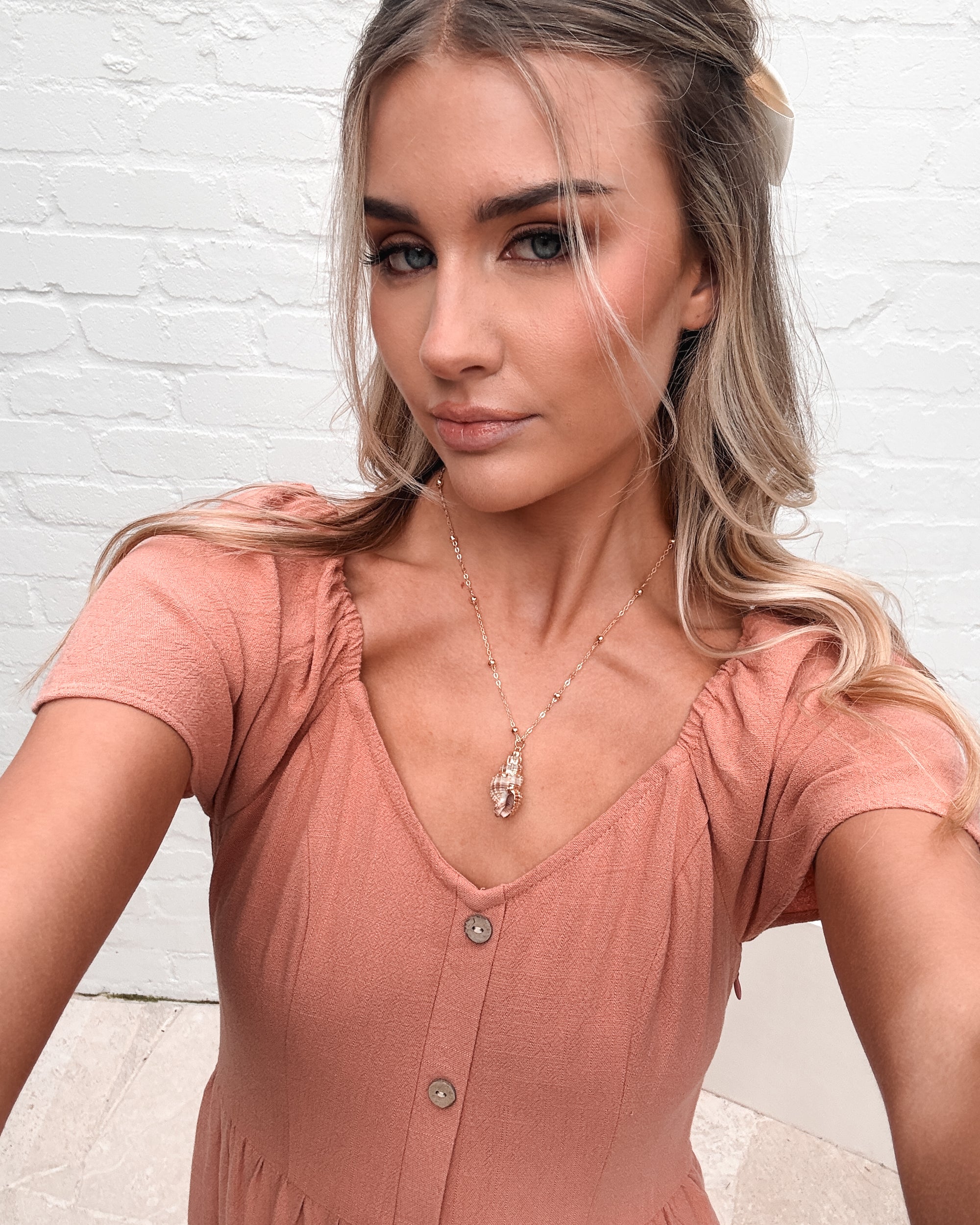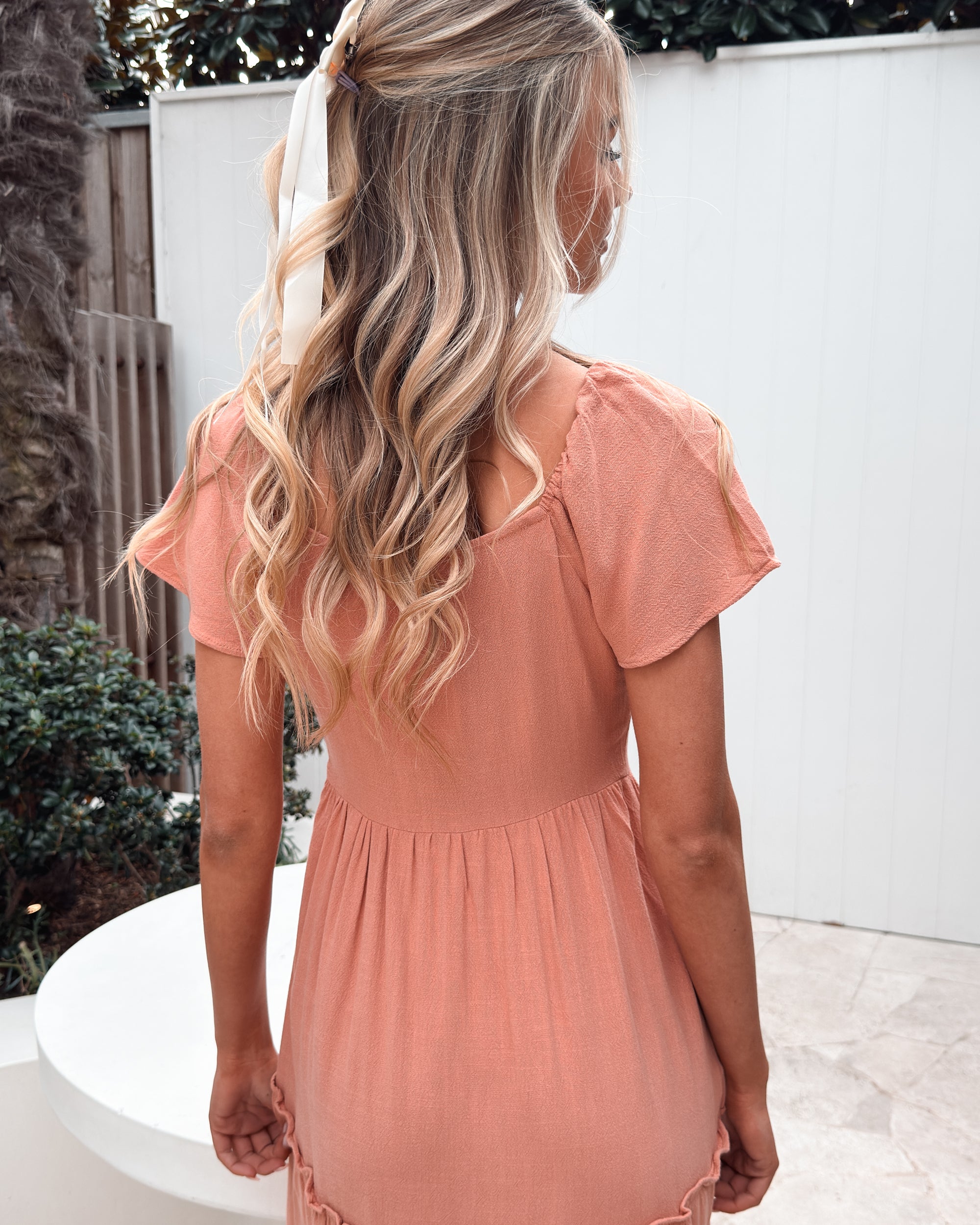 Our Celie Dress comes in a lovely faded rust tone. This relaxed midi features a soft V neckline, buttons down the front, elasticated shoulders, and frill detailing on the skirt. This breezy summer staple pairs beautifully with tan sandals and a sunhat.