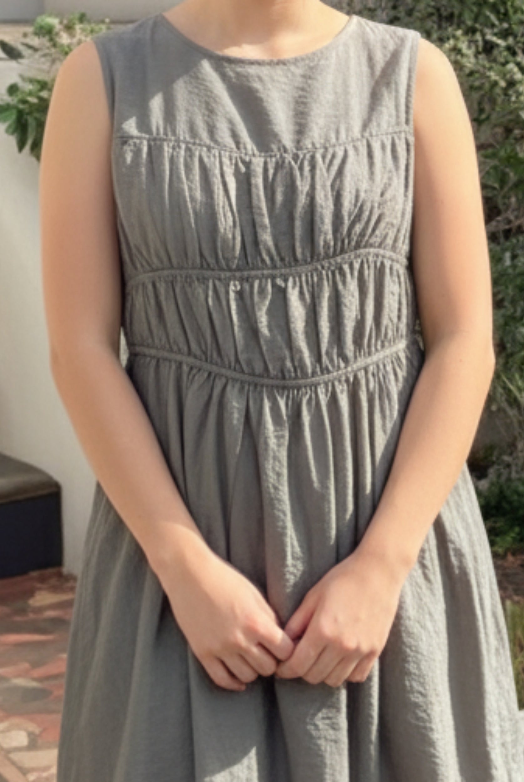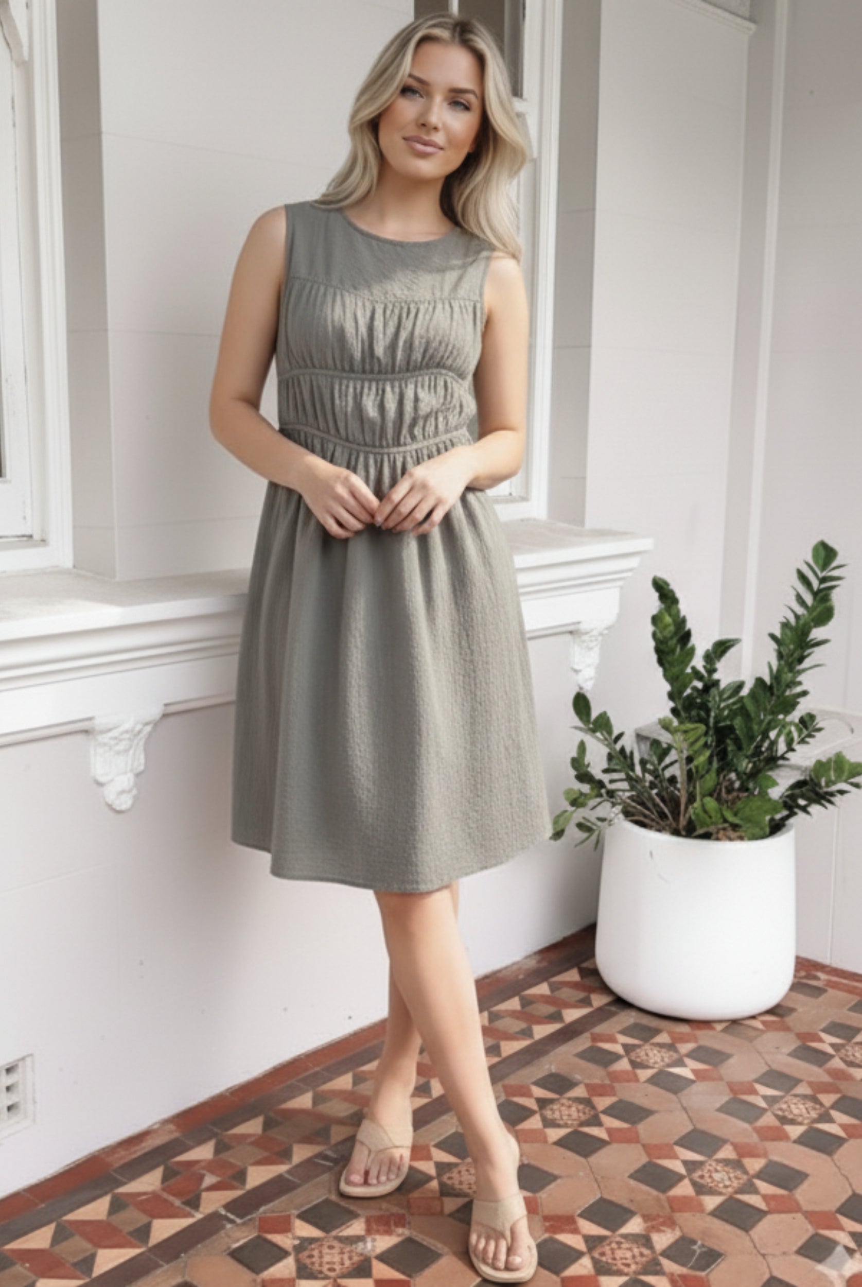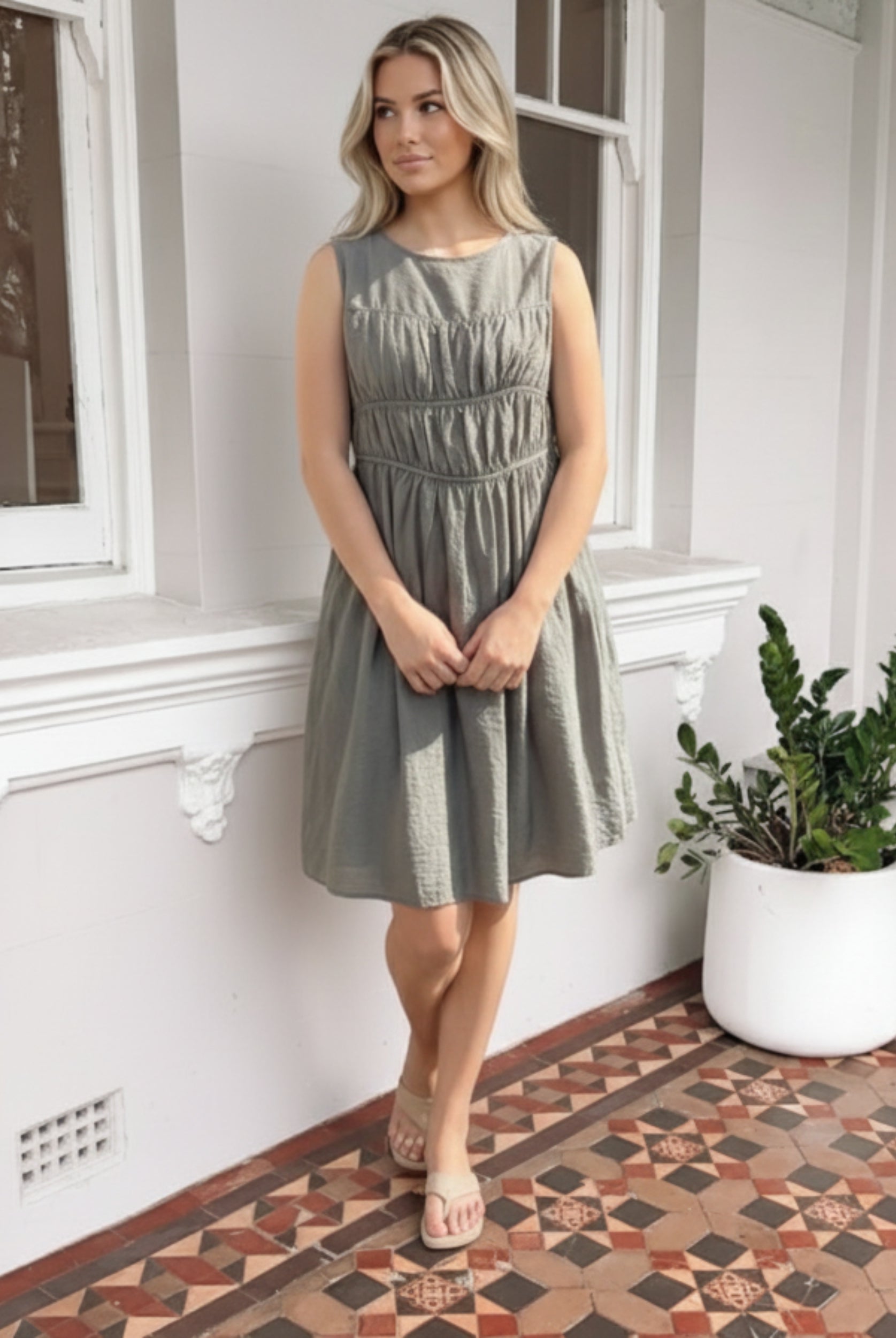 - Key Features: Midi length. Relaxed fit. Soft V neckline. Non-Functional Buttons on front. Elasticated shoulders. Frill detailing on skirt. Pockets in skirt. Maternity (bump) friendly.