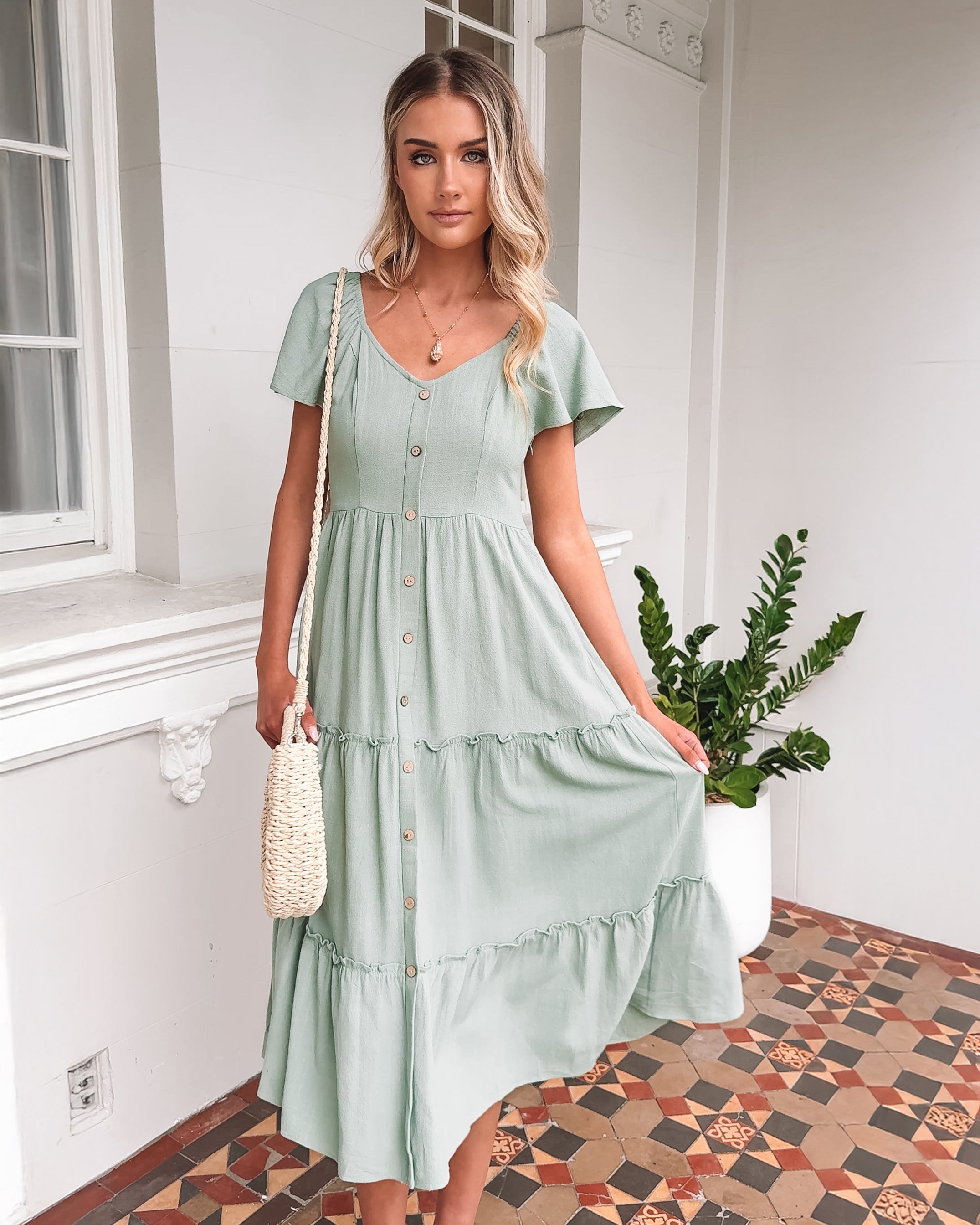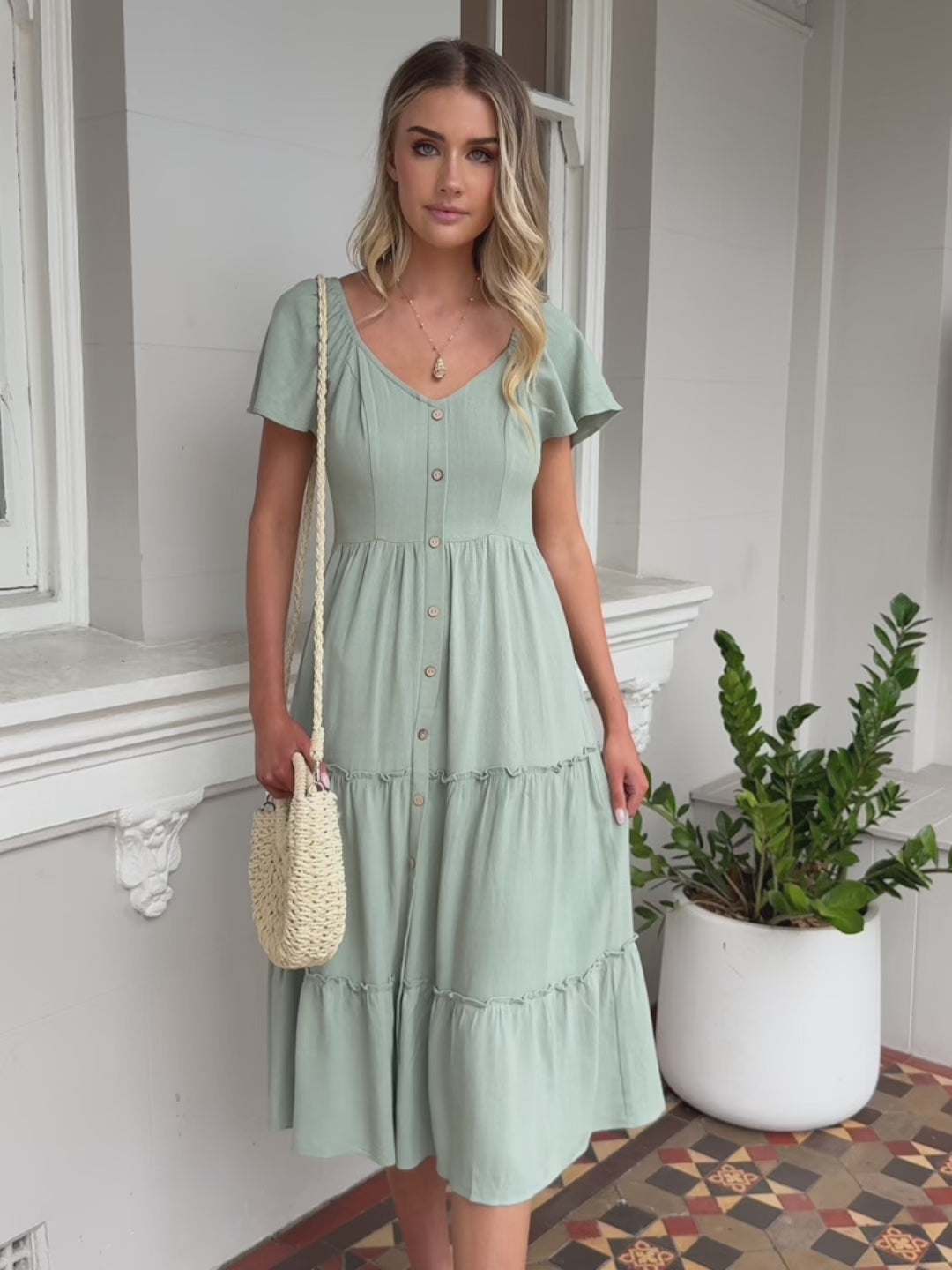 Our Celie Dress comes in a sage colour. This relaxed midi features a soft V neckline, buttons down the front, elasticated shoulders, and frill detailing on the skirt. This breezy summer staple pairs beautifully with tan sandals and a sunhat.