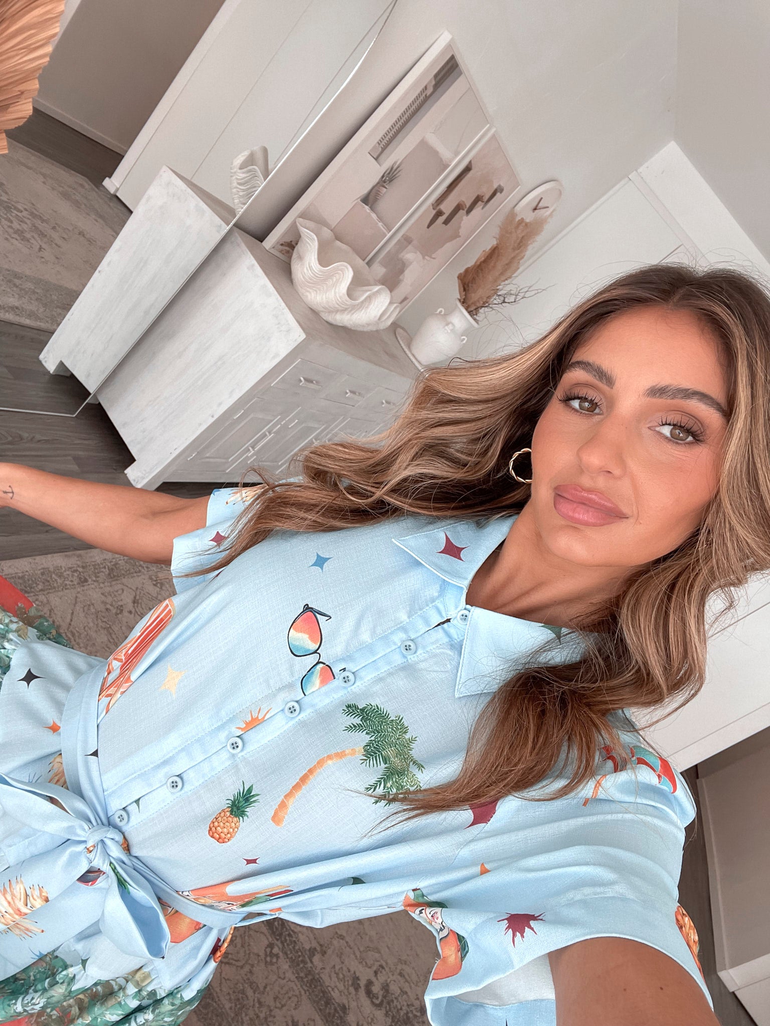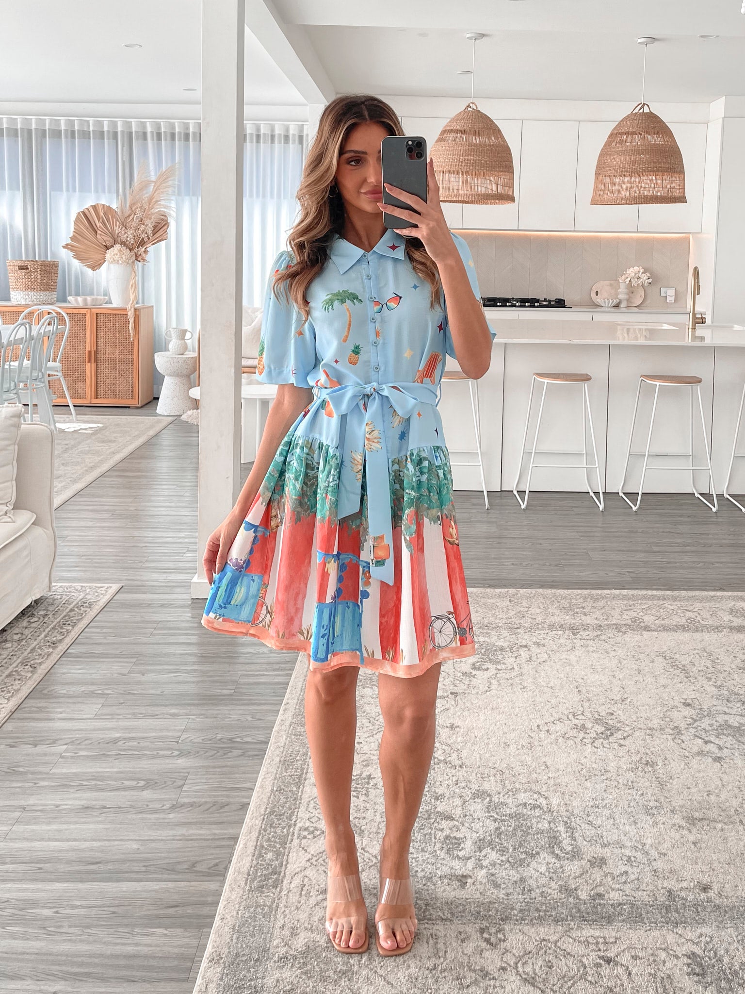 Our Dakoda Dress comes in a beautiful blue base with multicoloured prints. Bursting with fun patterns and boundless charm, this staple features a shirt collar, centre-front buttons, short sleeves, waist tie, a-line skirt and mini length hem. Pair it with a unique bag for when you’re feeling a little adventurous!
