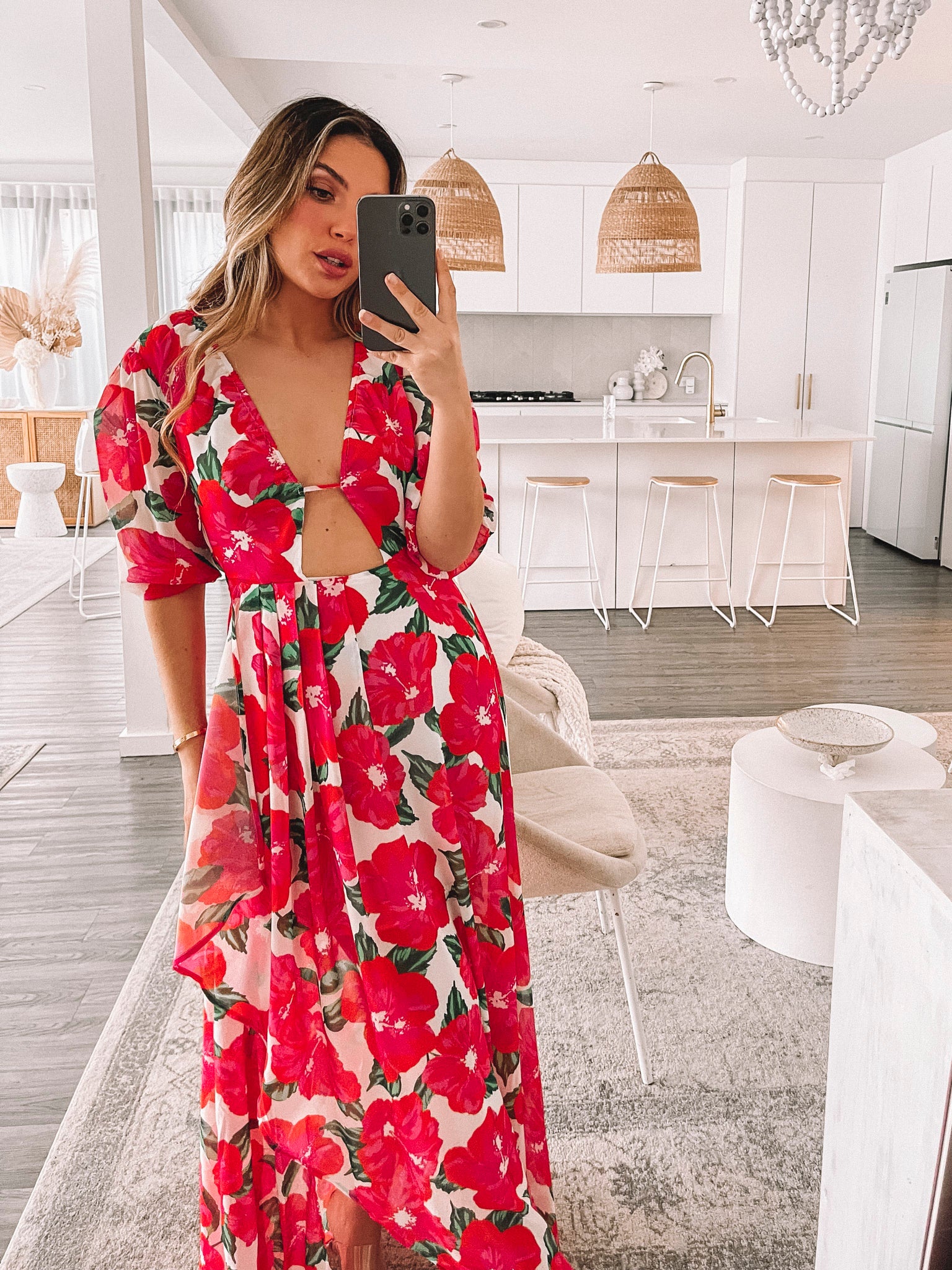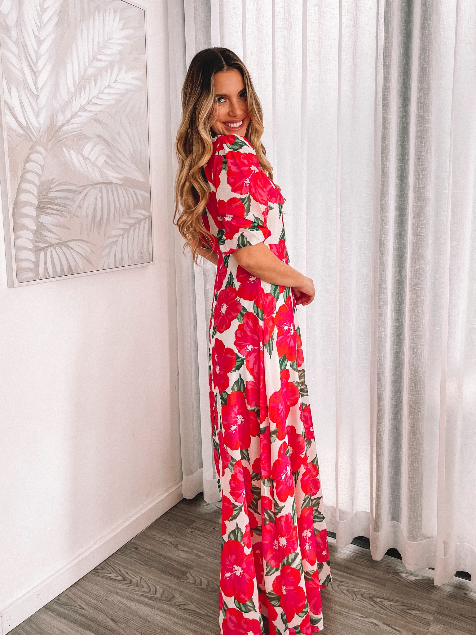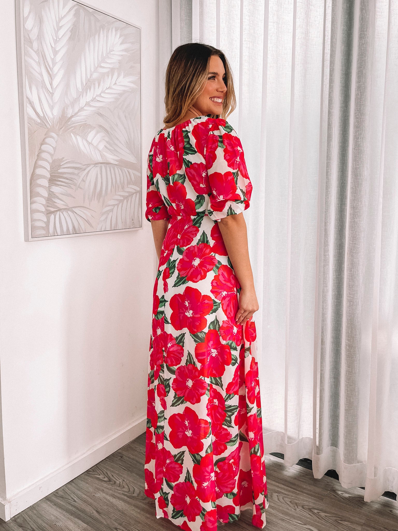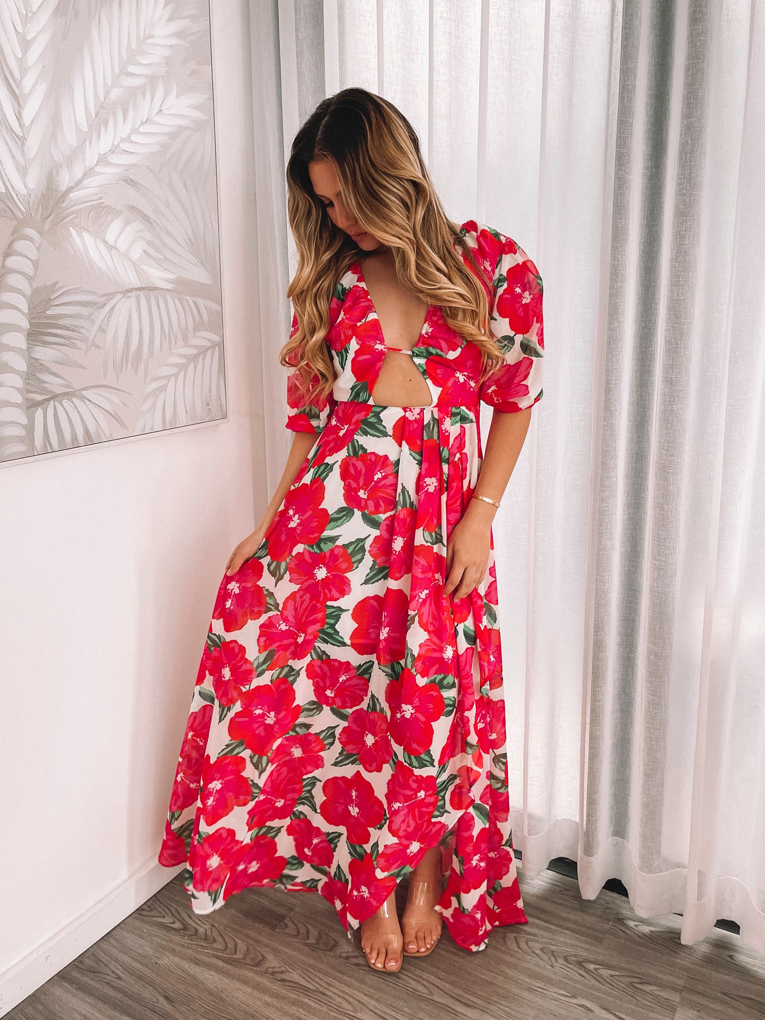 Our Delarina Dress comes in a white base with floral prints in pink colour. A feminine charm for your summer festivities, this maxi is designed with a v-neckline, cut out on the waist, puff sleeves and a-line skirt with a  slit. Style with gladiator heels!