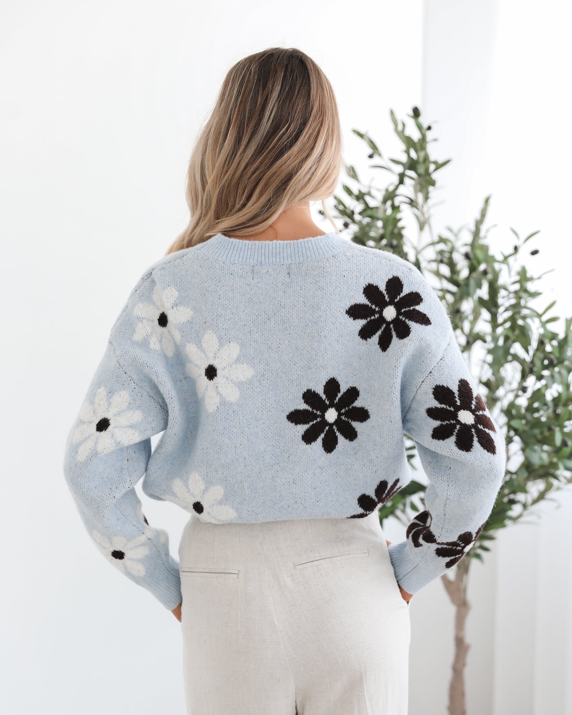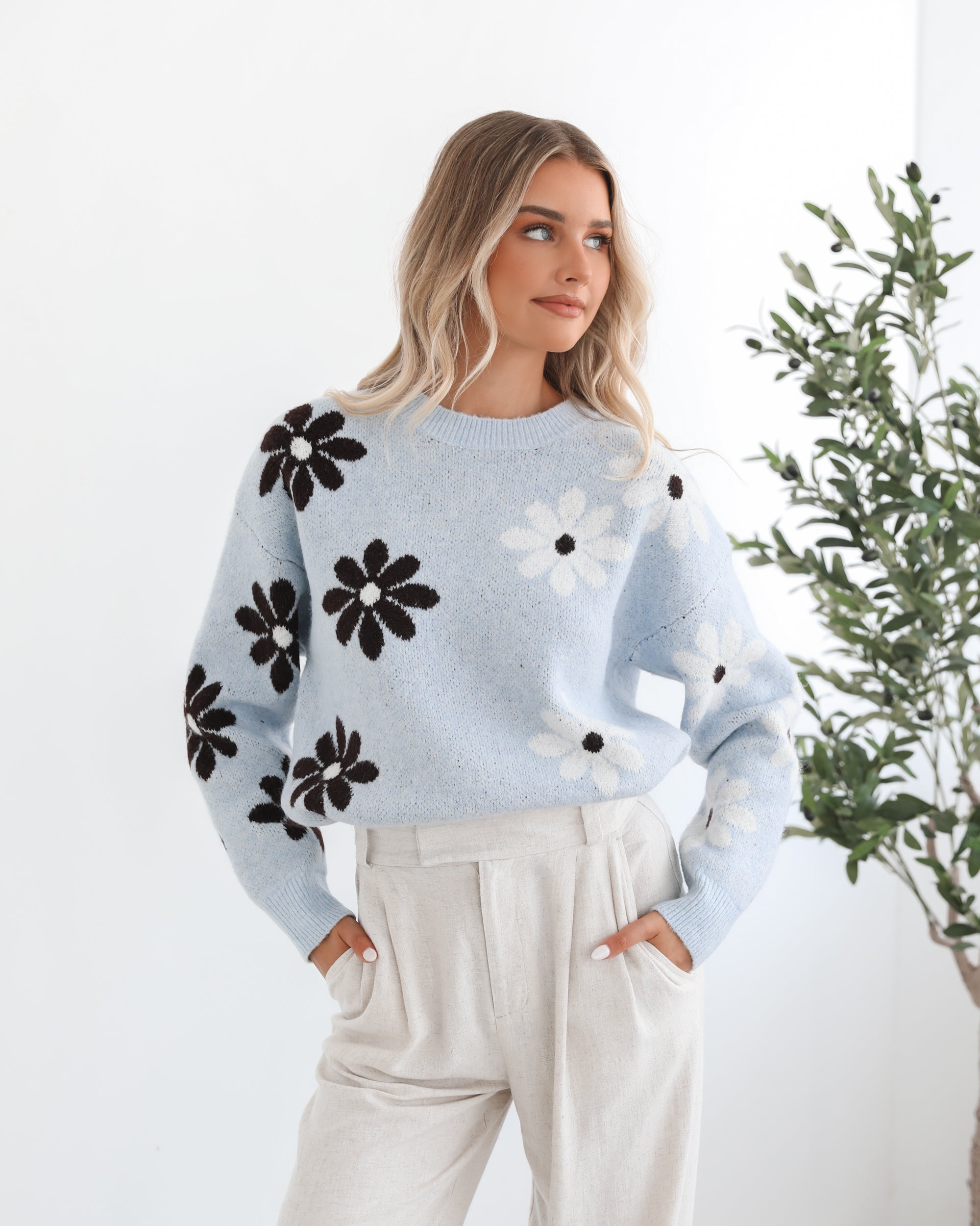 Our Edeline Knit comes in shades of blue, black and white. Enjoy a quiet evening at home in this comfy top that features a round neckline, long sleeves, floral prints and relaxed fit. For ultimate cosiness, pair it with soft lounge pants and fuzzy slippers!