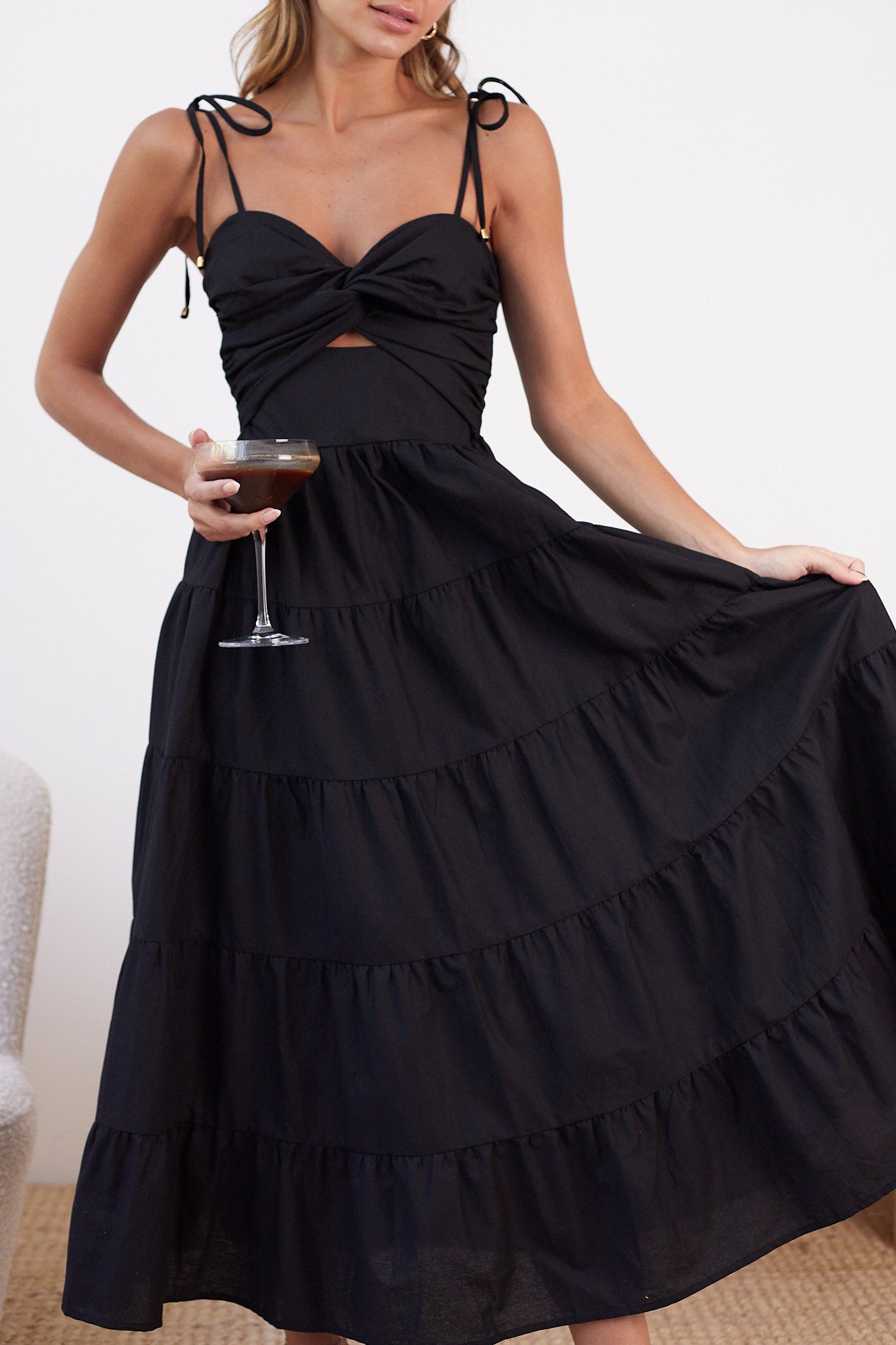 • Key Features: Sweetheart neckline. Adjustable straps. Twisted bust. Cut out above waist. Tiered skirt. Maxi length.