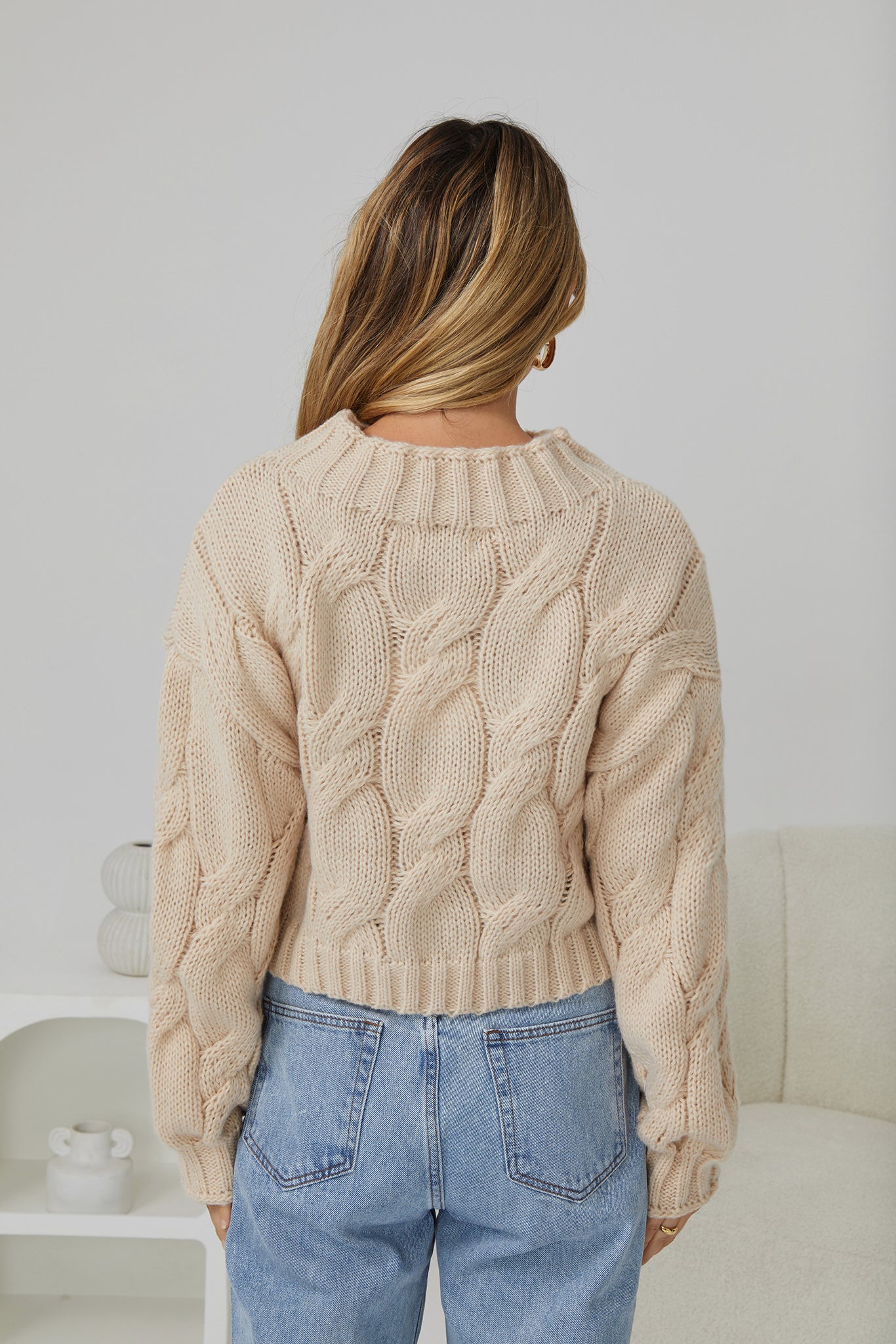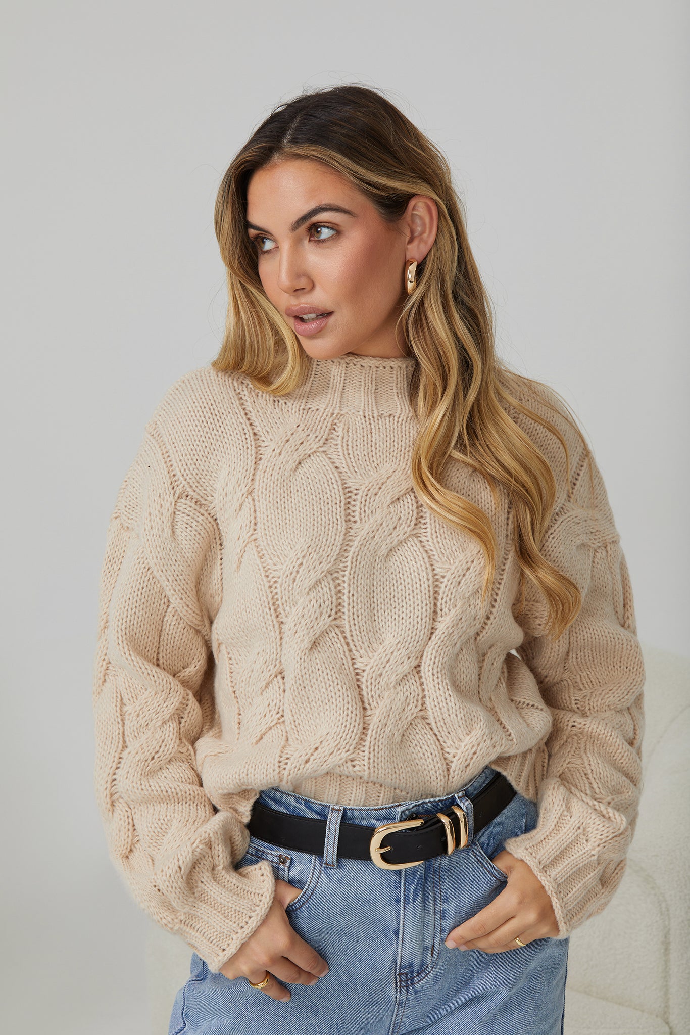 Our Hadi Knit comes in a beige colour. Make everyone in awe with this captivating knit that features a high round neckline, long extended sleeves, relaxed fit and textured fabric. Look perfect for your comfy casual look with a pair of straight jeans!