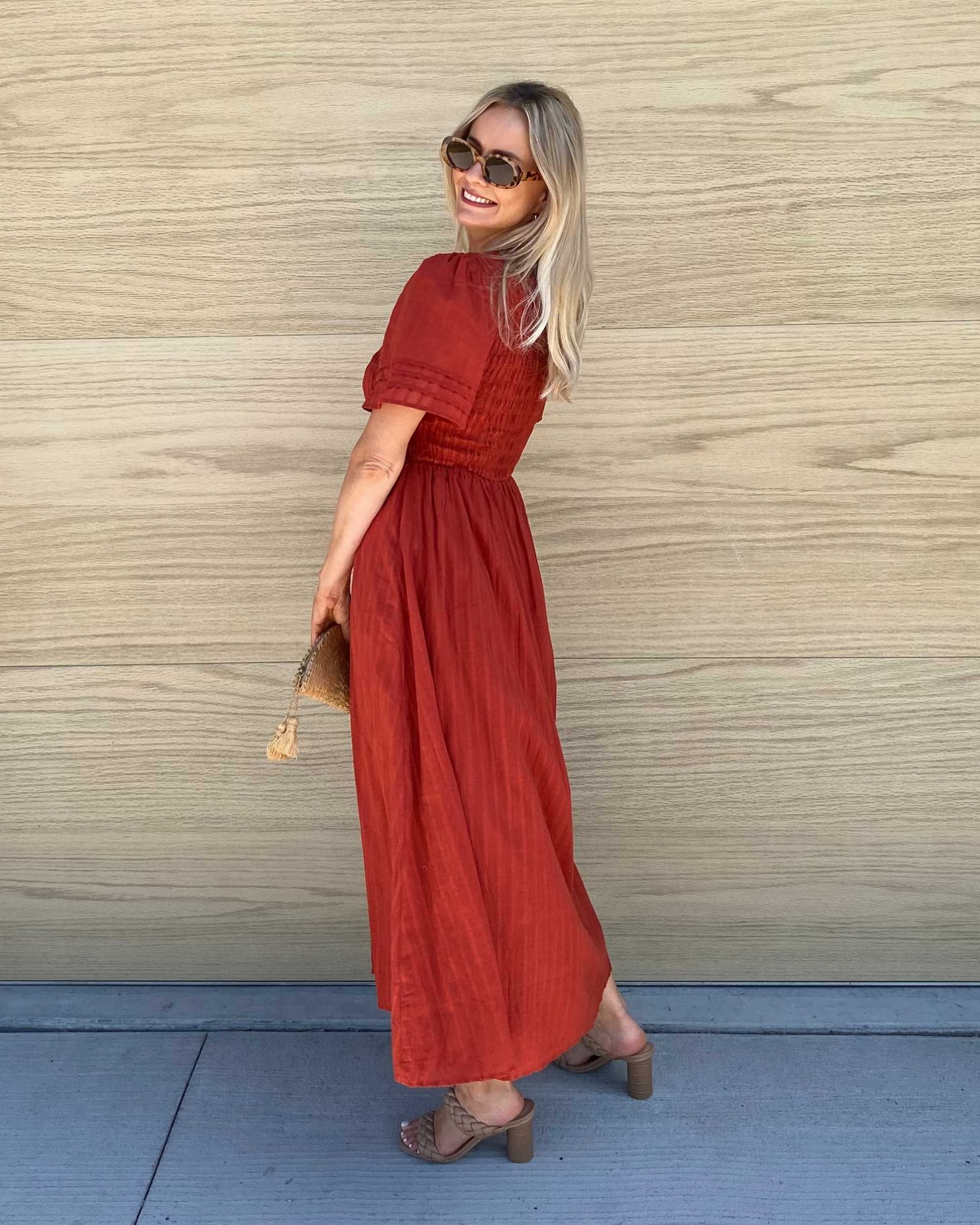 Our Iolana Dress comes in a rust colour. It features a round neckline, short sleeves and a textured pattern across the chest. This stunning midi pairs wonderfully with boots or heels for a stunning formal look!